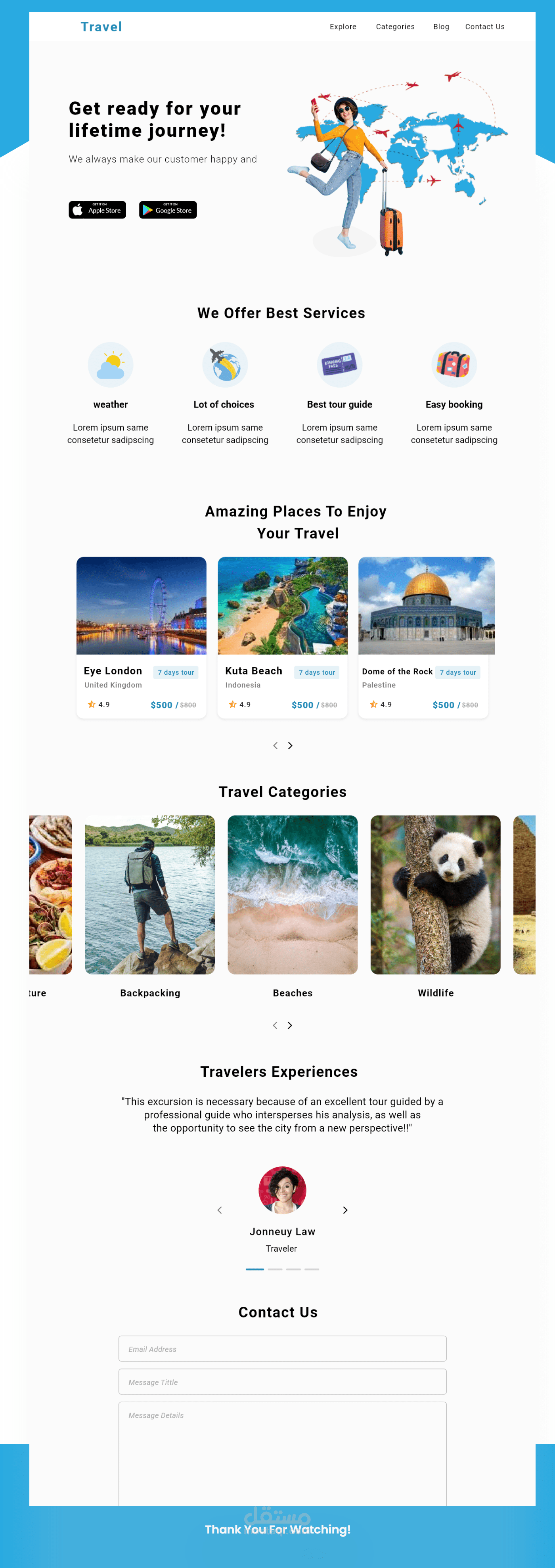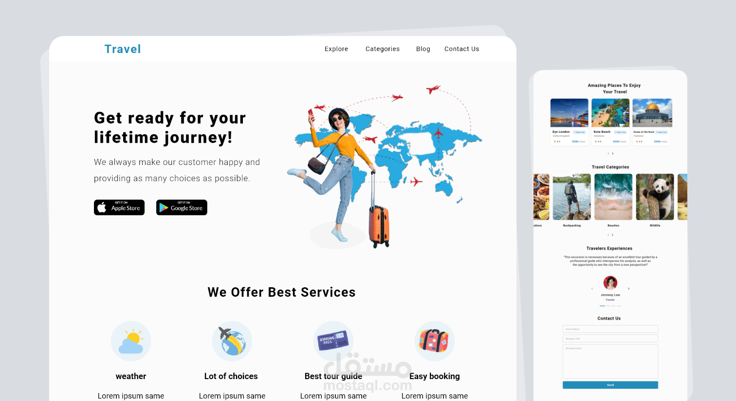 تصميم صفحة هبوط لتطبيق حجز رحلات سفر.