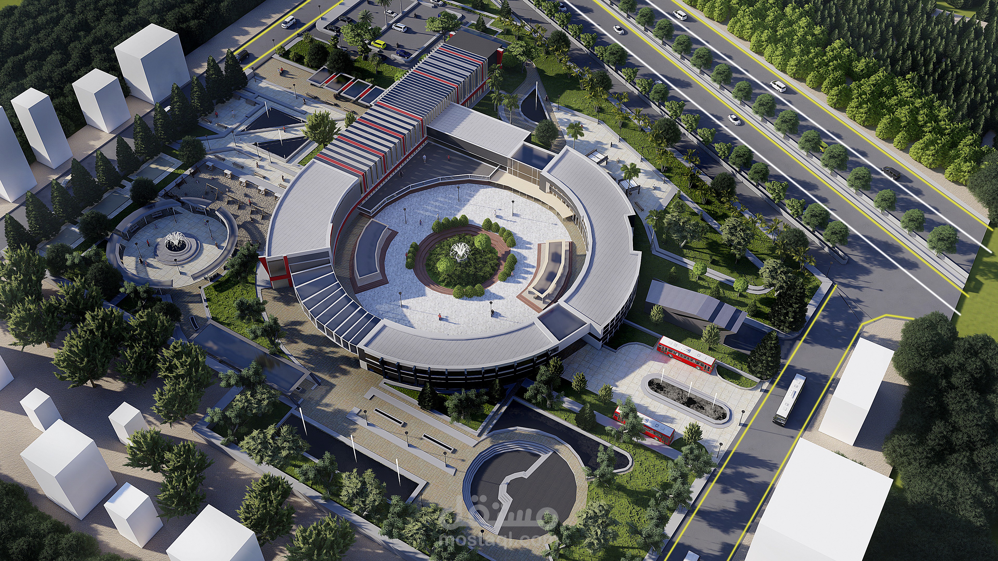 concept : اعتماد مبدأ الدائرة في التصميم لمراعاة وظيفة المبنى وتحقيق رؤية جيدة للفراغات التعايشية الداخلية للبناء