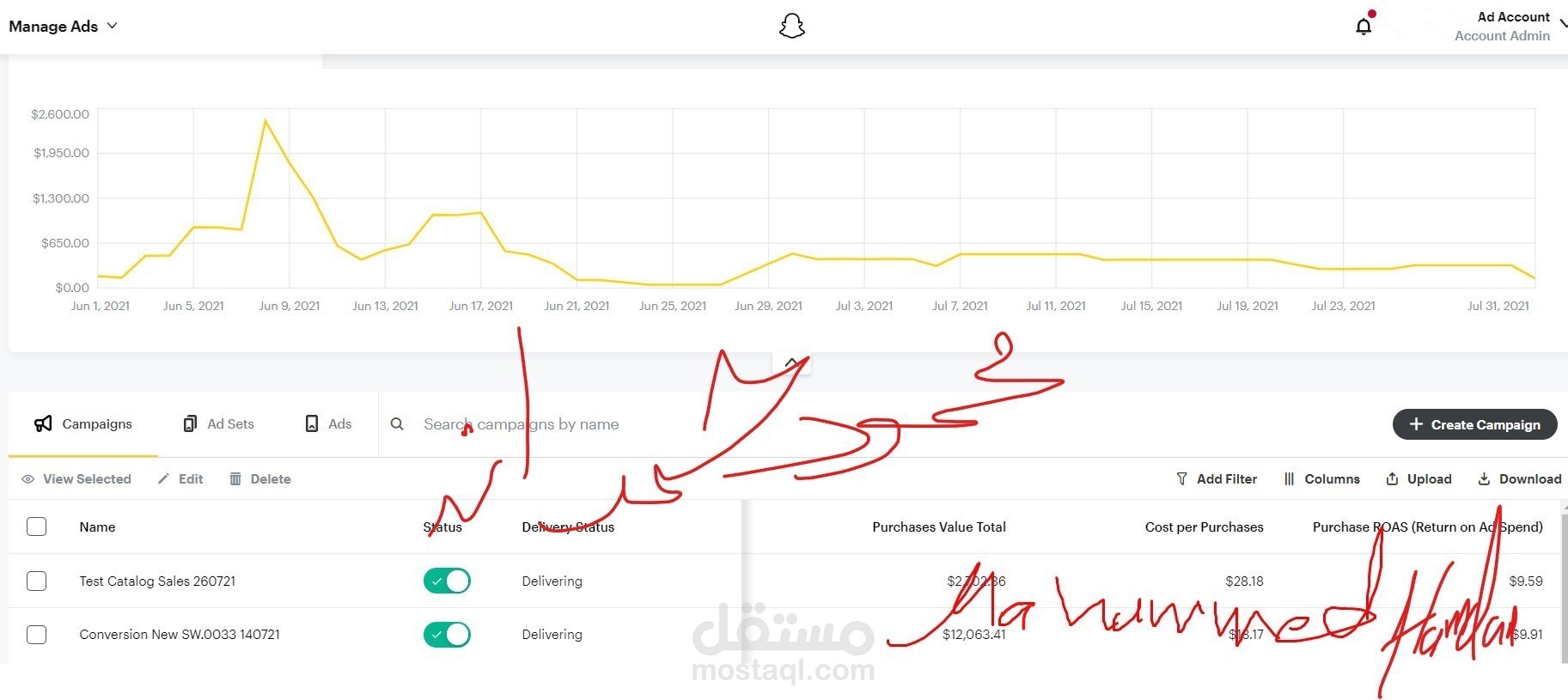 اطلاق حملة اعلانية على سناب شات snapchat بجميع اعداداتها باستهداف صحيح، من نوع conversion لتحقيق اكبر قدر ممكن من المبيعات حيث كانت نتائج الحملة كانت ممتازة. والعائد على المصروف الاعلاني ROAS وصل الى 9 أضعاف. بمعنى، عندما ننفق 1000ريال على الاعلانات فان قيم المبيعات على المتجر تصل الى 9000 ريال.
