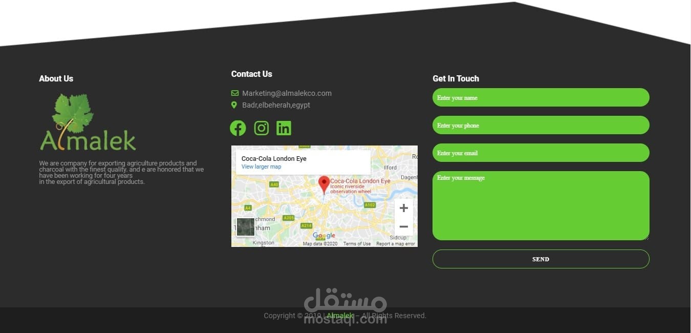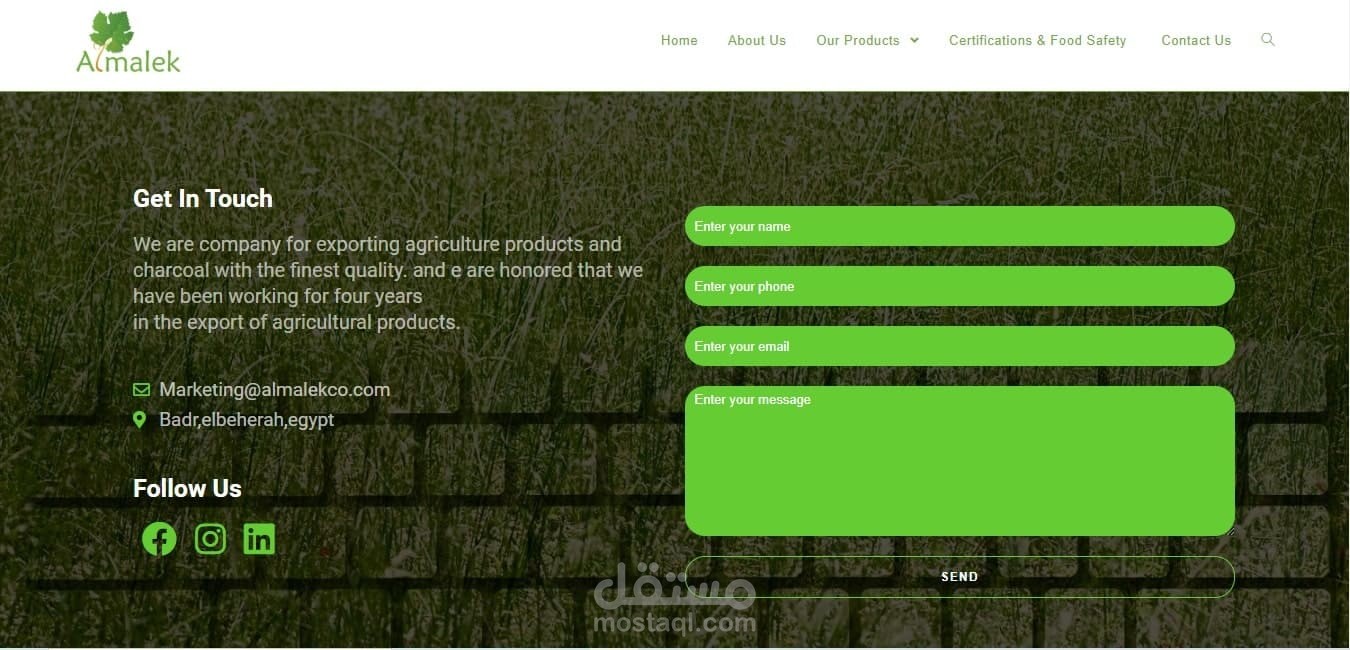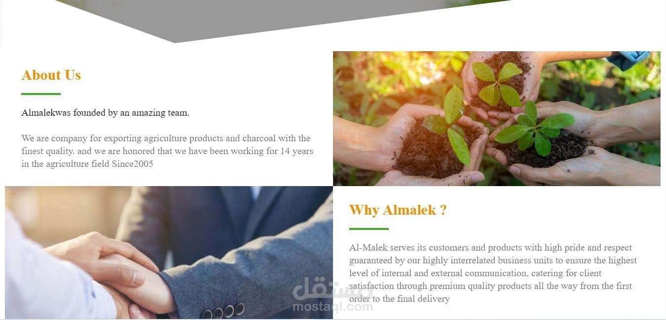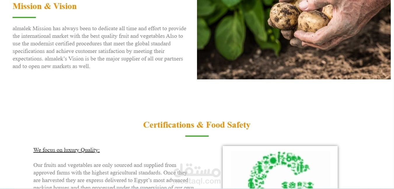 Almalek هي شركة تعمل في استراد و تصدير الفواكه و الخضروات, ارادوا موقع اليكتروني ليعرض الفواكه و الخضروات المتاحة في الوقت الحالي , بالاضافة الي ان يكون وجهة تعريفية للشركة , الموقع يحتوي علي: