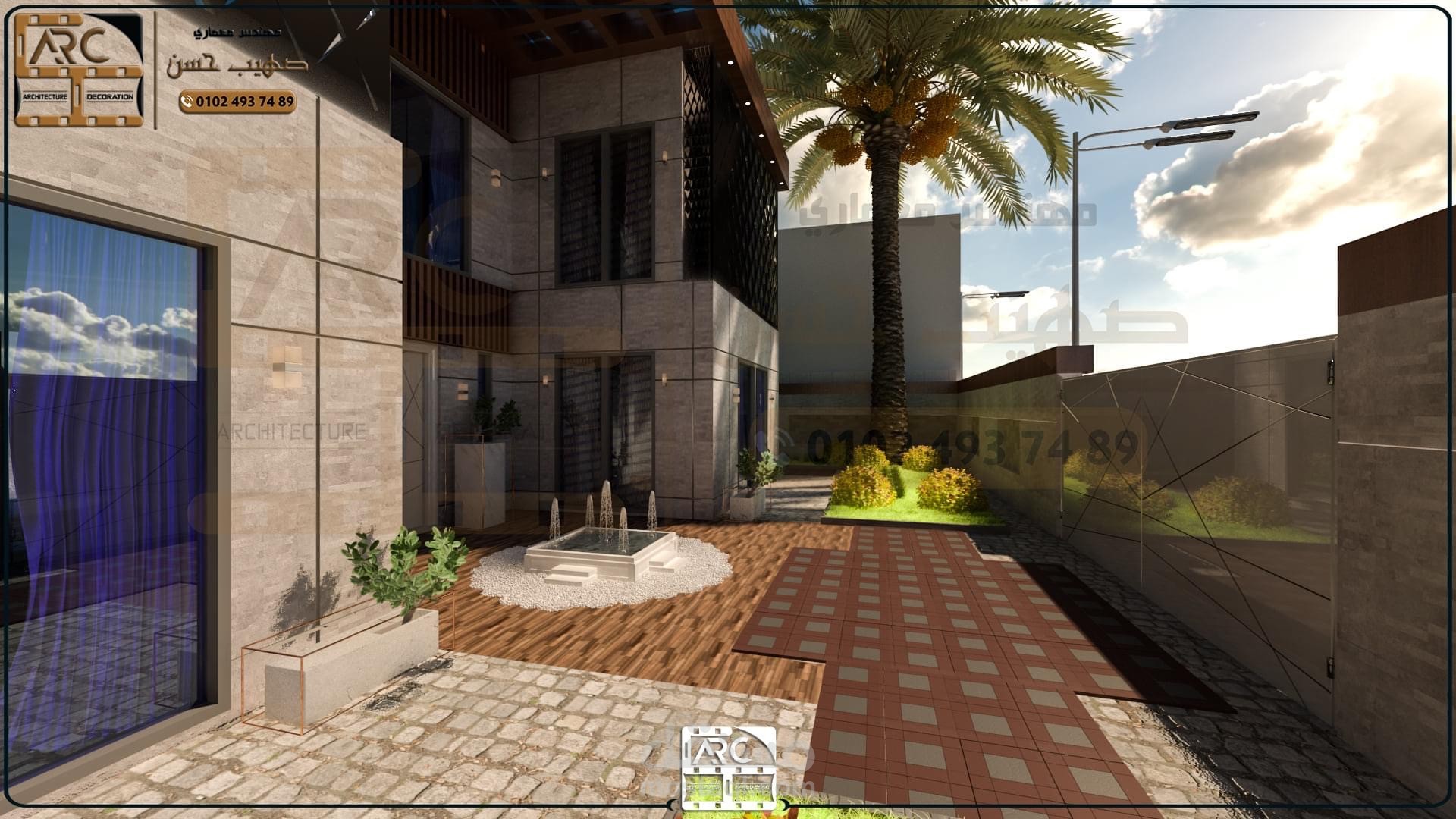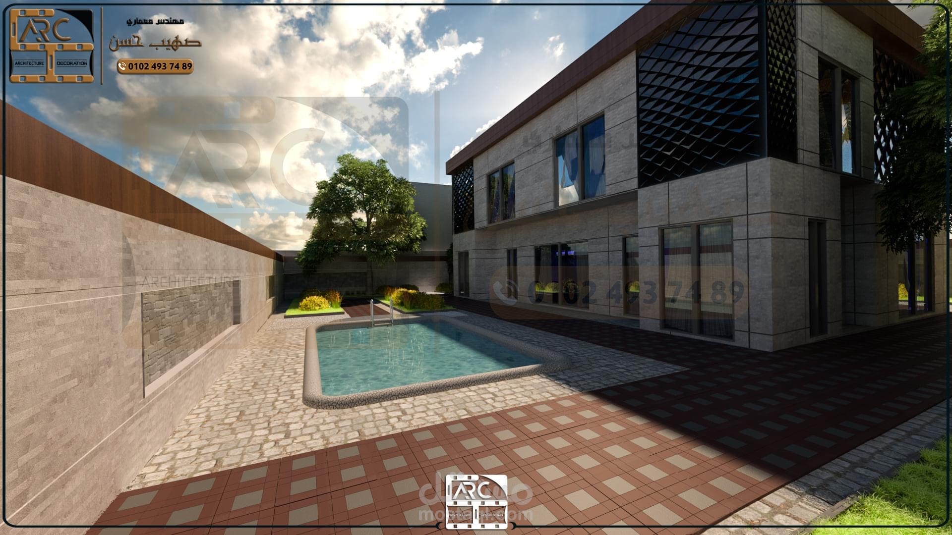 واجهات فيلا على الطراز الحديث بشمال الرياض بحمام سباحه ونافوره وتنسيق موقع