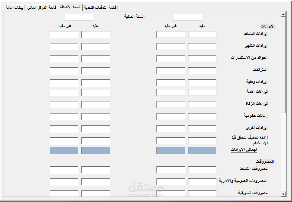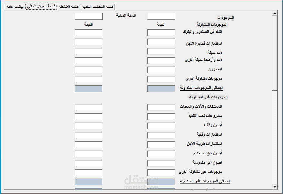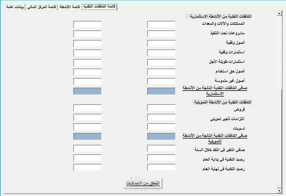 - اعداد يوزر فورم لادخال عدد من القوائم الماليه (قائمة المركز المالى - قائمة الانشطة - قائمة التدفقات النقدية) بعد مراجعة اجمالياتها و تساوى عناصرها مع اظهار msg box ب اخطاء الادخال