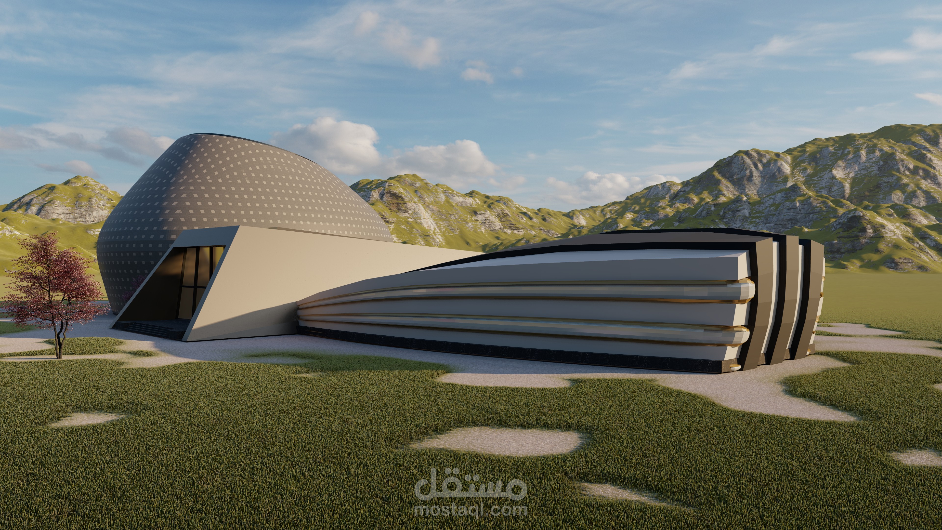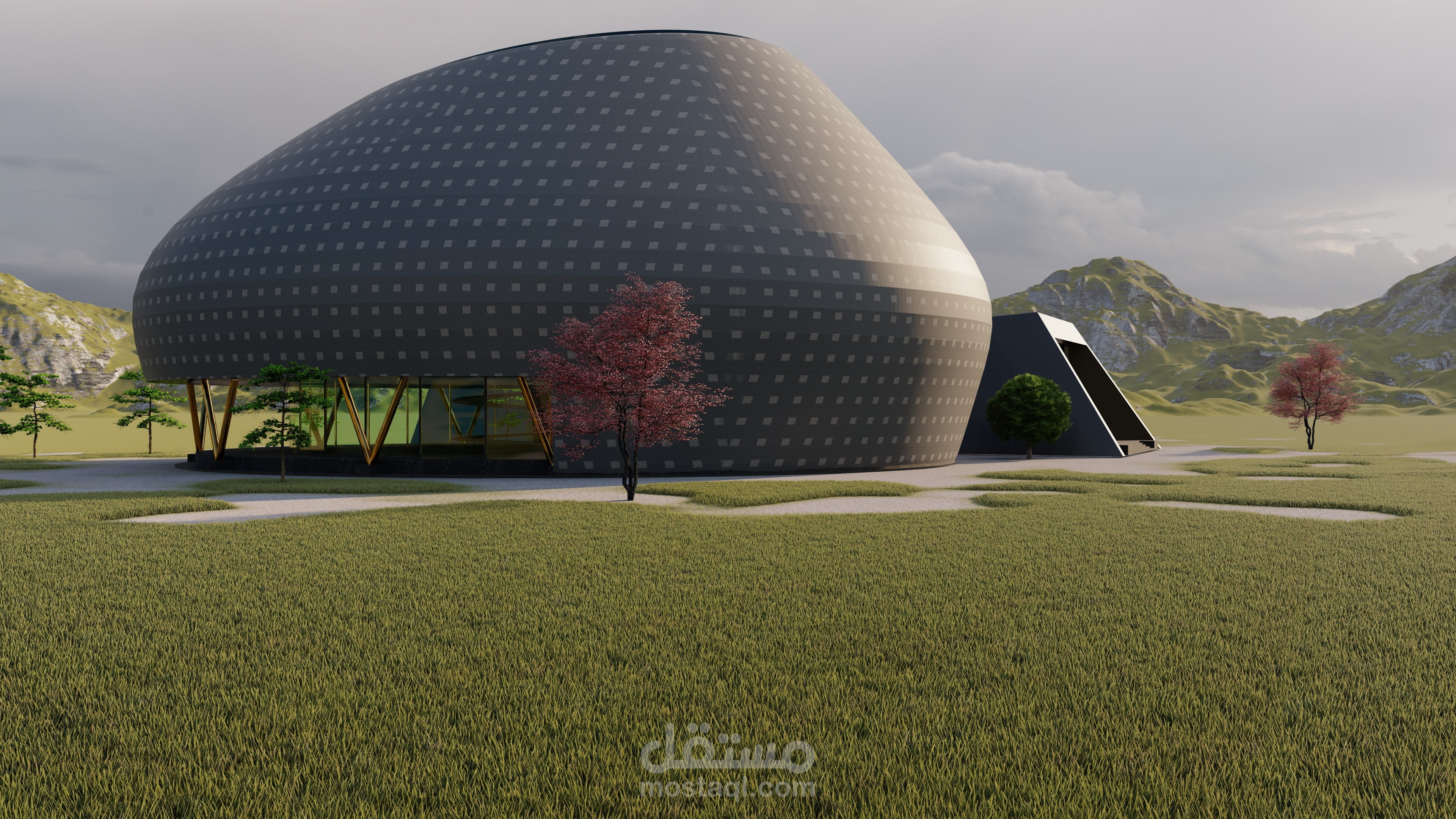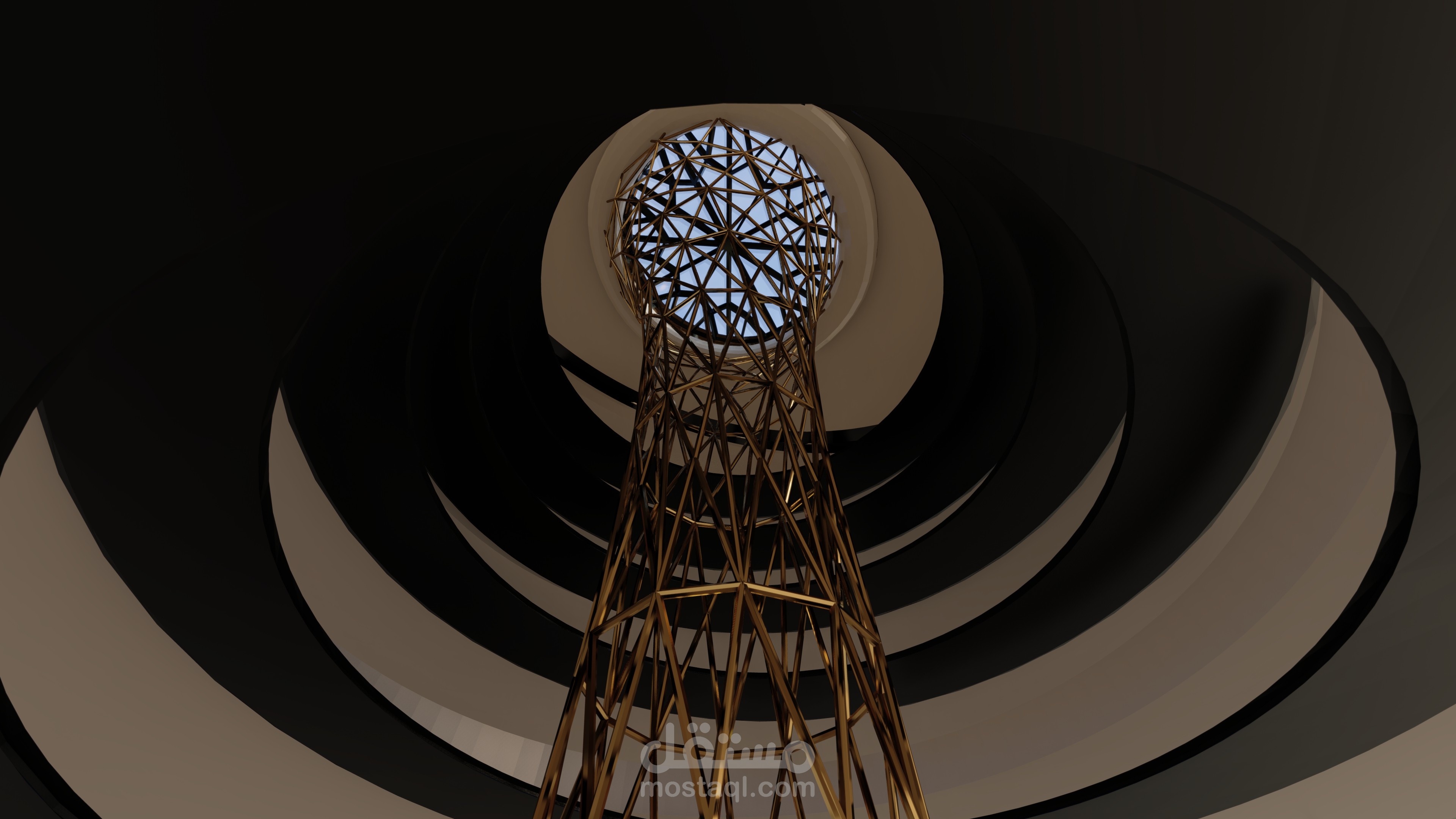 The project was divided into three design parts with different heights and assembled to form the museum block the exhibition block is designed to have an elliptical shape, I opened a window in the ceiling to indirectly enter natural light Into the parts of the exhibition, which consists of three levels, I worked on the visual contact between the three levels through a central patio, The transitions between levels of the galleries are designed by a pedestrian ramp in the vicinity of the Patio, allowing people to enjoy an enjoyable view of the exhibition when moving and in the middle of the openness, it created a structural element of metal that connects the floor to the ceiling with attractive bends to give an exciting scene to break the boredom for people who move through the long rump