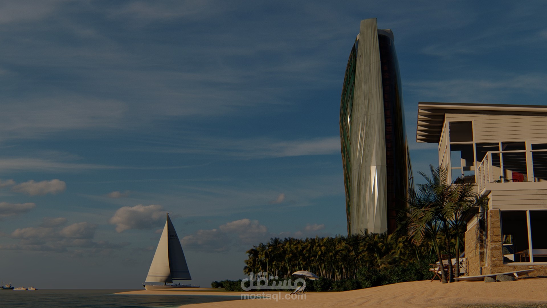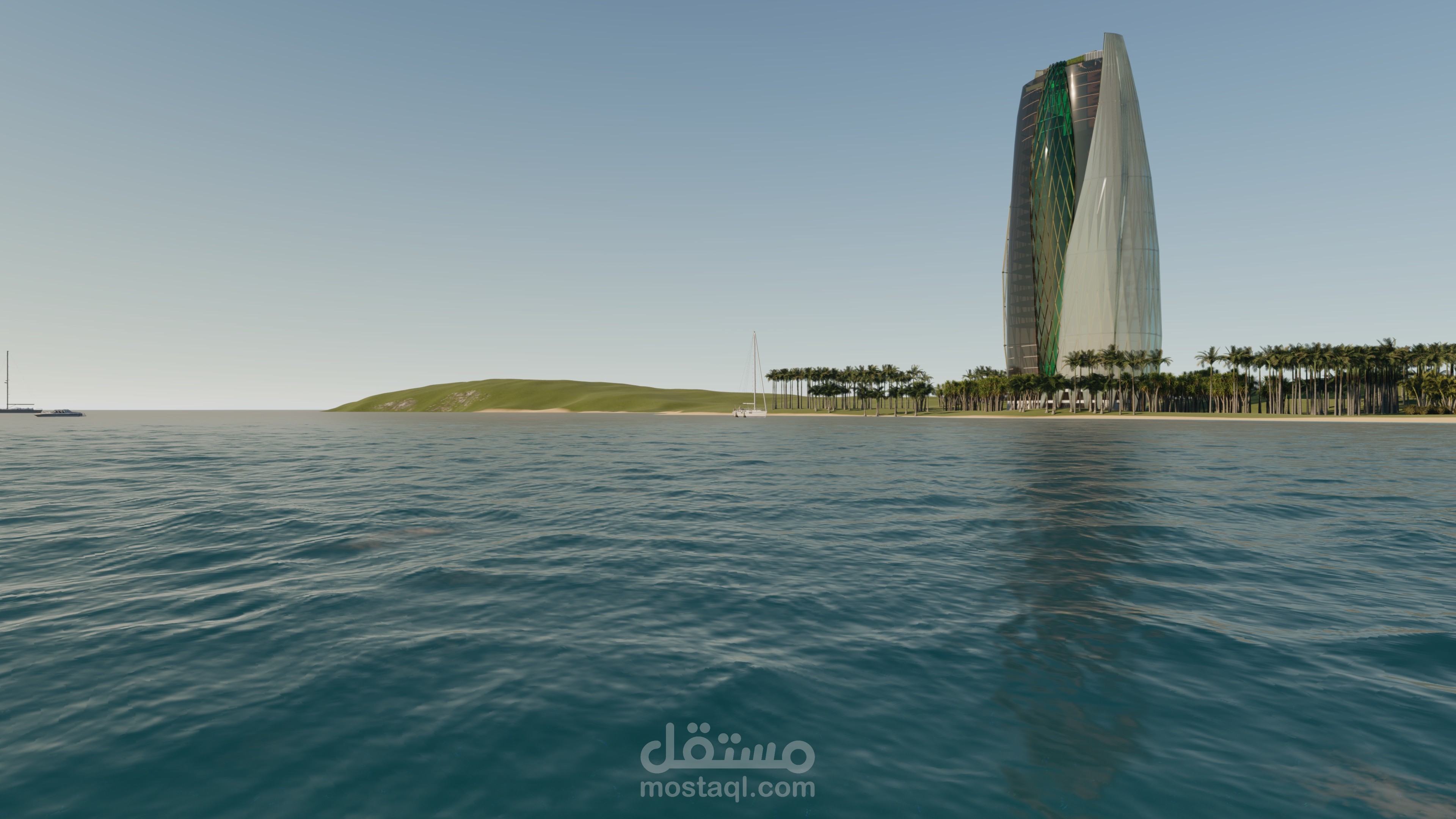 The design idea is inspired by the leopard seashell, It is a smooth seashell, and the sand of Tartus is famous for this shell, The floors are designed in an oval shape to cushion the wind loads and push the winds on either side of the tower, Where the blades are distributed around the tower, Wind receivers are placed on these blades from the inside, Is making use of the wind to generate electric power for the tower, In addition, on the outer surface of the southern blade, solar cells that take advantage of solar energy, Green gardens are designed along the length of the tower on the front façade, so that every three floors there is a garden overlooking the offices and hotel rooms, and these gardens give a beautiful interior view and psychological comfort to the users in addition to that they reduce the unwanted rays of light refracted from the sea, These gardens were covered with a distinctive crystal mass, with its streamlined design, to give the tower its distinctive mark