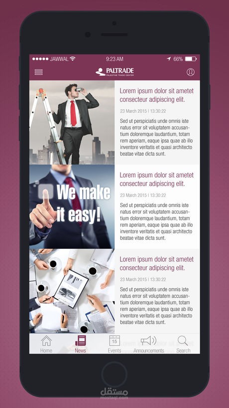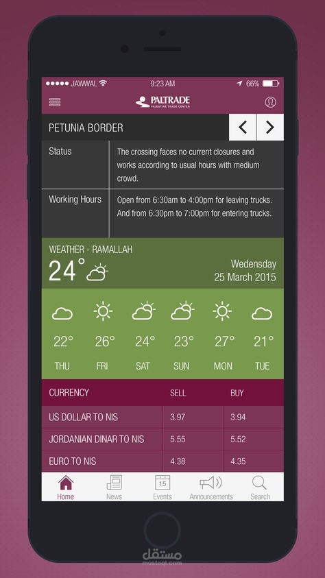 The application is a news mobile phones application that will allow PalTrade members to be up to date about PalTrade most recent news and announcements. It will as well provide other services to PalTrade members such as the ability to view border status, weather, and some business related content mentioned in this document.