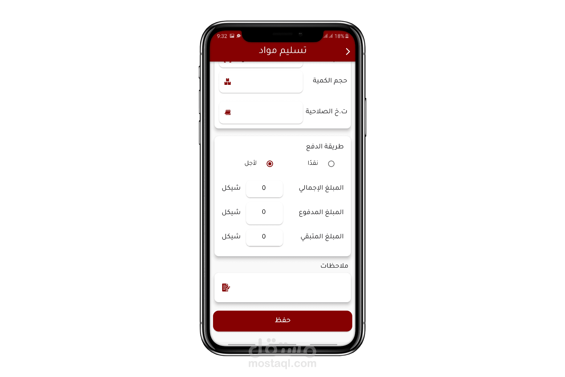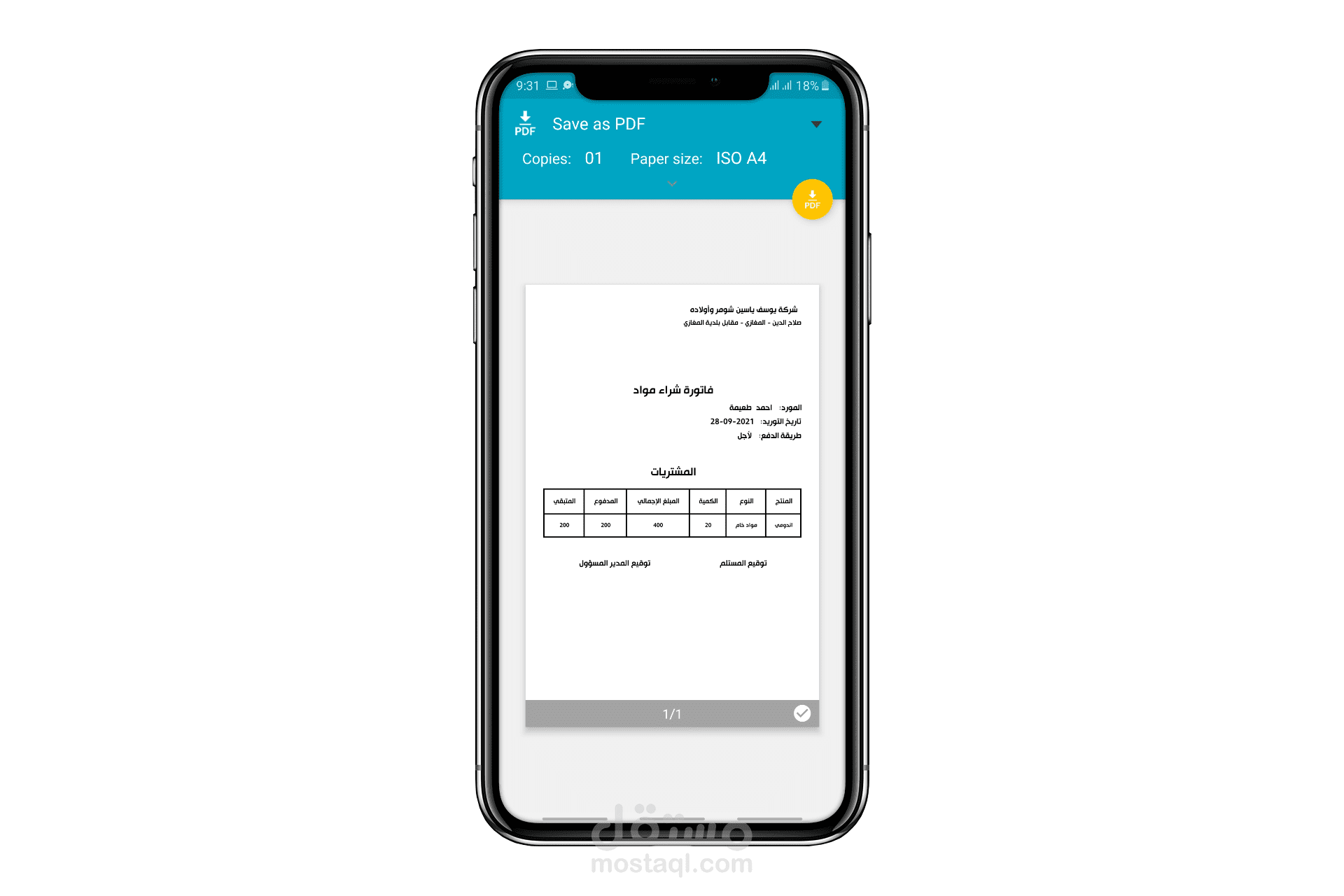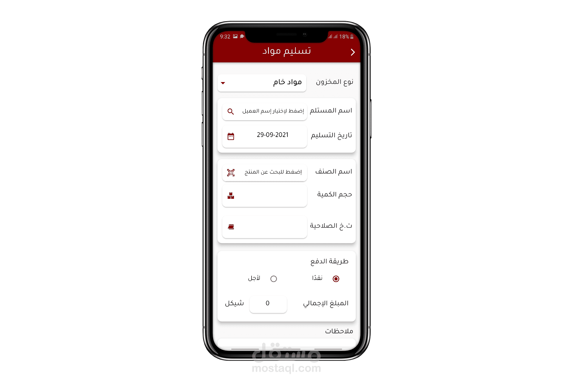 وتسجيل المواد الواردة والمواد الصادرة وفواتير البيع وفواتير الشراء وإمكانية طباعة الفواتير