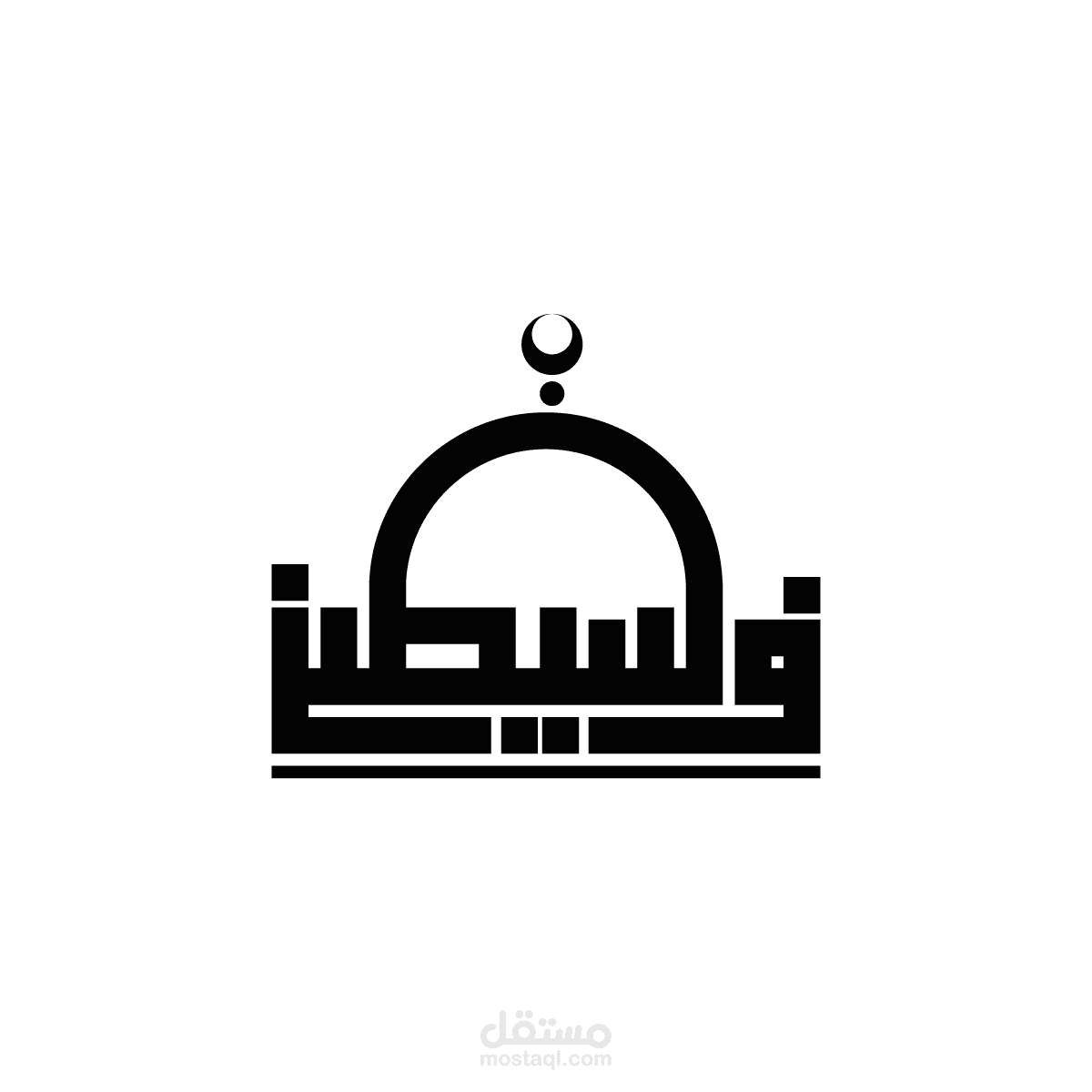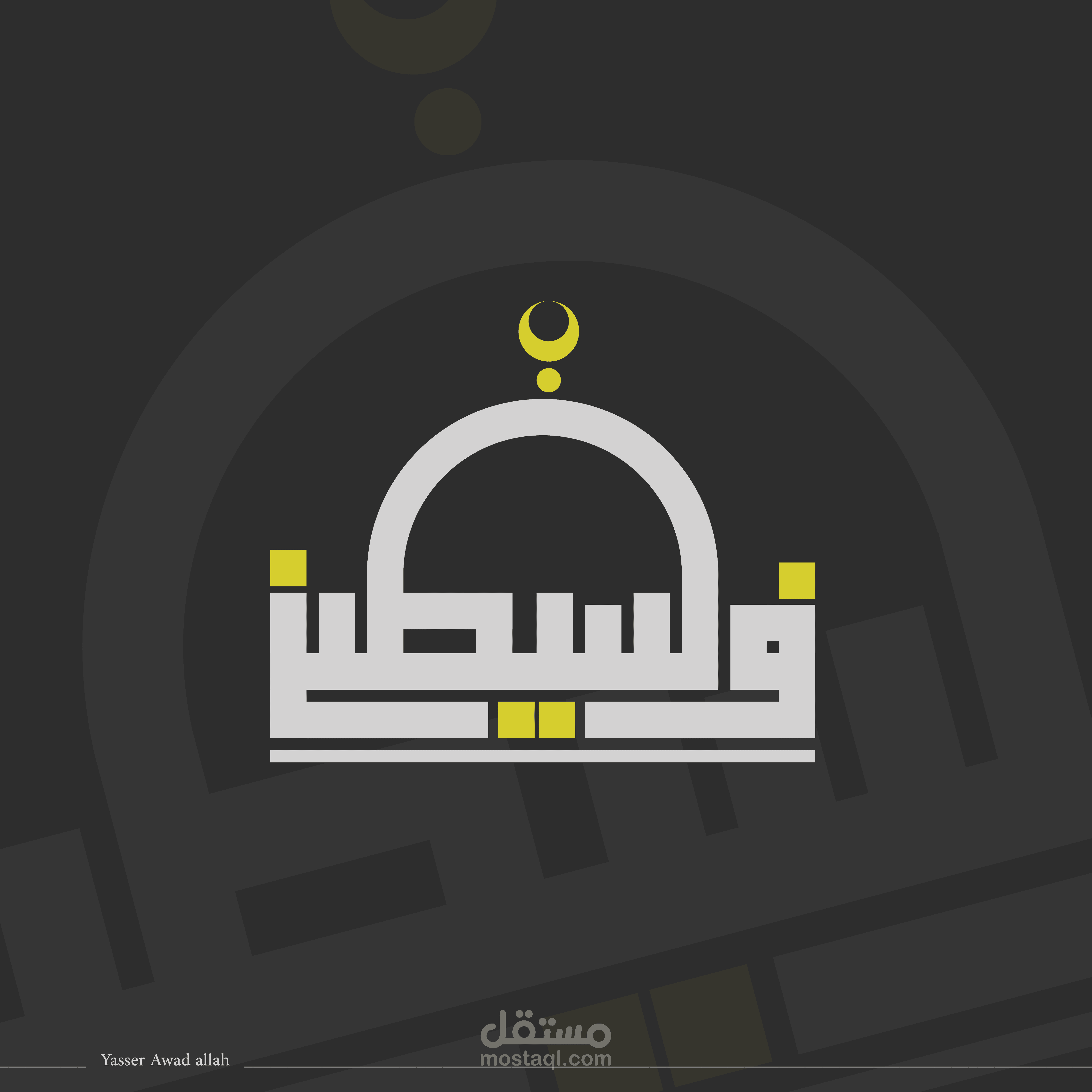 شعار لكلمة فلسطين بالخط الكوفي المربع باستخدام برنامج اليسترتو مع موك اب للوجو بالخط الكوفي