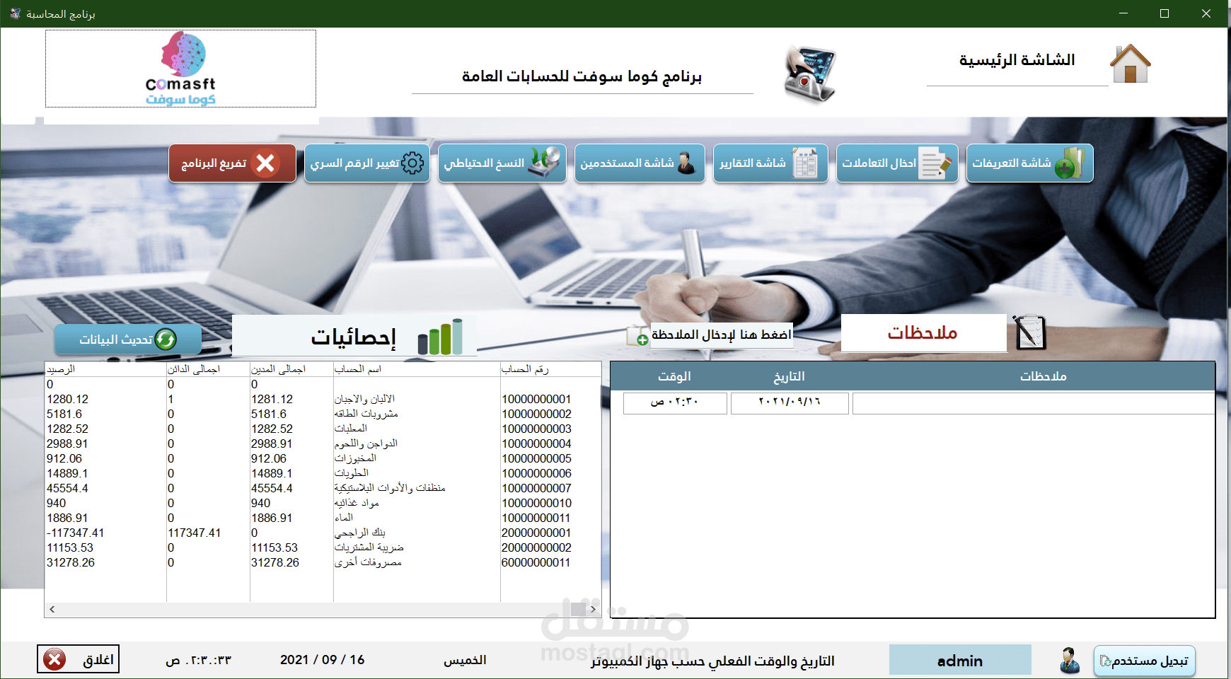 بلاش مخاطره وأمن نفسك وشركتك️ البرنامج الذي لا غني عنه في الانشطه التجاريه والصناعية برنامج كوما سوفت للحسابات العامه حيث يعمل علي مساعدتك في إدارة كل جوانب أعمالك بواجهة سهلة وبسيطة الاستخدام تسهل عليك معرفة امورك الماليه وماتحققه من أرباح ويحتوي علي الشاشات التالية