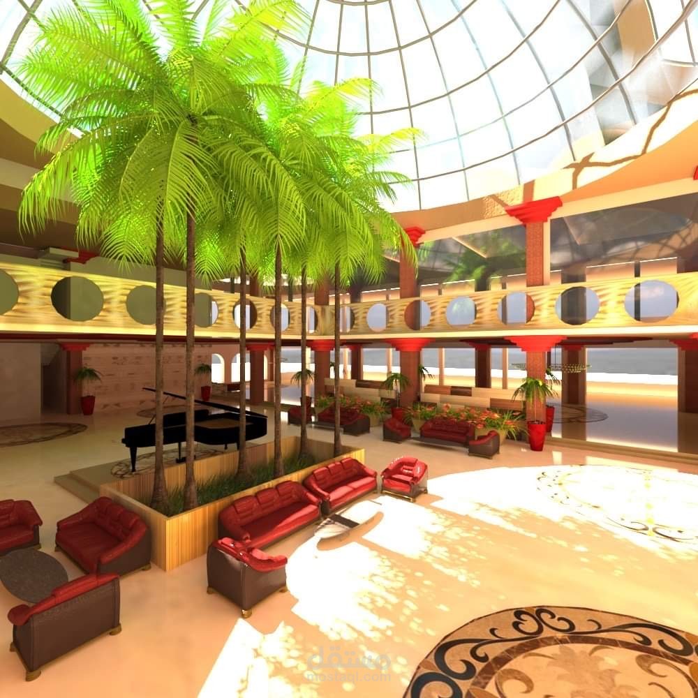 3D interior design of zone reseption for resort in Aswan city with furniture ,colour design , also the principle design reflects the history of Aswan city