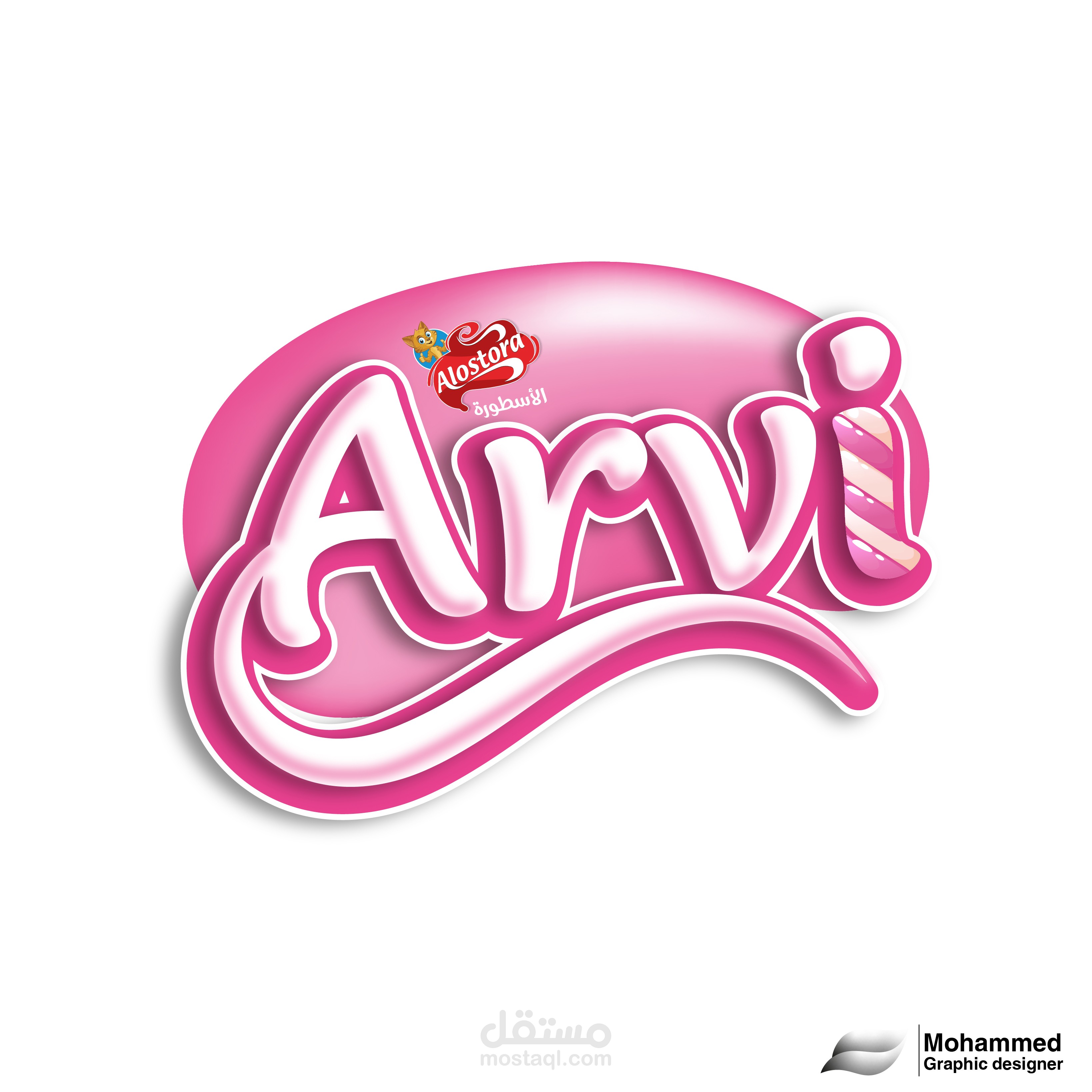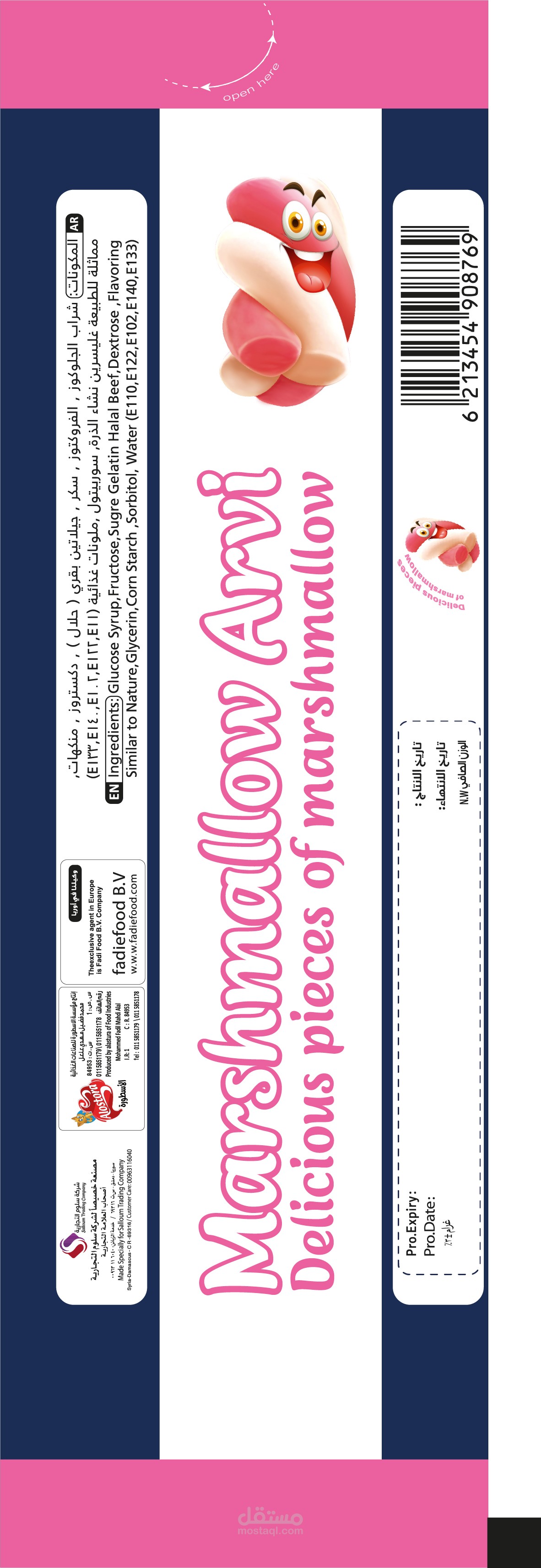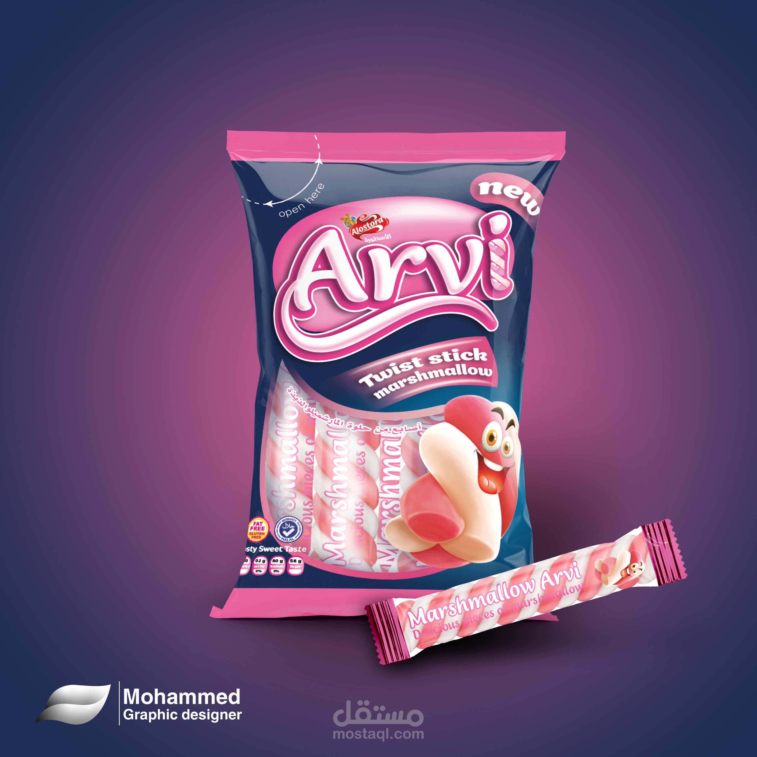 تصميم صنف من المارشميلو بدأت بعمل اسم arvi ثم تصميم packaging bag مع رسم شخصية مارشميلو كرتونية ثم عمل مجموعة من صور السوشيال ميديا