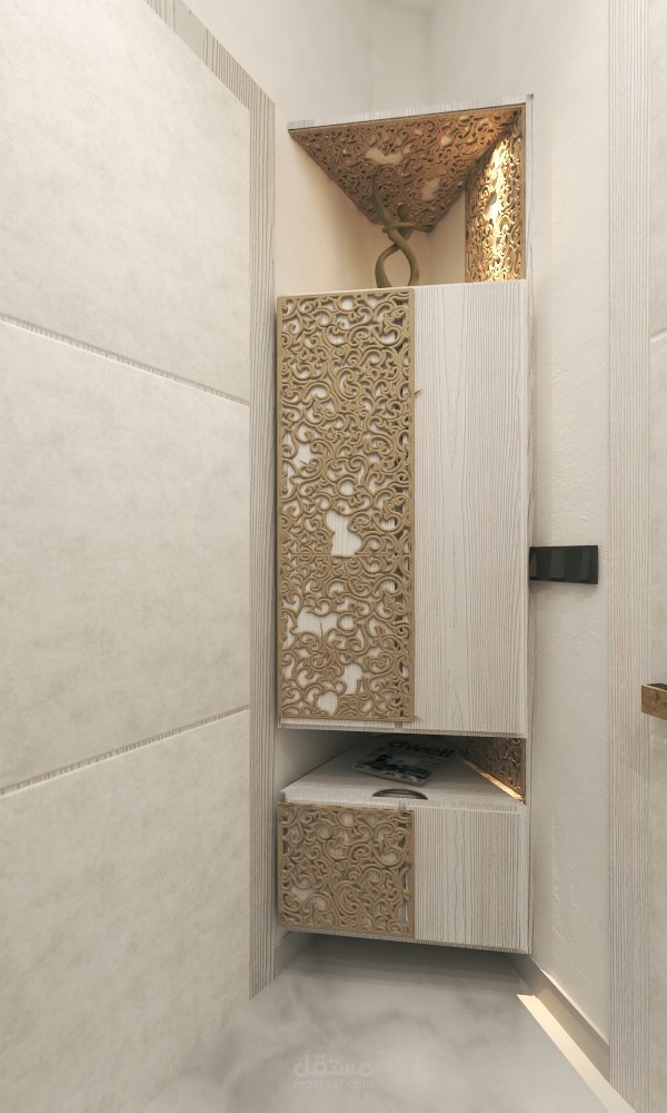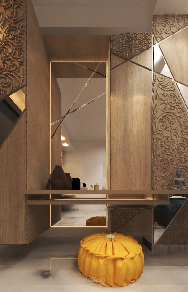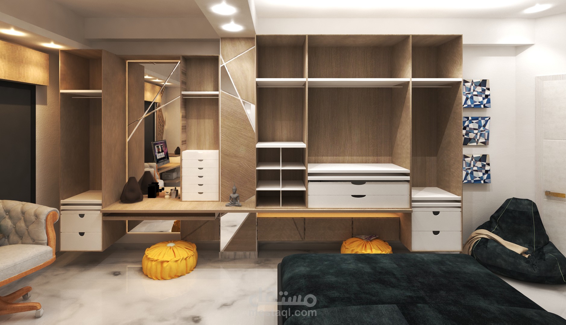 الاعتماد في تصميم الخزائن على توحيد الخطوط مع أسقف الجبسمبورد الموجودة مسبقاً. وإضافة عناصر الخشب المحفور cnc لتوحيد النمط.