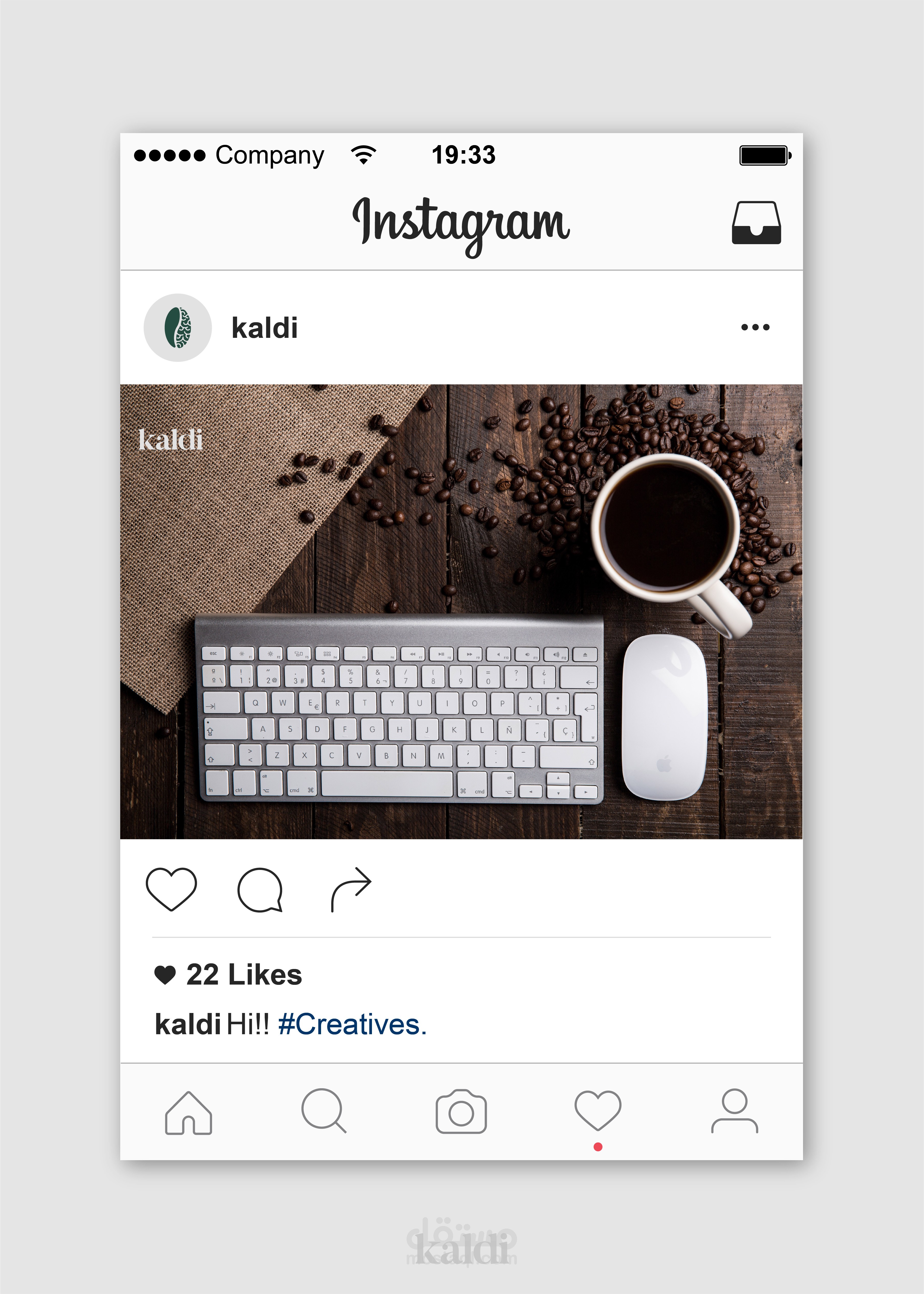 الشعار يتمحور حول التشابة بين حبة البن والدماغ ويؤكد علي ما توفرة القهوة من طاقة للدماغ، بينما تم اختيار اللون الاخضر كلون اساسي للتأكيد علي كون كالدي عضوي وصحي وملئ بالطاقة.