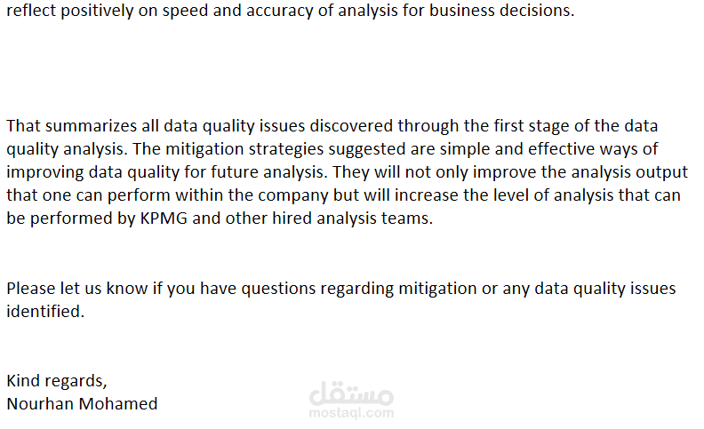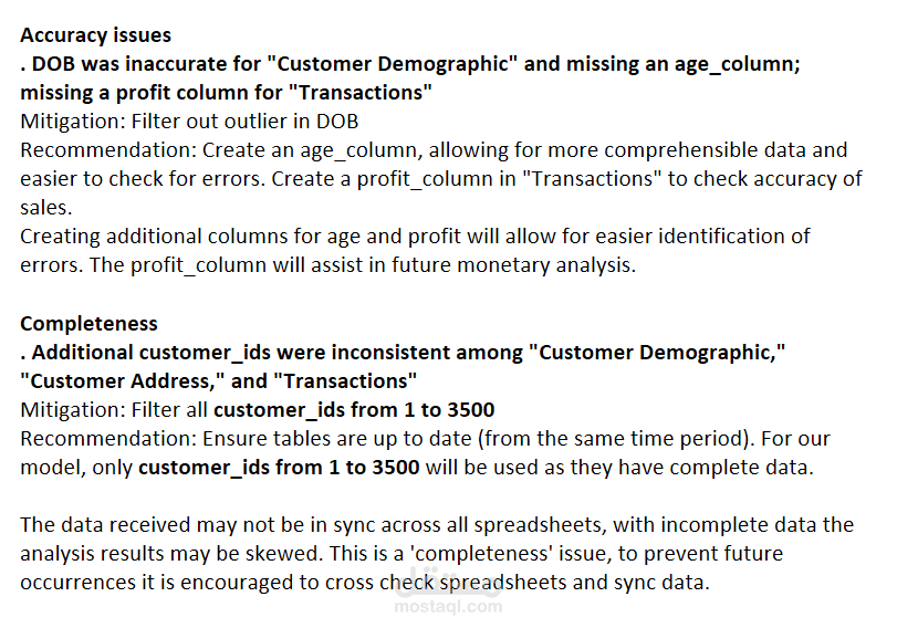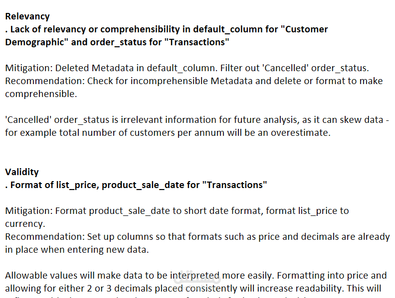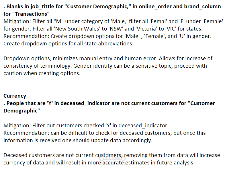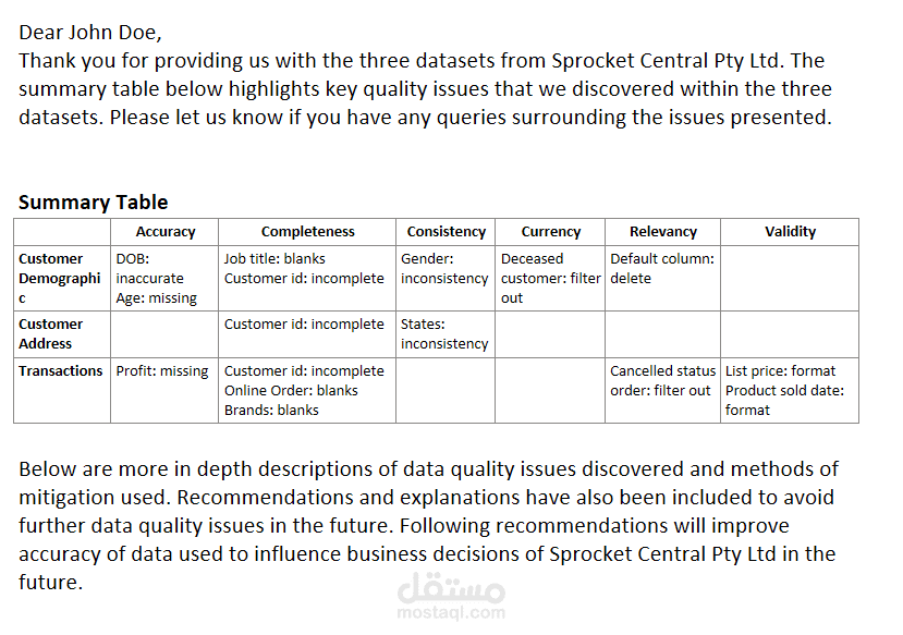 لقد قامت شركة Sprocket Central Pty Ltd بارسال مجموعة من البيانات لديها حتى اقوم بتحليها وكخطوة اولية كان يجب ان ان اتحقق من جودة هذه البيانات وارسال ايميل يوضوح جودة هذه البيانات والمشكلات والحلول لها حتى ترفع من جودة التحليل لهذه البيانات ومساعدة الشركة فى اتخاذ قرارات سليمة مبنية على حقائق واقعية .