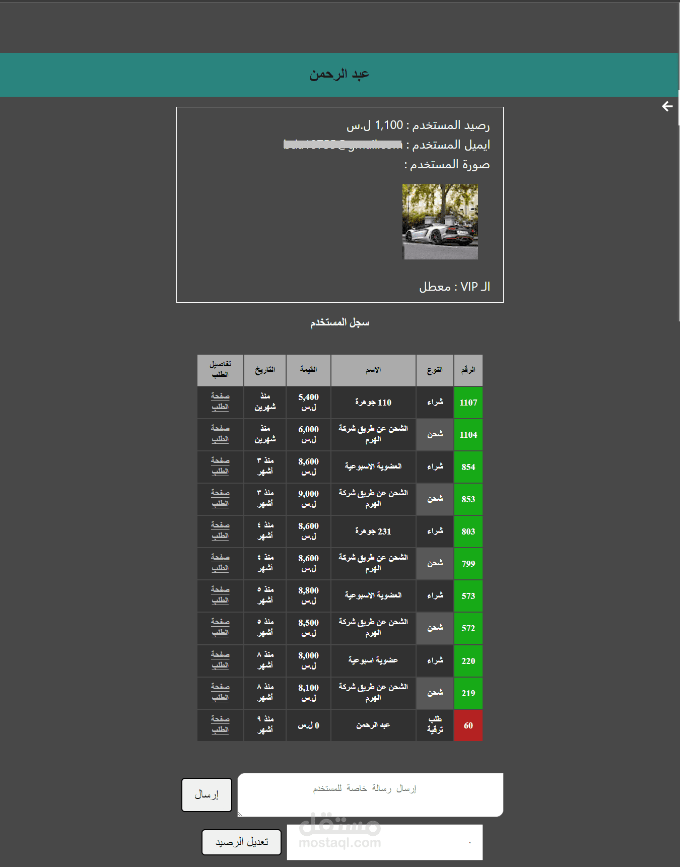 تفاصيل المستخدمين مع إمكانية تعديل معلوماتهم وإرسال رسالة خاصة
