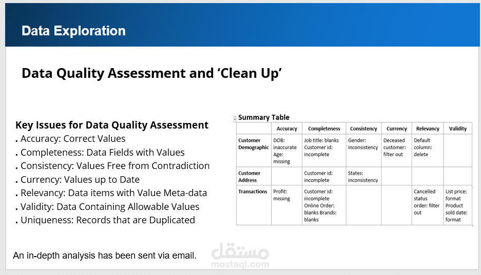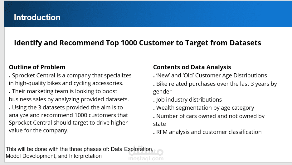 تم تقديم عرض توضيحى لشركة Sprocket Central Pty Ltd حول خطة العمل التى سوف تتبع لتحليل بيانات الشركة وتحديد افضل 1000 عميل جديد ليتم استهدافه من قبل فريق التسويق للشركة.