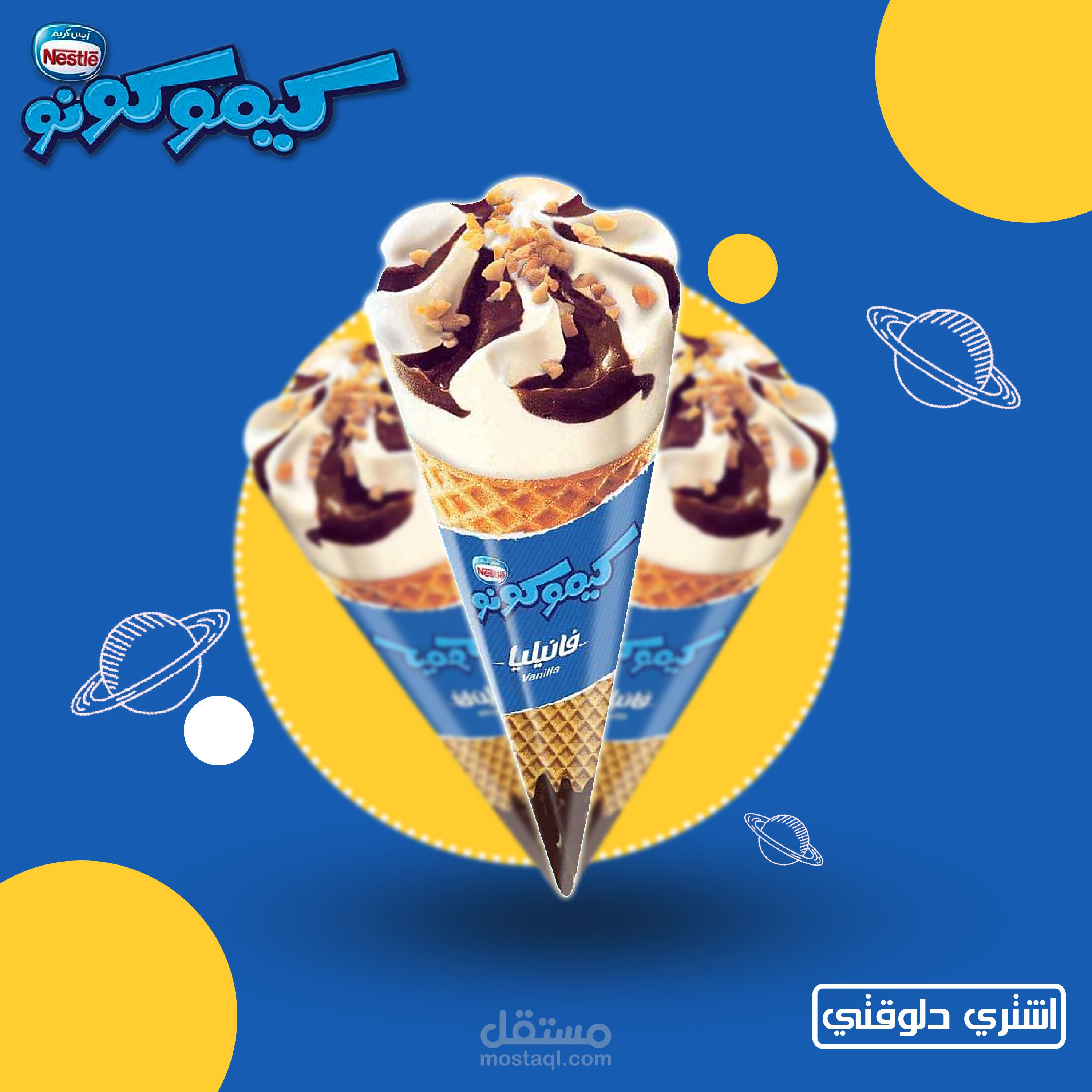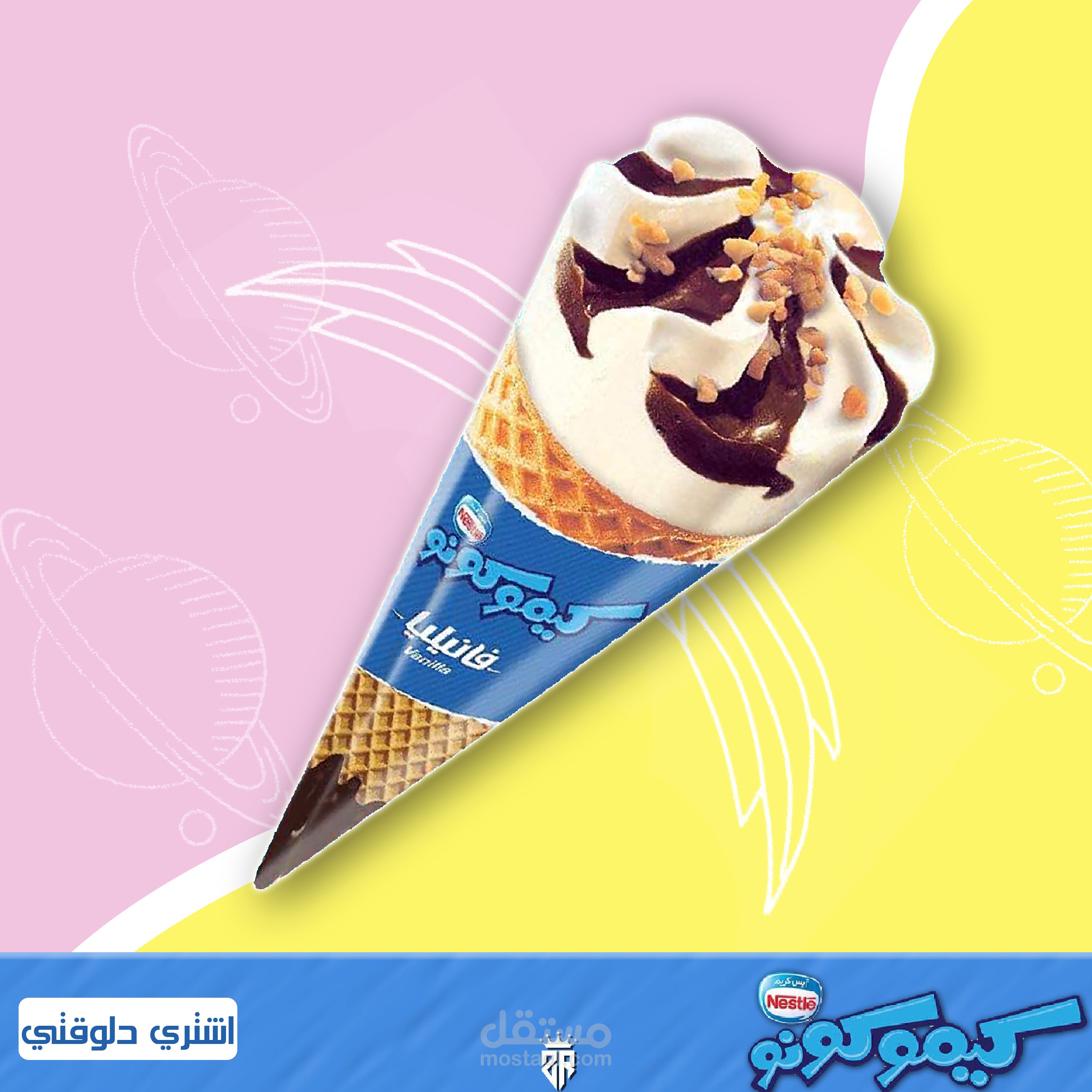 قمت ببحث عن المنتج او الايس كريم وقمت ببعض تعديلات عليه واضافه خلفيه توحي بالابداع وتوحي عن الشركه مثلجات