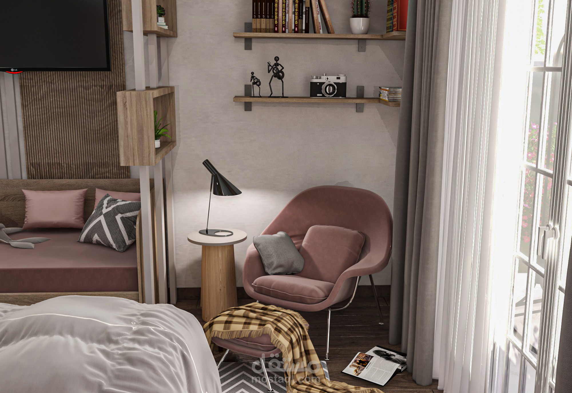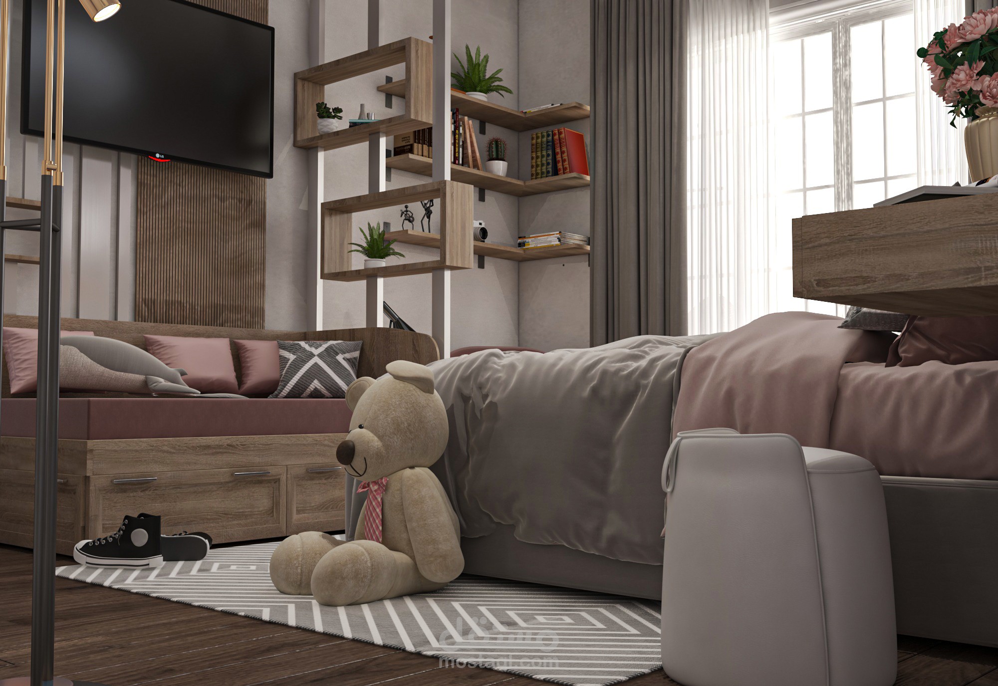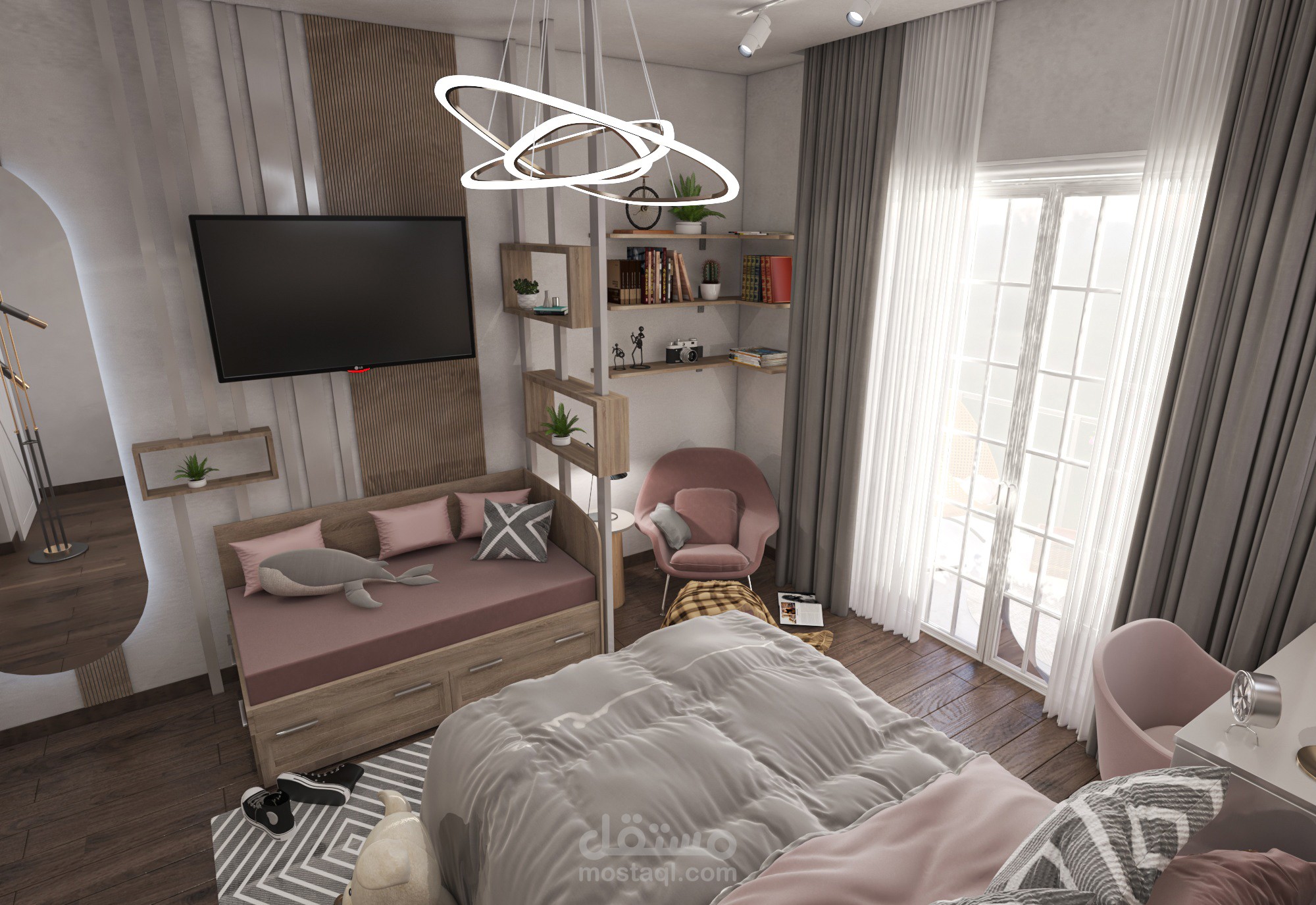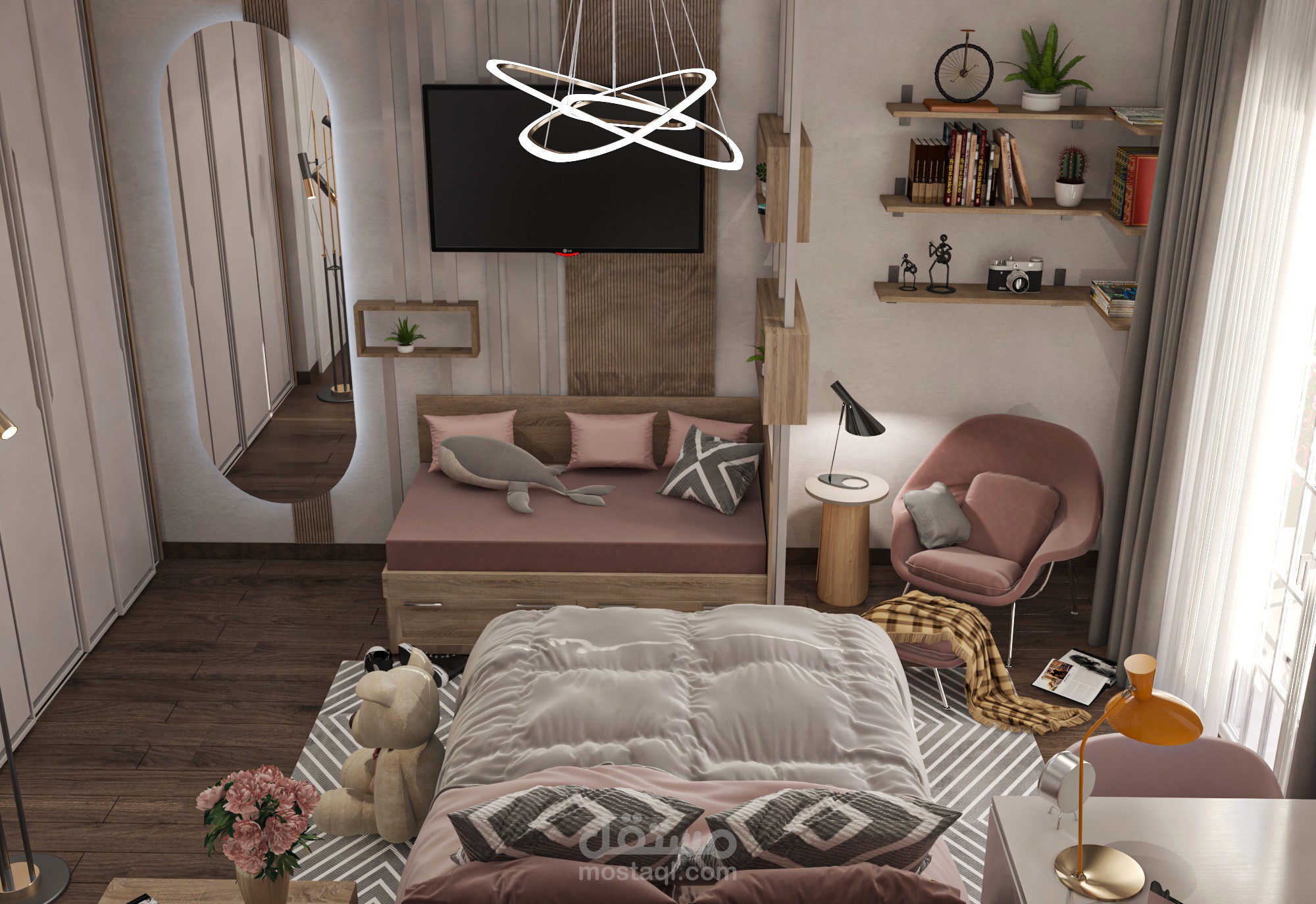 تم استغلال مساحه الغرفة استغلا جيدا حيث كان من متطلبات الغرفةسرير 1,40 ومكتب 1,20 للمذاكرة ودولاب خمسة ضلف وكنبة تفتح سرير و جزء reading corner ومرجيحة وايضا يجب استغلال المساحة ليبقى جزء فراغ للعب وقد تم ذلك فعلا حيث تم الفصل بين اجزاء الغرفة فصلا جيدا ووضع كل المطلوب ,فقد كانت هذة الغرفة تحديا كبيرا لكيفية استغلال المساحات