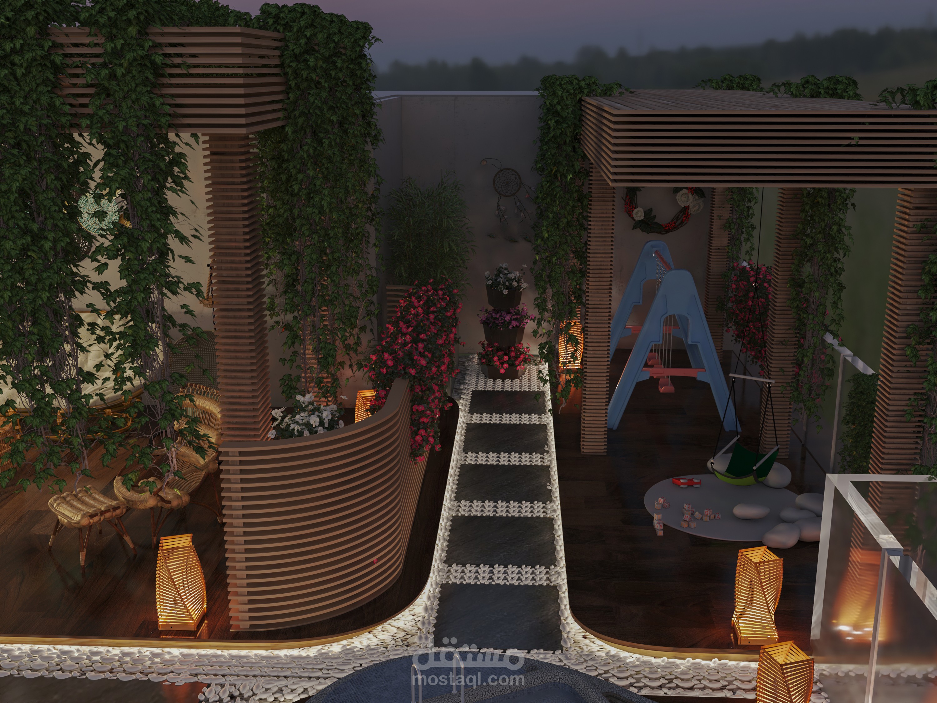 يحتوى اماكن للجلوس ومكان للشوى وحمام سباحة وايضا kids area
