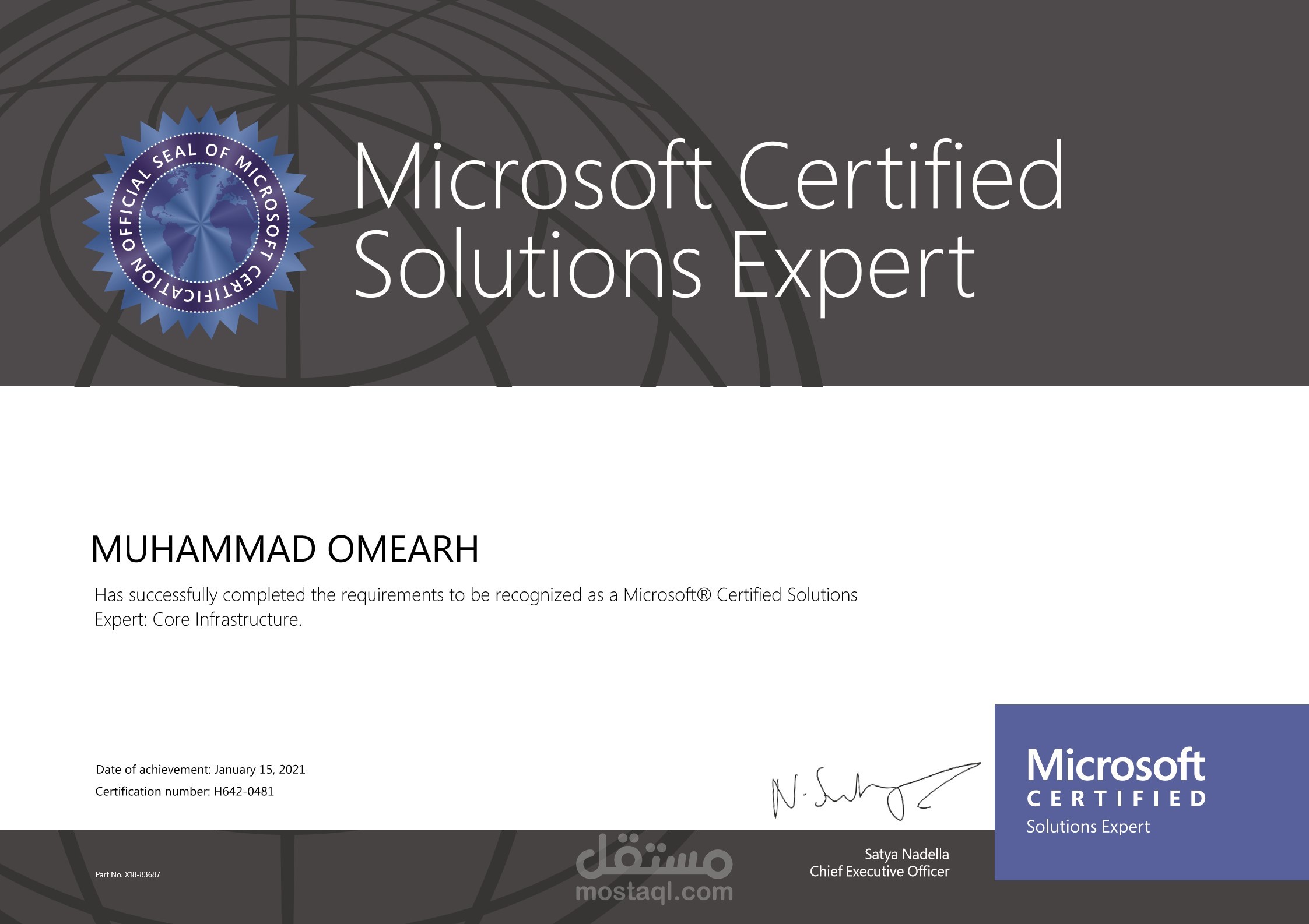 شهادة مهندس حلول خبير معتمد من مايكروسوفت ،وهي متخصصة بادراة انظمة الويندوز سيرفر 2016.