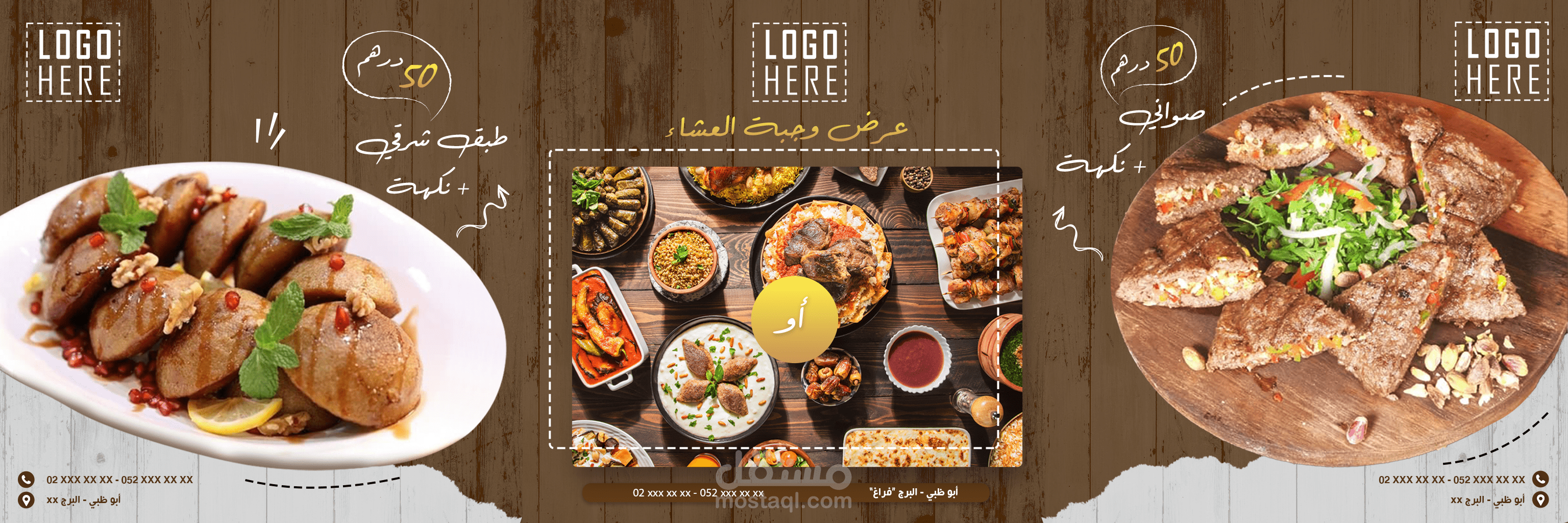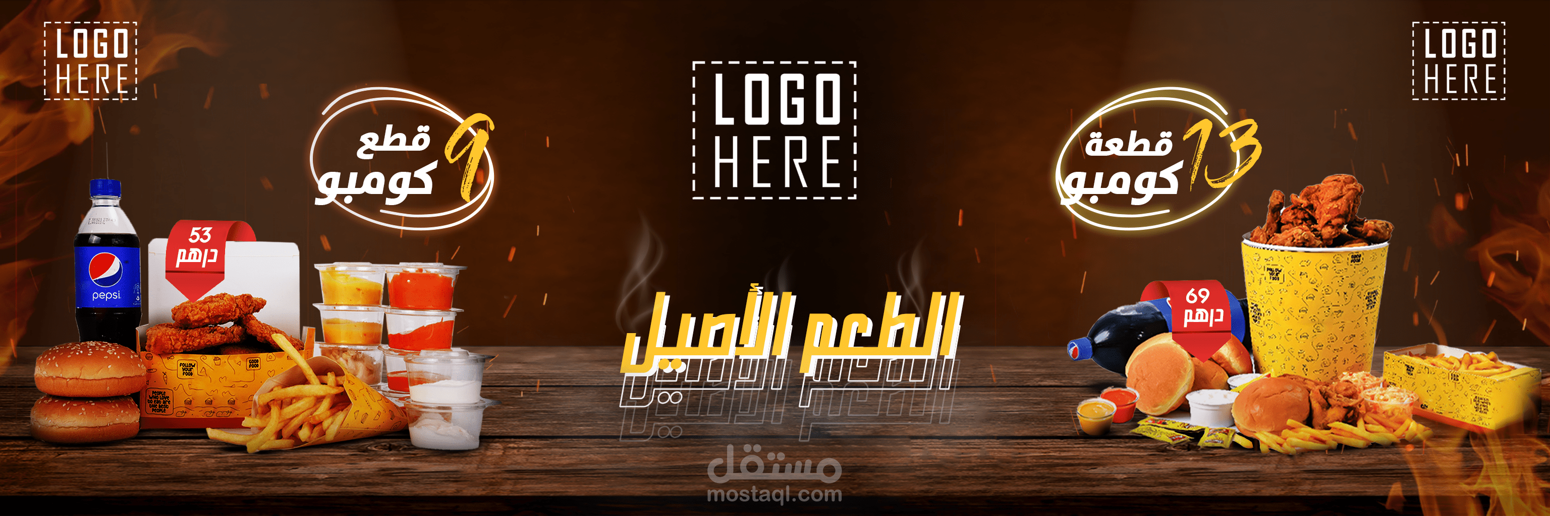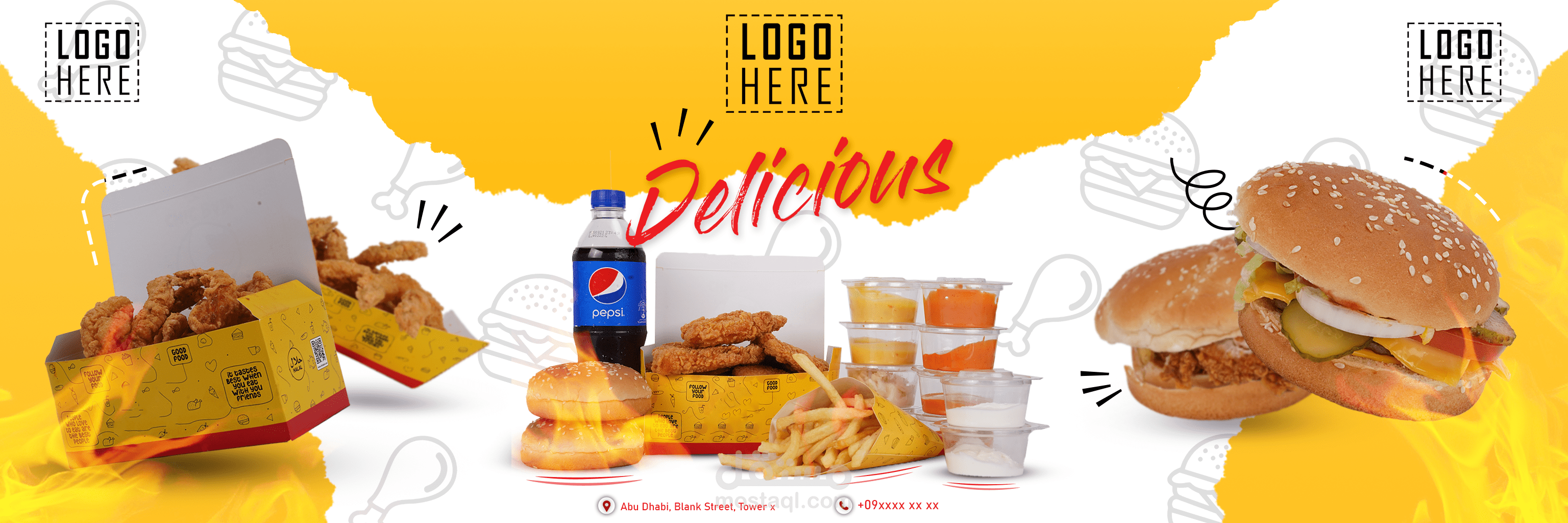 يتضمن المشروع تصاميم ترويجية لمحلات الوجبات السريعة والمطاعم تصلح ك بانر أو غلاف فيسبوك أو 3 صور انستاغرام متوازية ضمن البروفايل