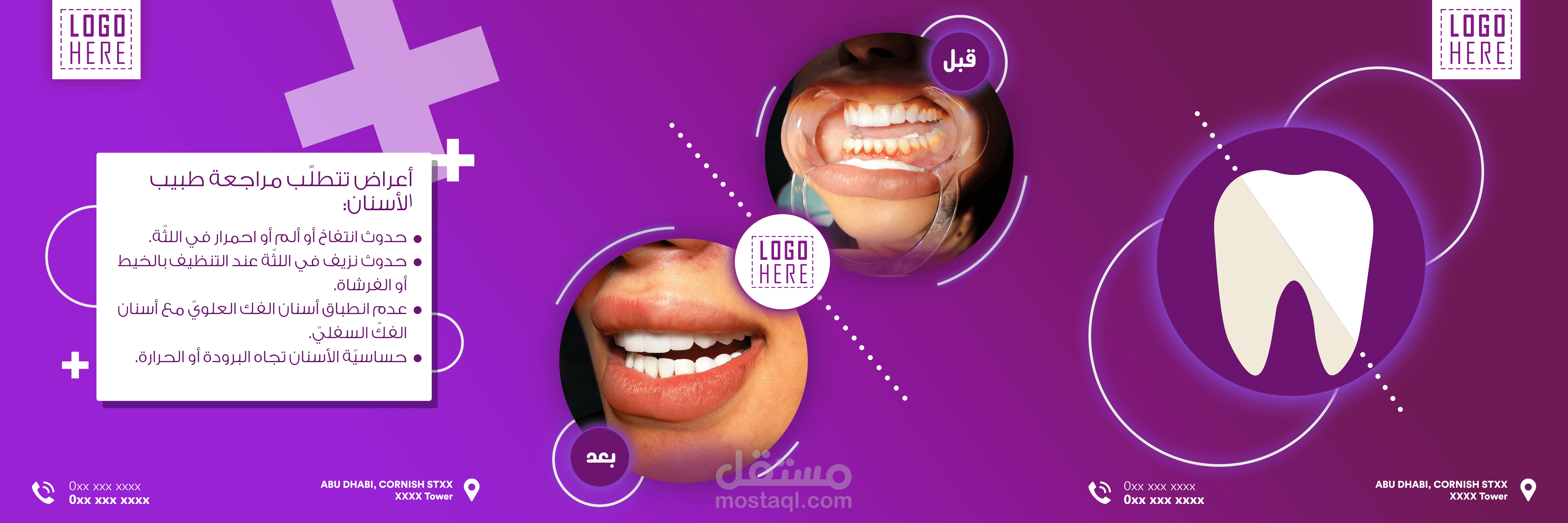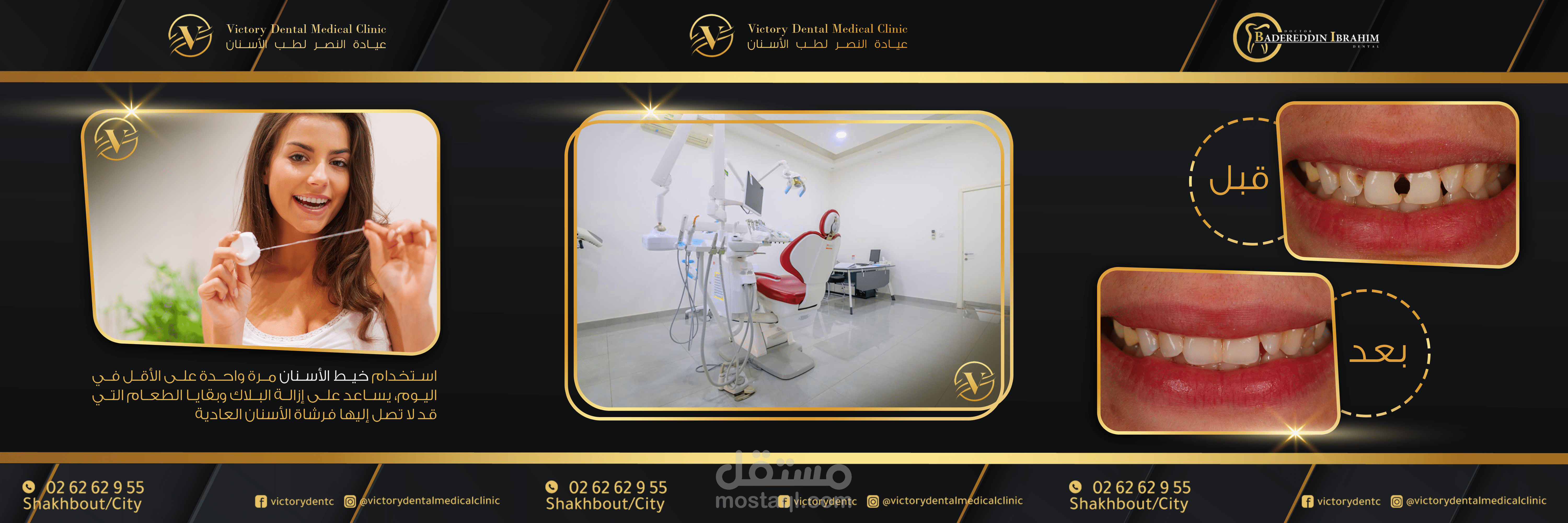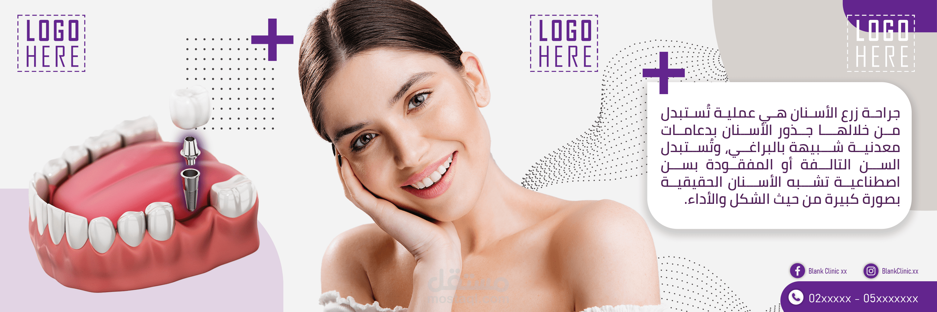 يتضمن المشروع تصاميم ترويجية لعيادات الأسنان أو الخدمات السنية الطبية تصلح ك بانر أو غلاف فيسبوك أو 3 صور انستاغرام متوازية ضمن البروفايل