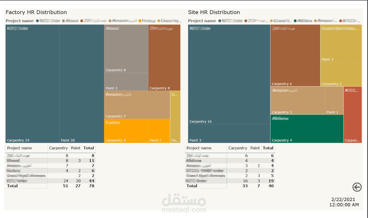 Tree map dashboard using Microsoft Power BI by taking the data from access database showing the human resources distribution for each project per department for 100+ company.