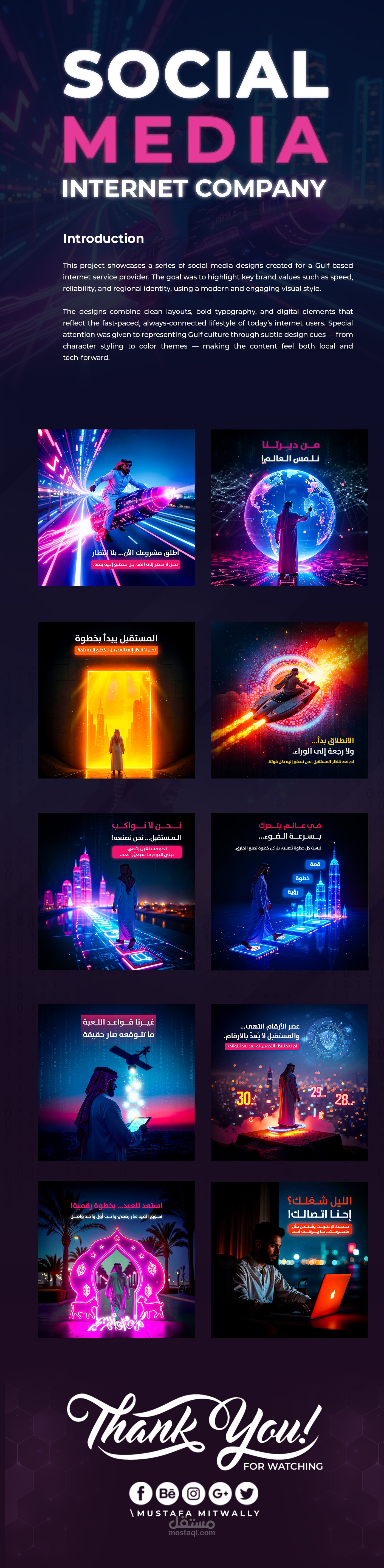 This project showcases a series of social media designs created for a Gulf-based internet service provider. The goal was to highlight key brand values such as speed, reliability, and regional identity, using a modern and engaging visual style.