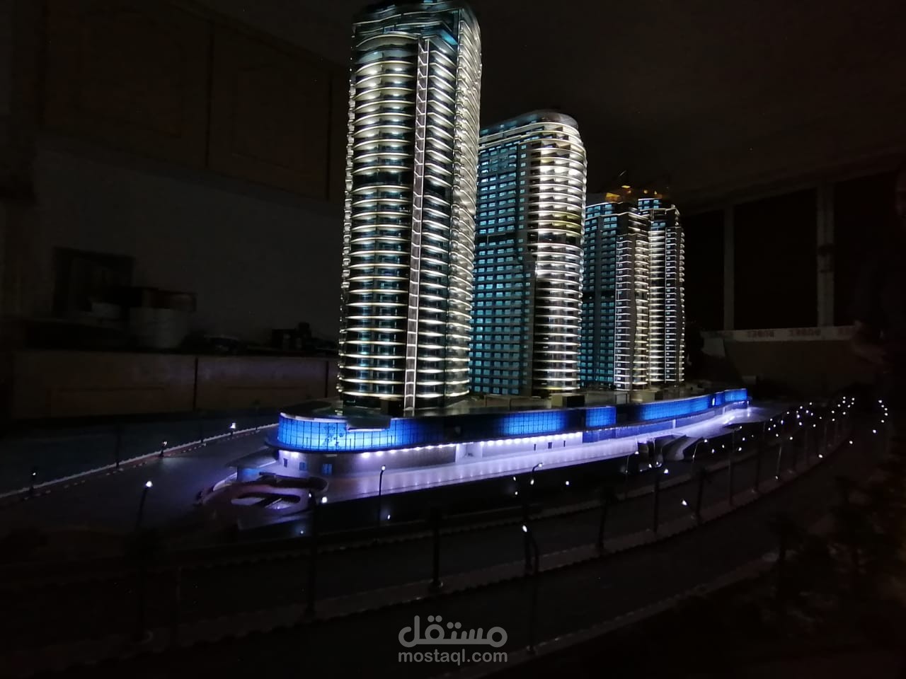 An architecture mockup model for Hassan Alaam's" Al Alamein Coastal Towers" fully lit with independent LEDs matrix controlled from a mobile application via Bluetooth