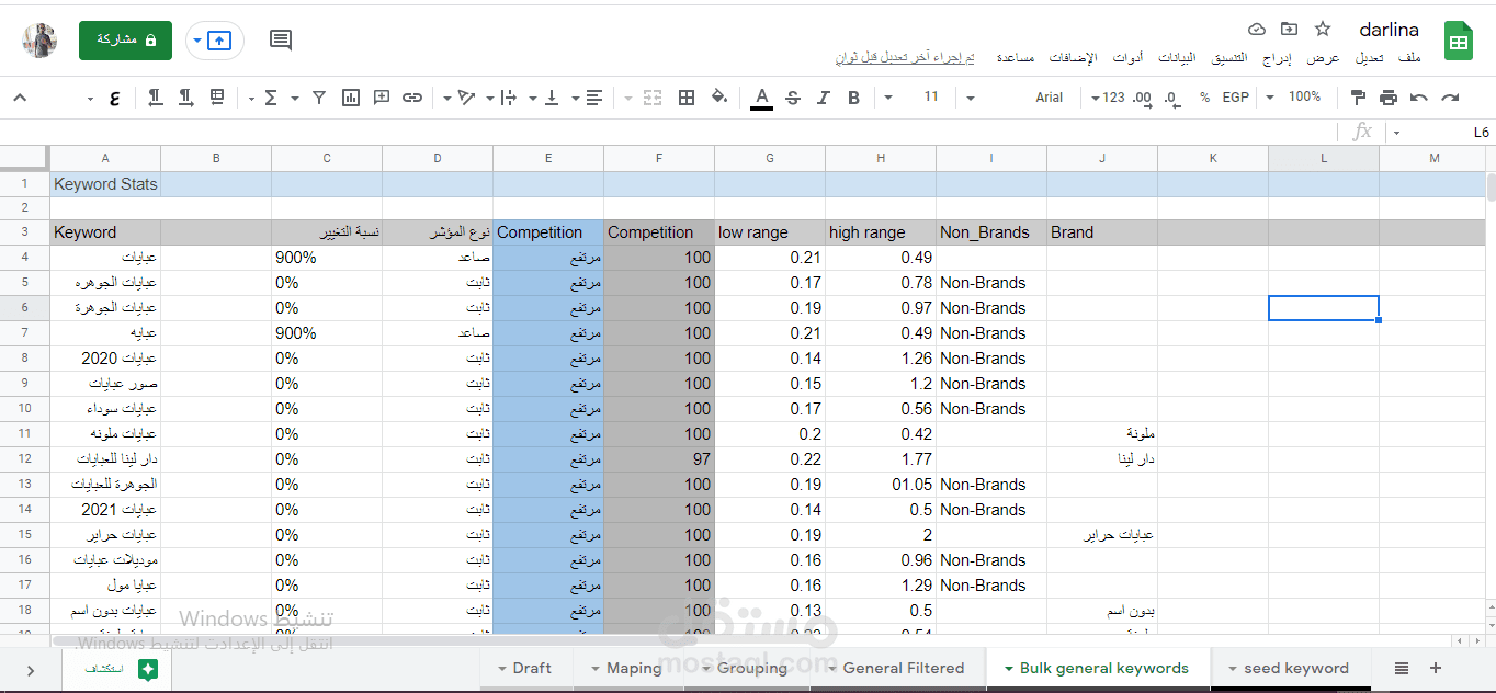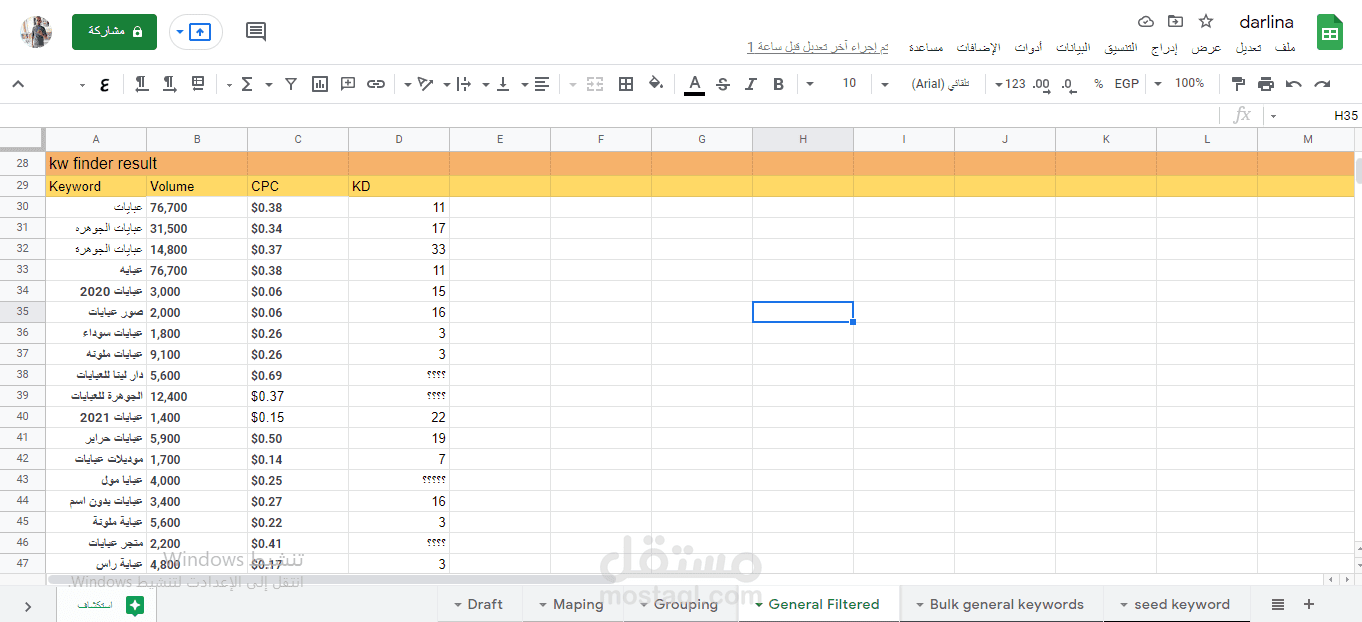 كما أنني أقوم بعمل تصنيف للكلمات المفتاحية ووضعها في مجموعات متناسقة (grouping the keyword research)