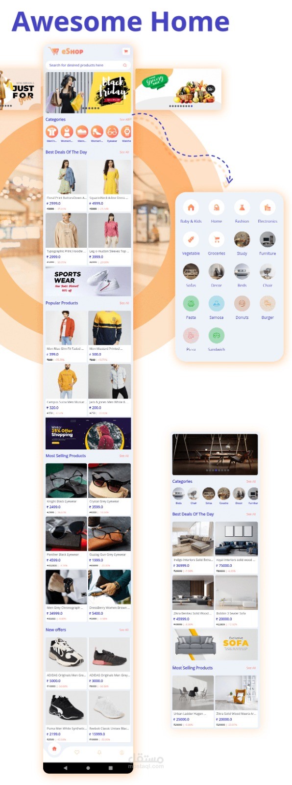 تم تصميم تطبيق eshop التجاري الذي يختص ببيع المنتجات كافة عن طريق التطبيق.