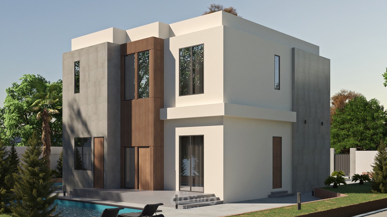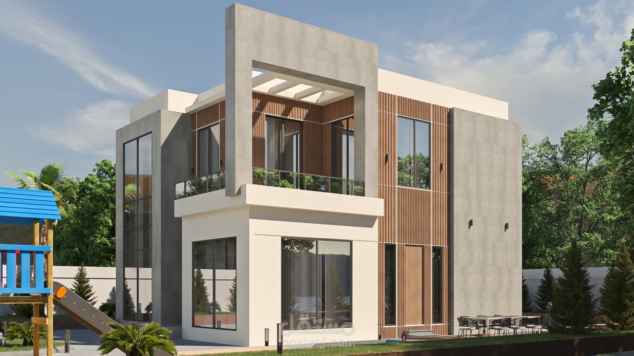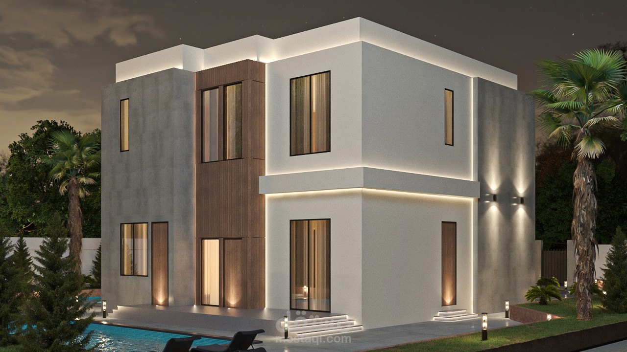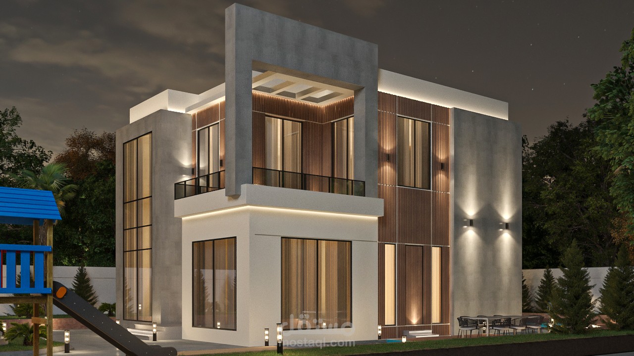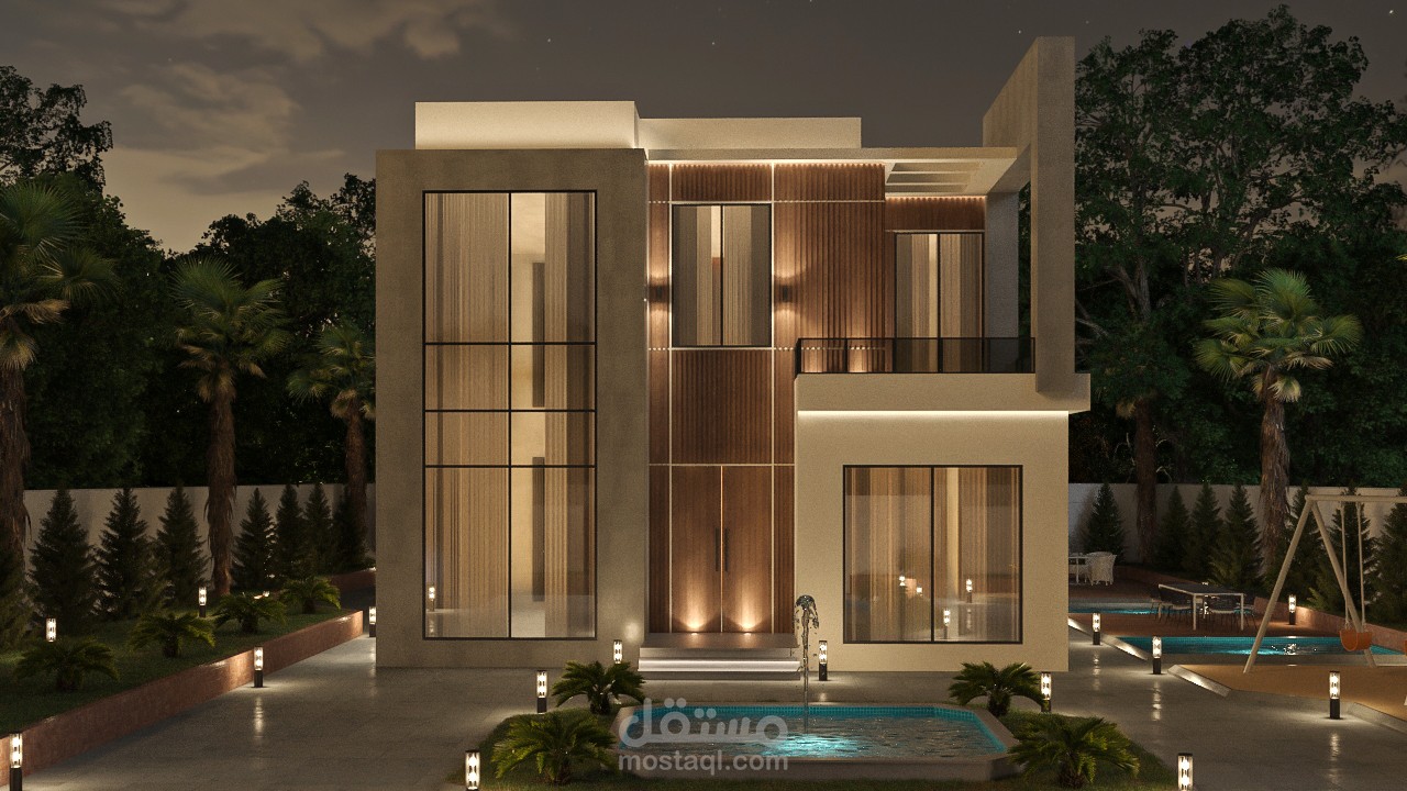 تصميم خارجي لفيلا طراز حديث، يظهر مشاهد ليلية وأخرى نهارية..