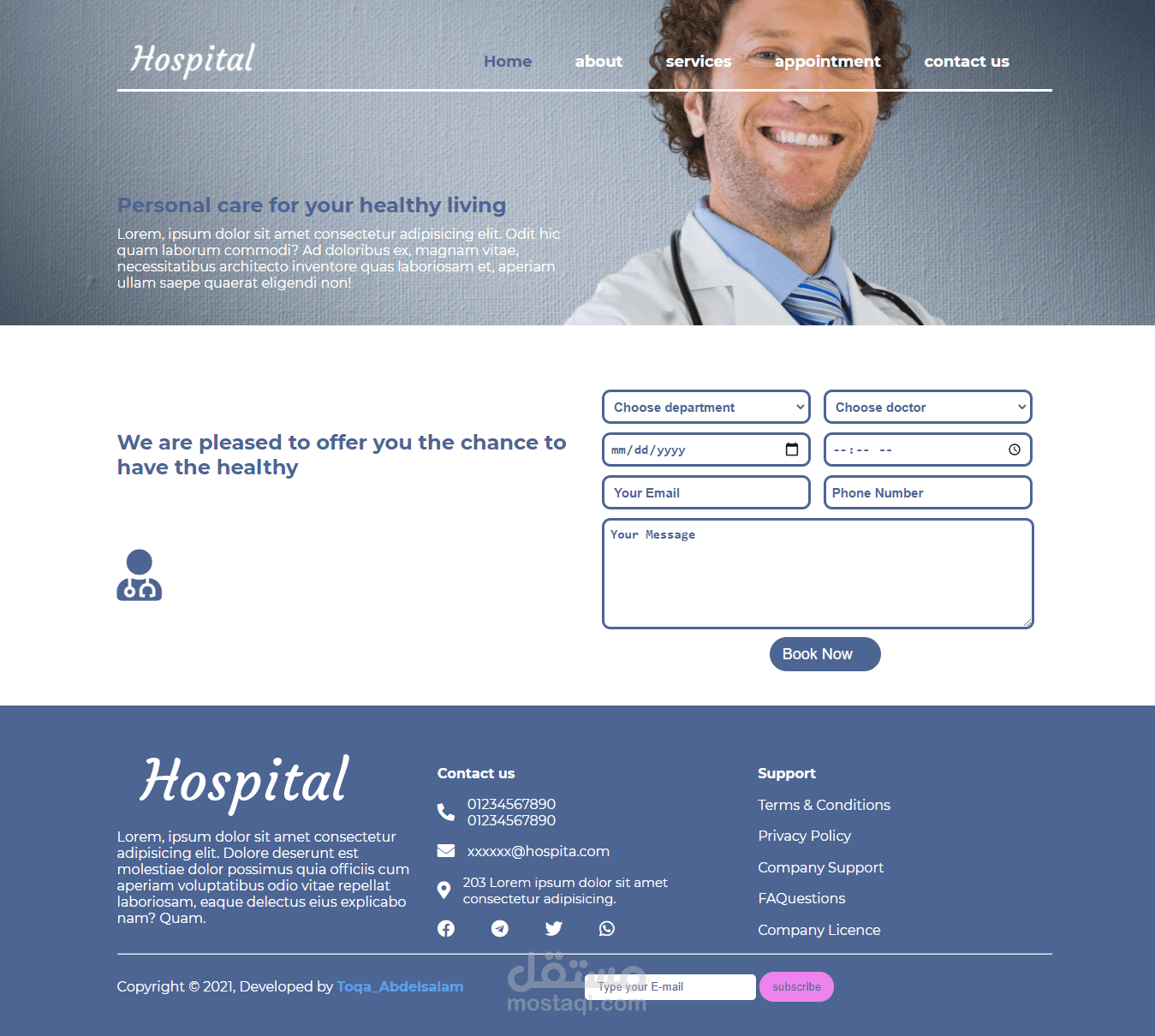 موقع Hospital_website هو موقع طبى يتكون من 5 صفحات ، وصممت كل صفحة بشكل responsive لتناسب جميع الشاشات ، استخدمت ف تصميم هذا الموقع (HTML , CSS , الجافا سكربت )