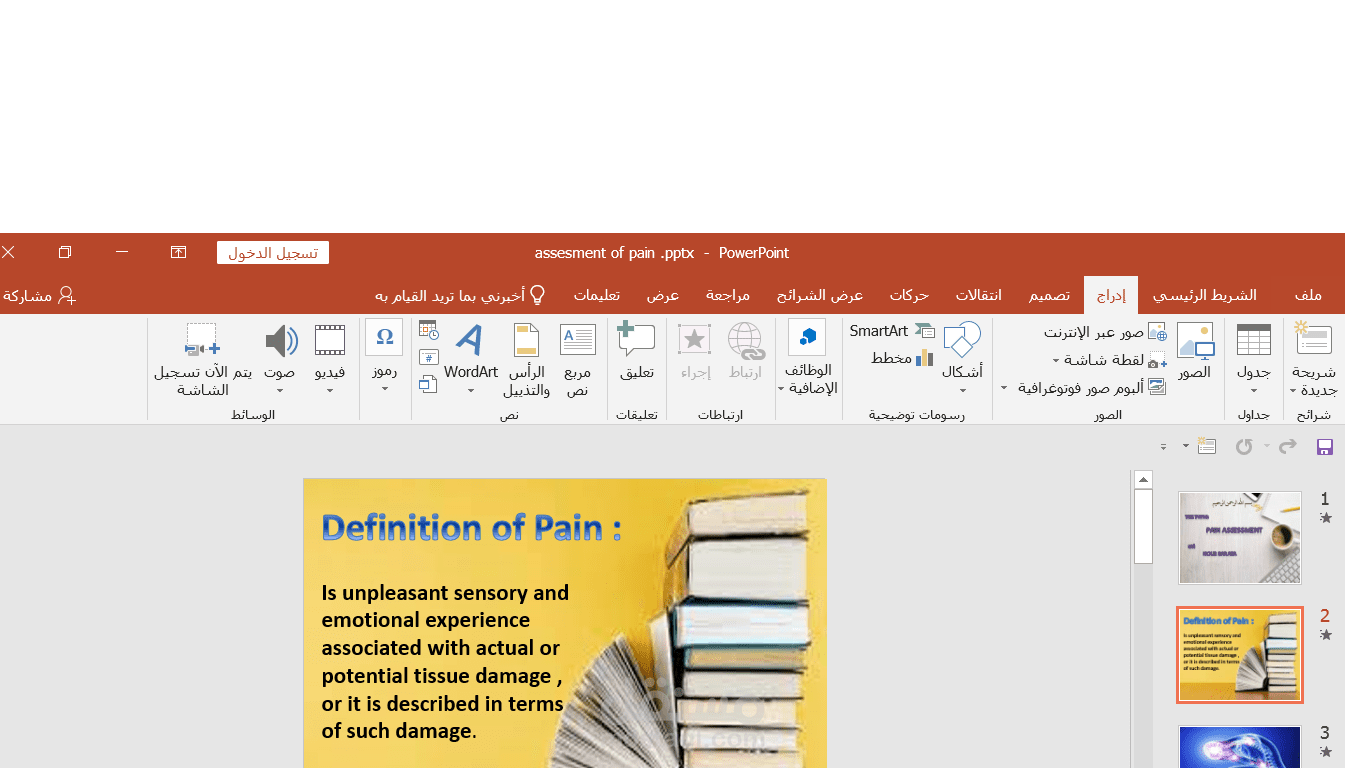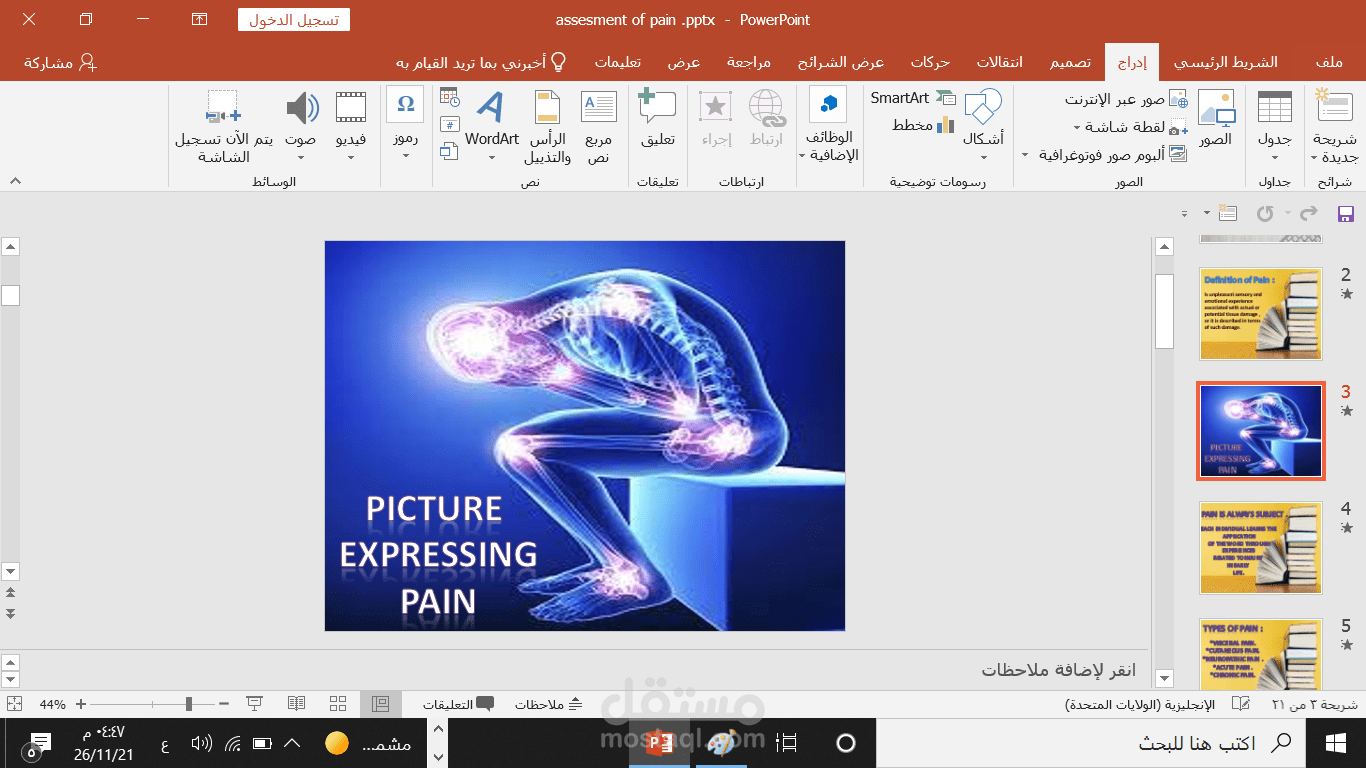 بوربوينت يوضح تعريف الالم وانواعه بطريقة خلابة مرفق بالشرح والصور ويبين درجات الالم ويتكون من 21 سلايد