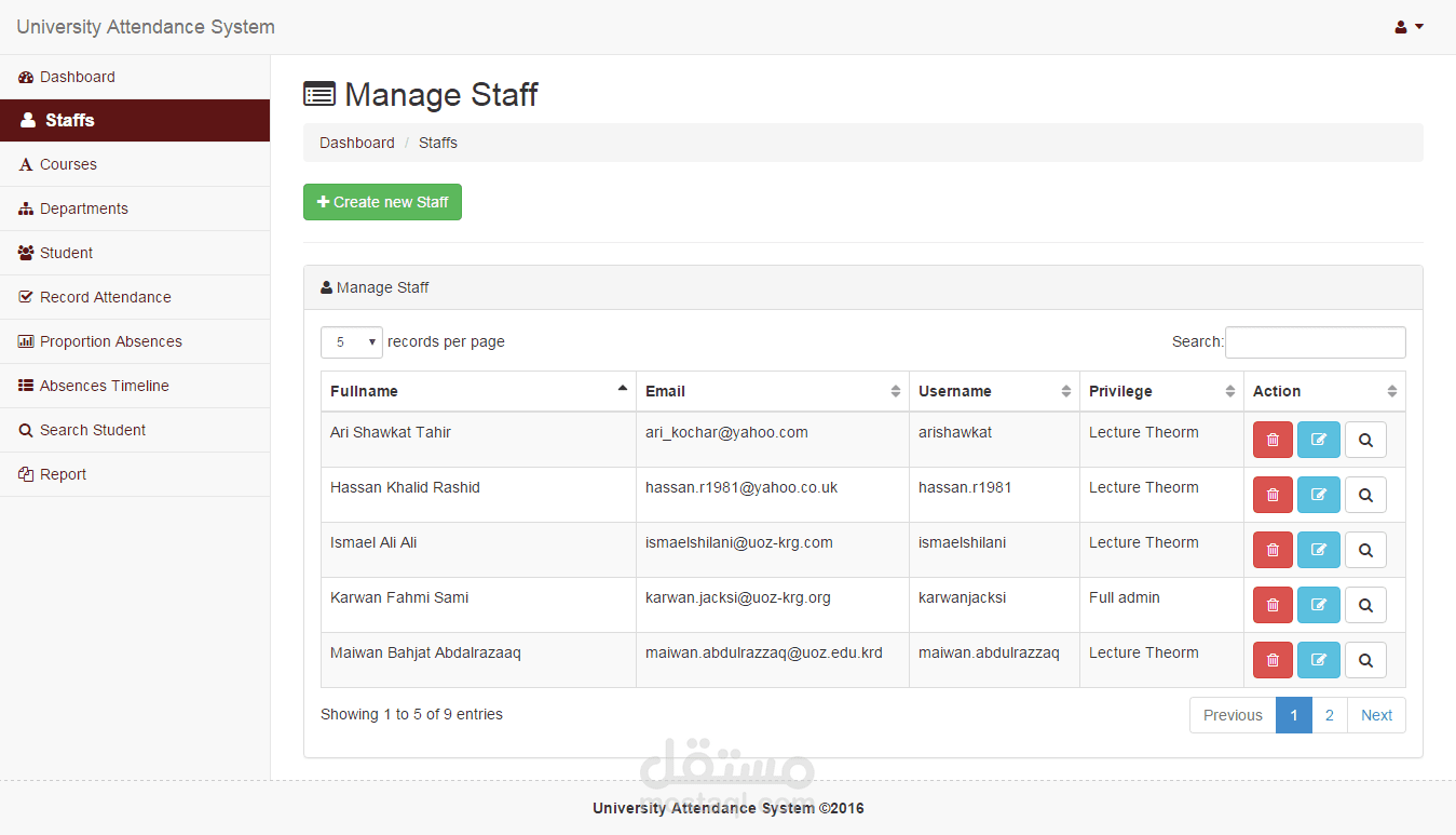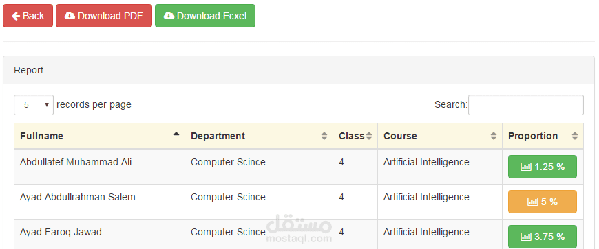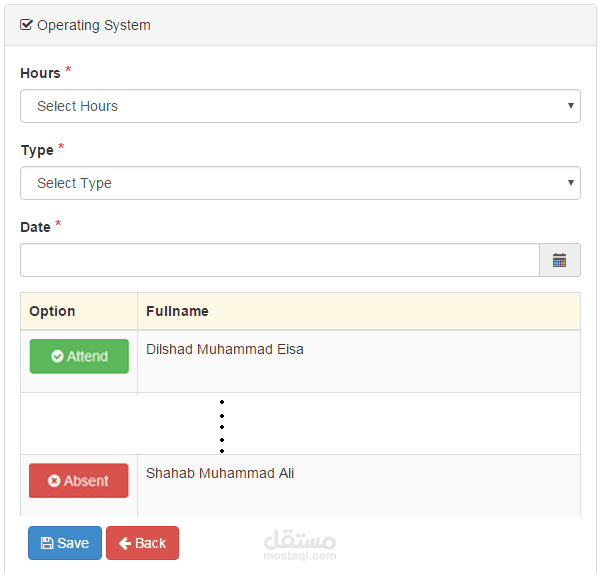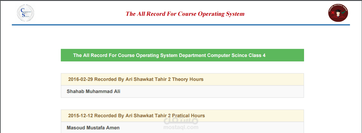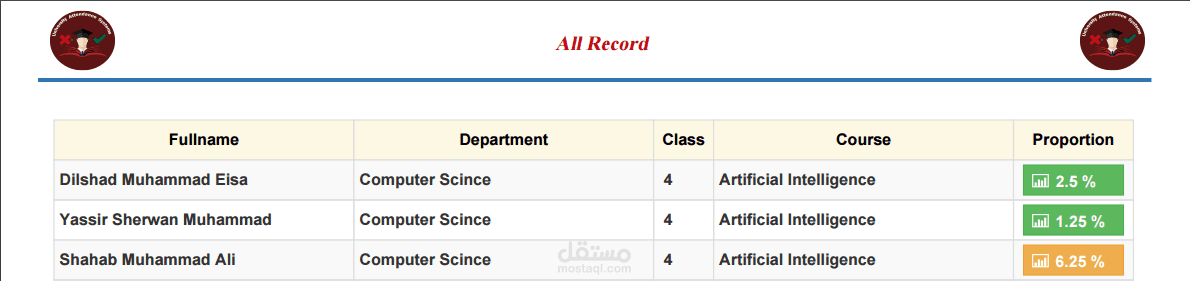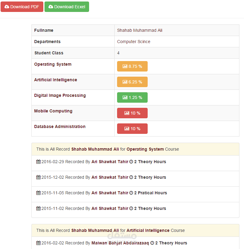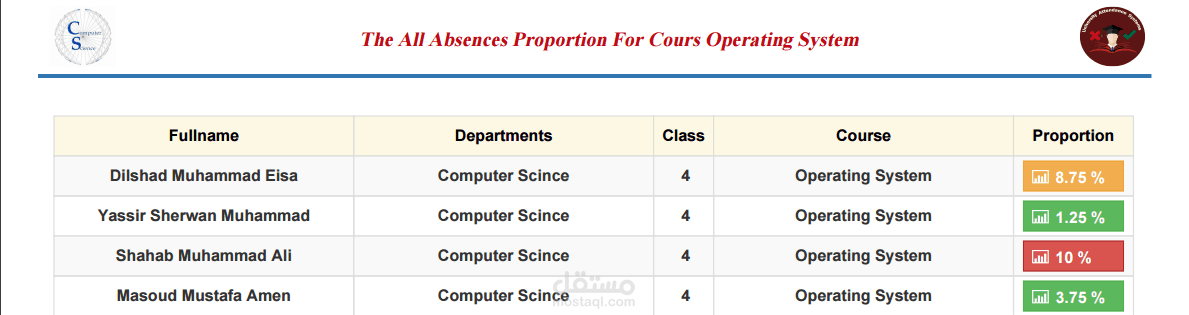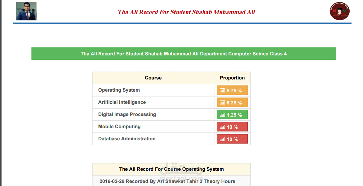 The system is designed in a way that can differentiate the hours of theoretical and practical lessons, since the rate of them is different for calculating the percentages of the students’ absence. Insertions, deletions and modifications of data in the system can be accomplished straightforward via the designed GUI without interacting with the tables. Different presentation of information is obtainable from the system.