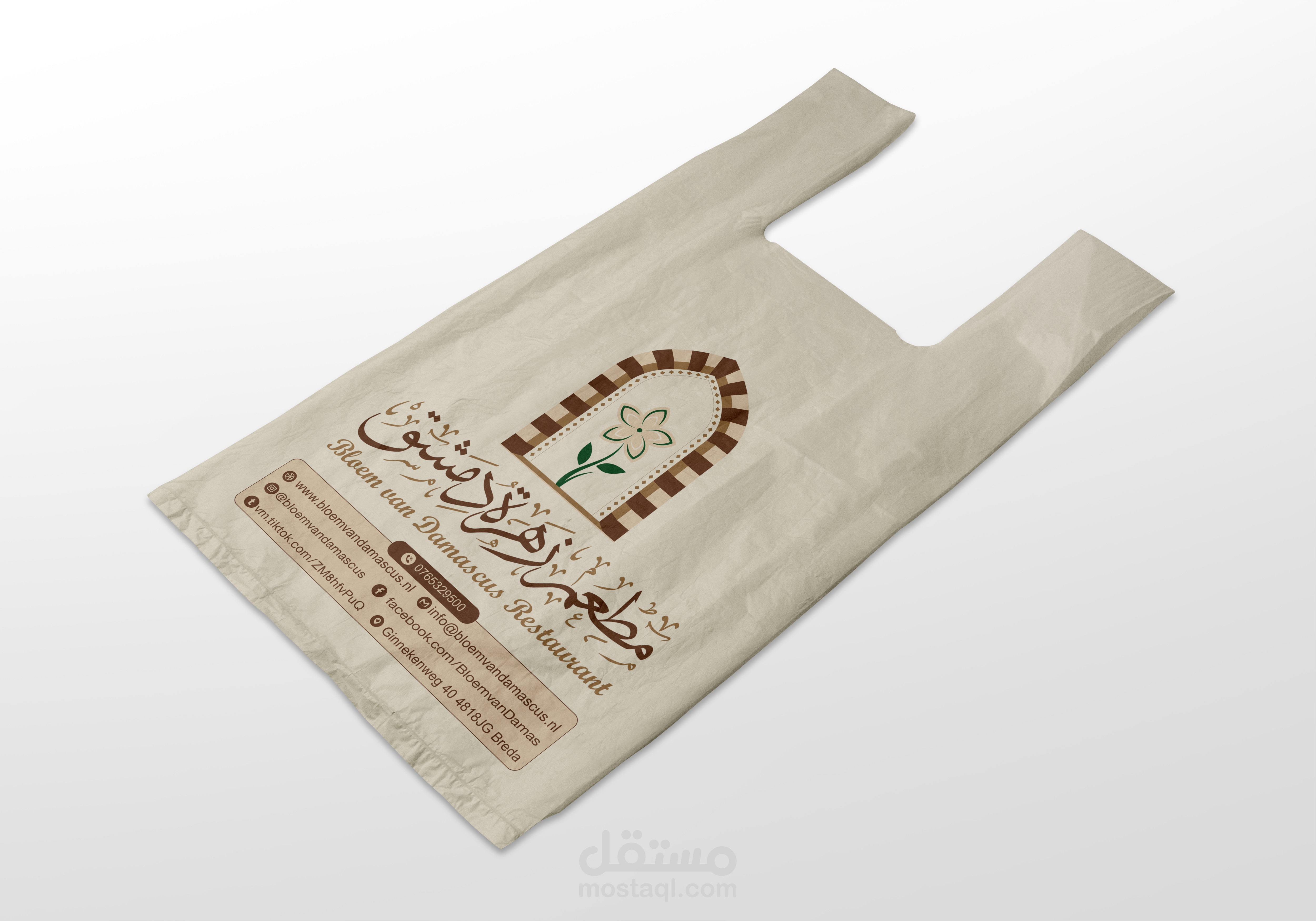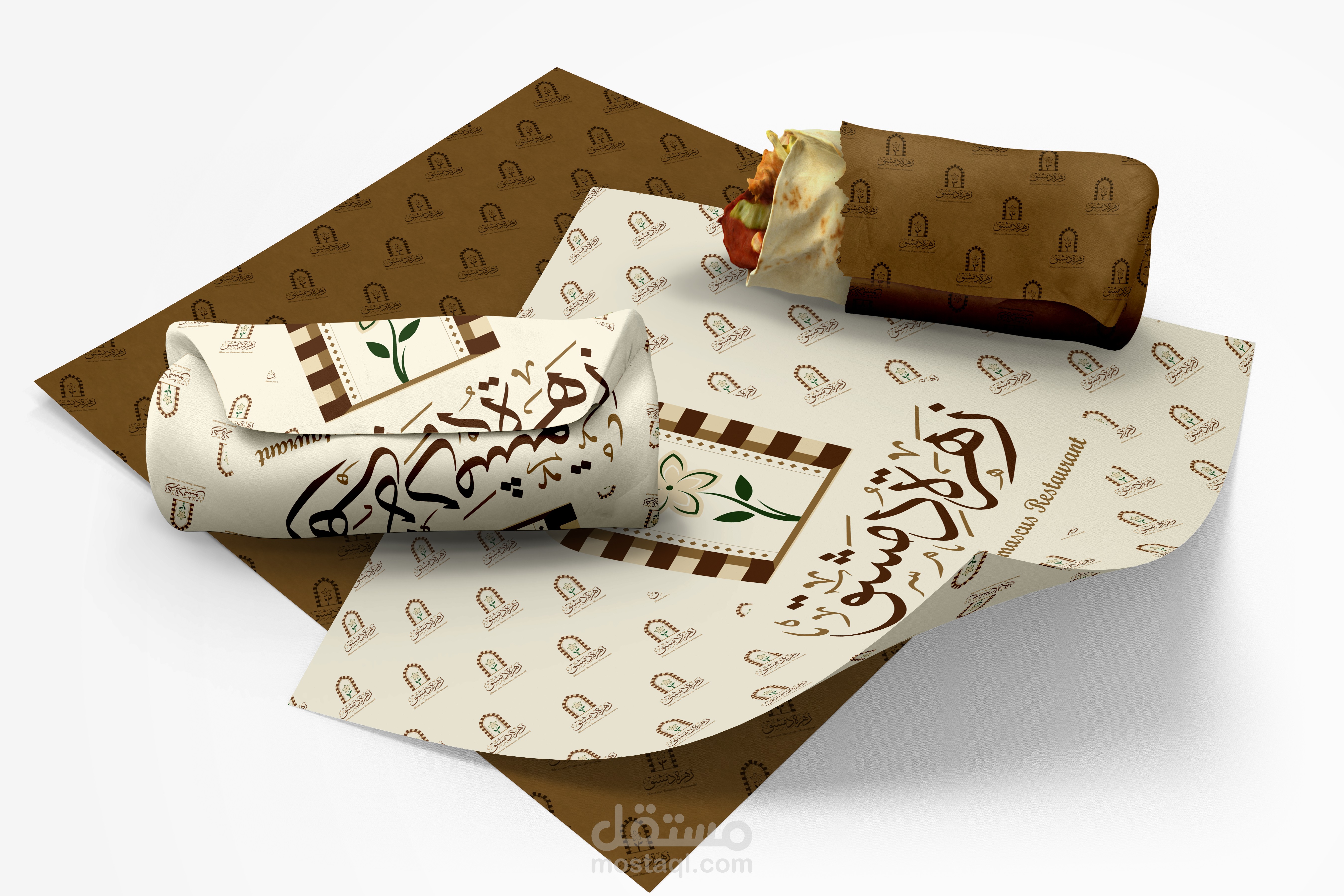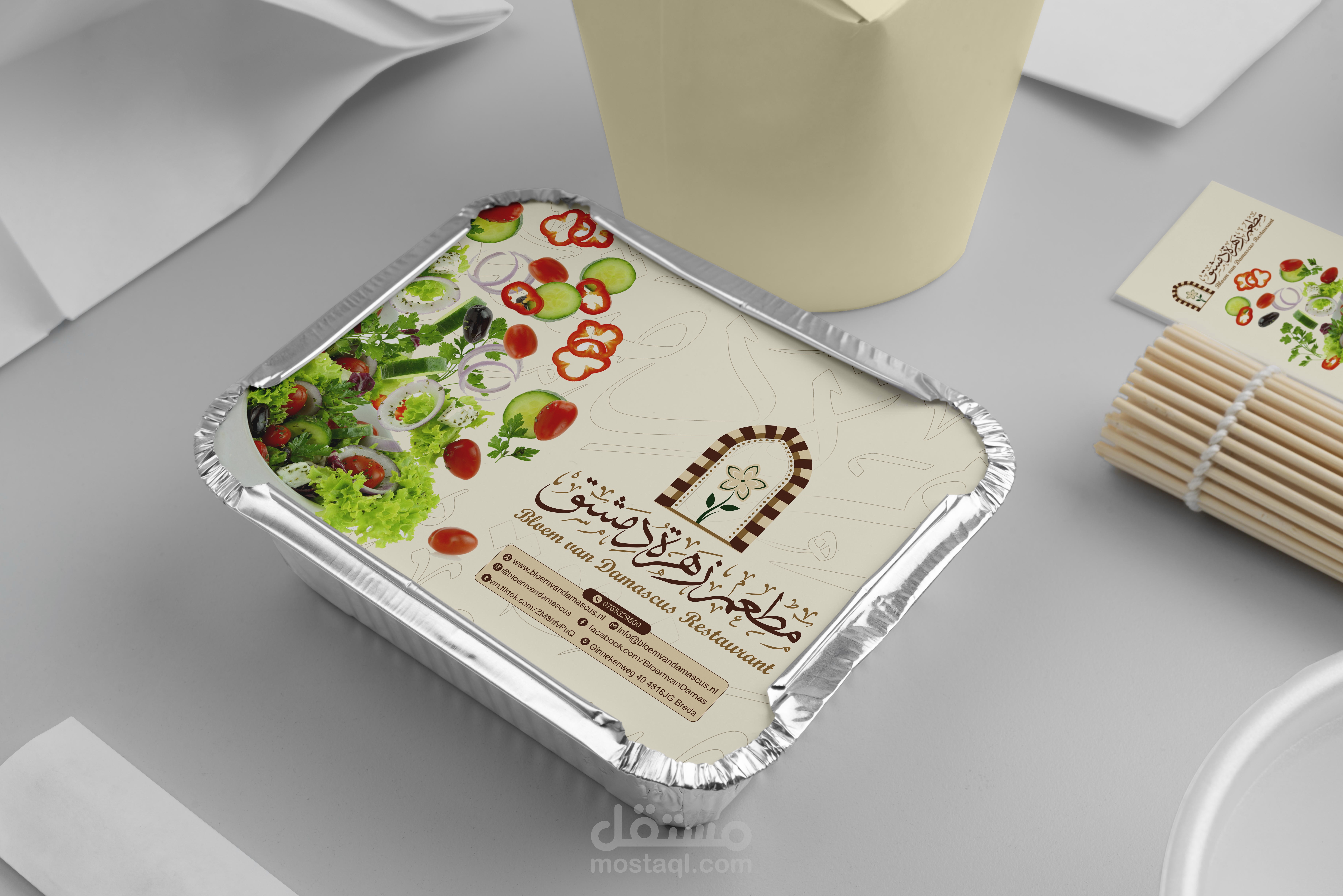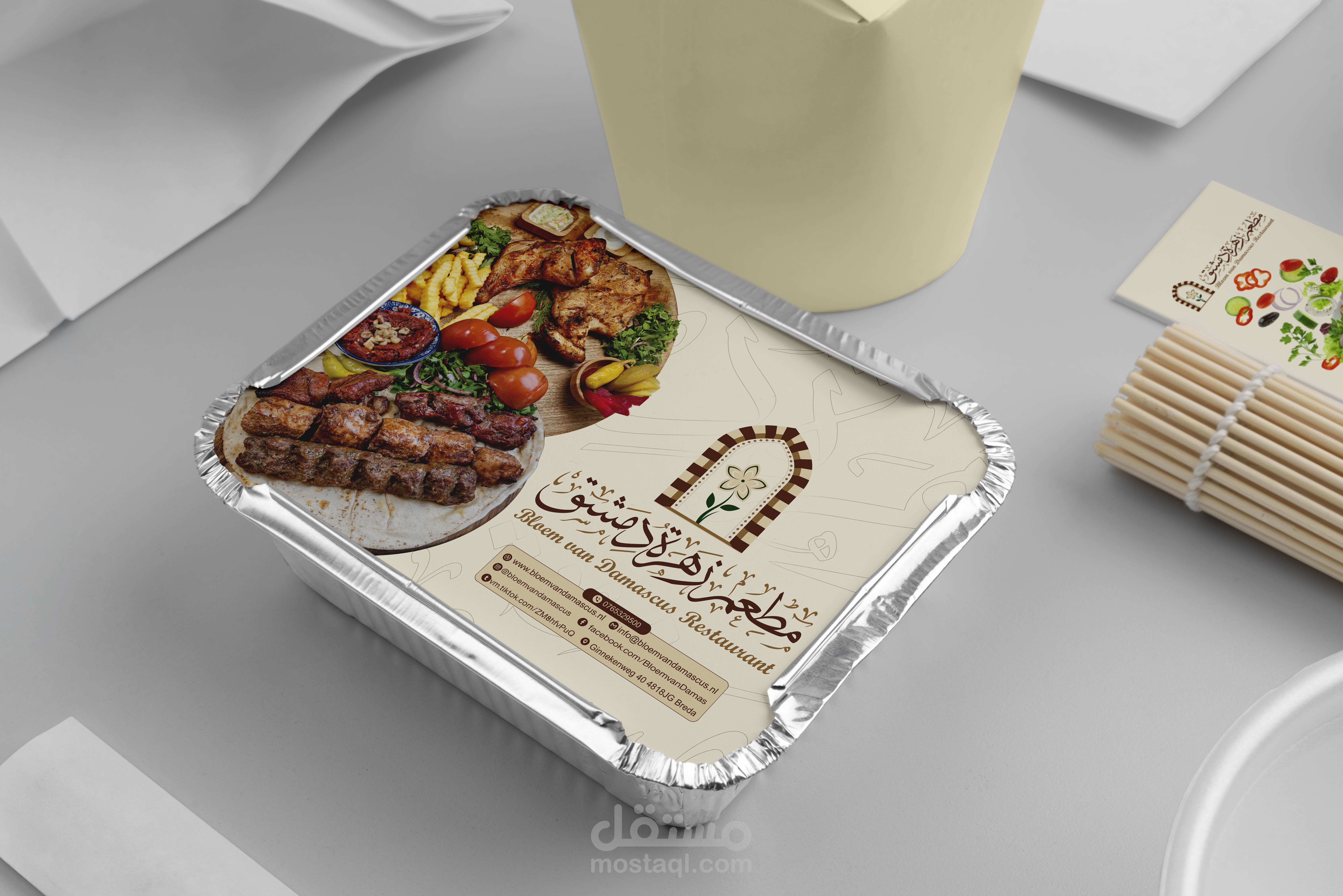 هوية بصرية متكاملة لمطعم يمثل الهوية السورية وبالاخص الهوية الدمشقية ويجسدها عبر تصاميم تحاكي التراث الدمشقي والممزوج بعطر الياسمين الدمشقي