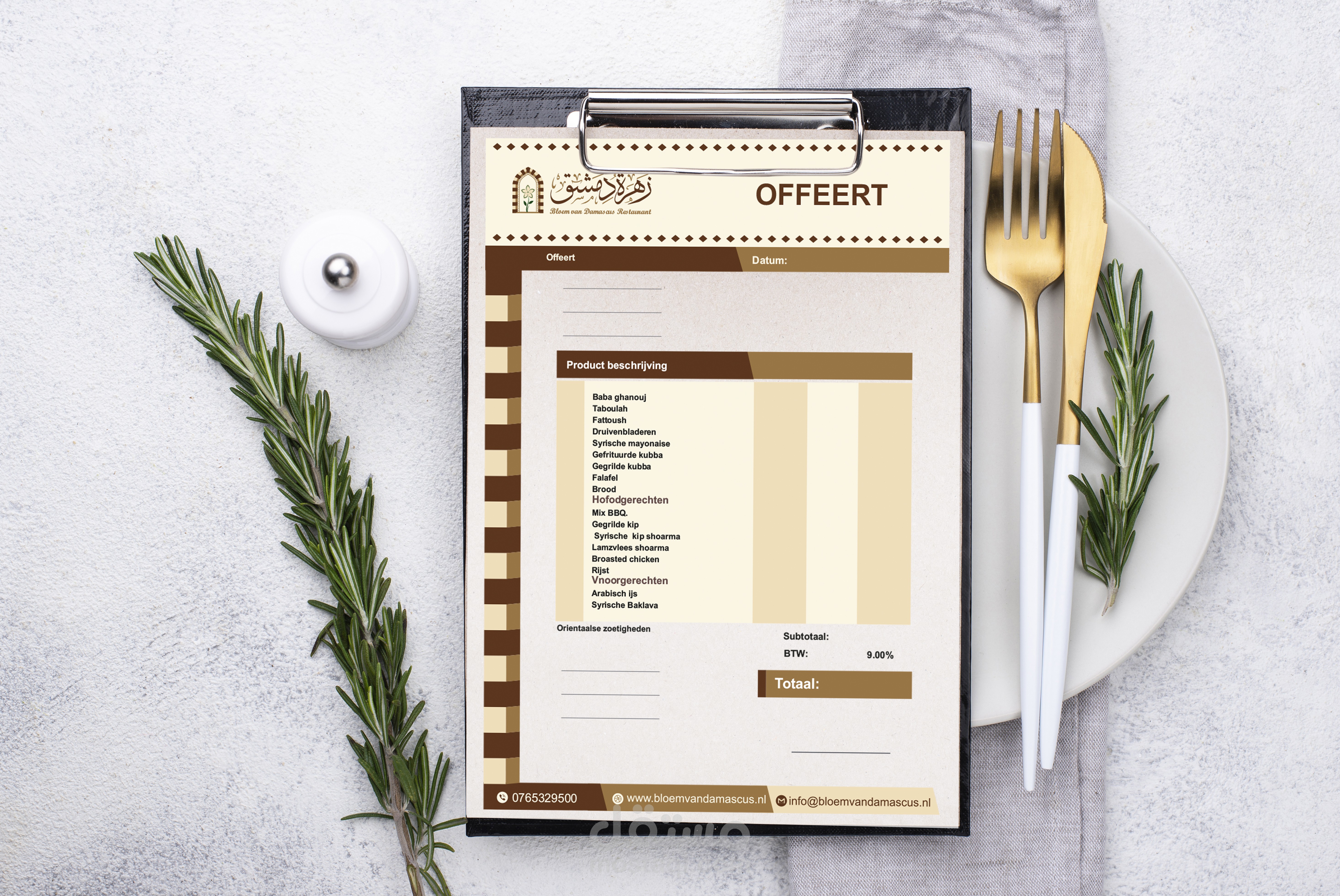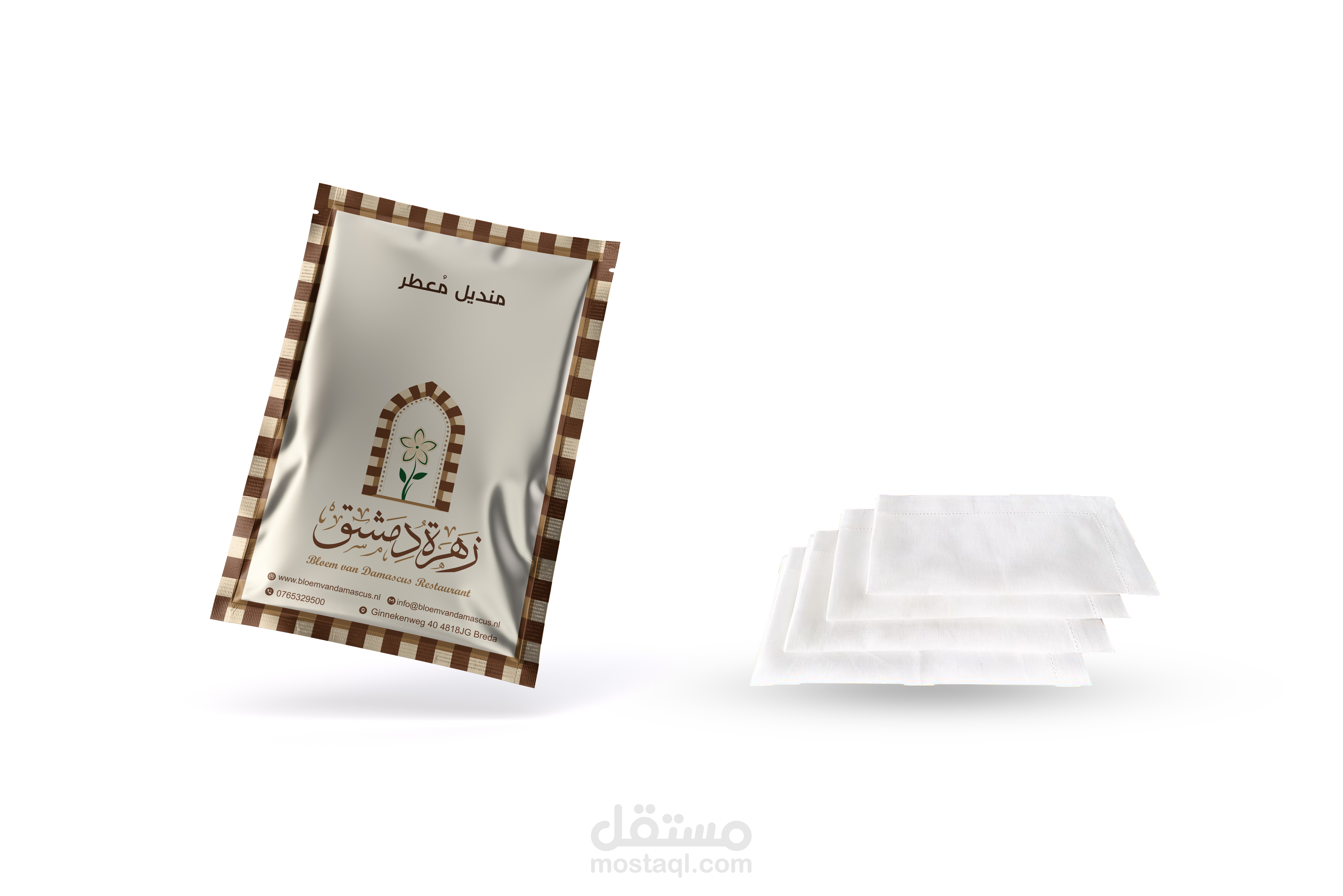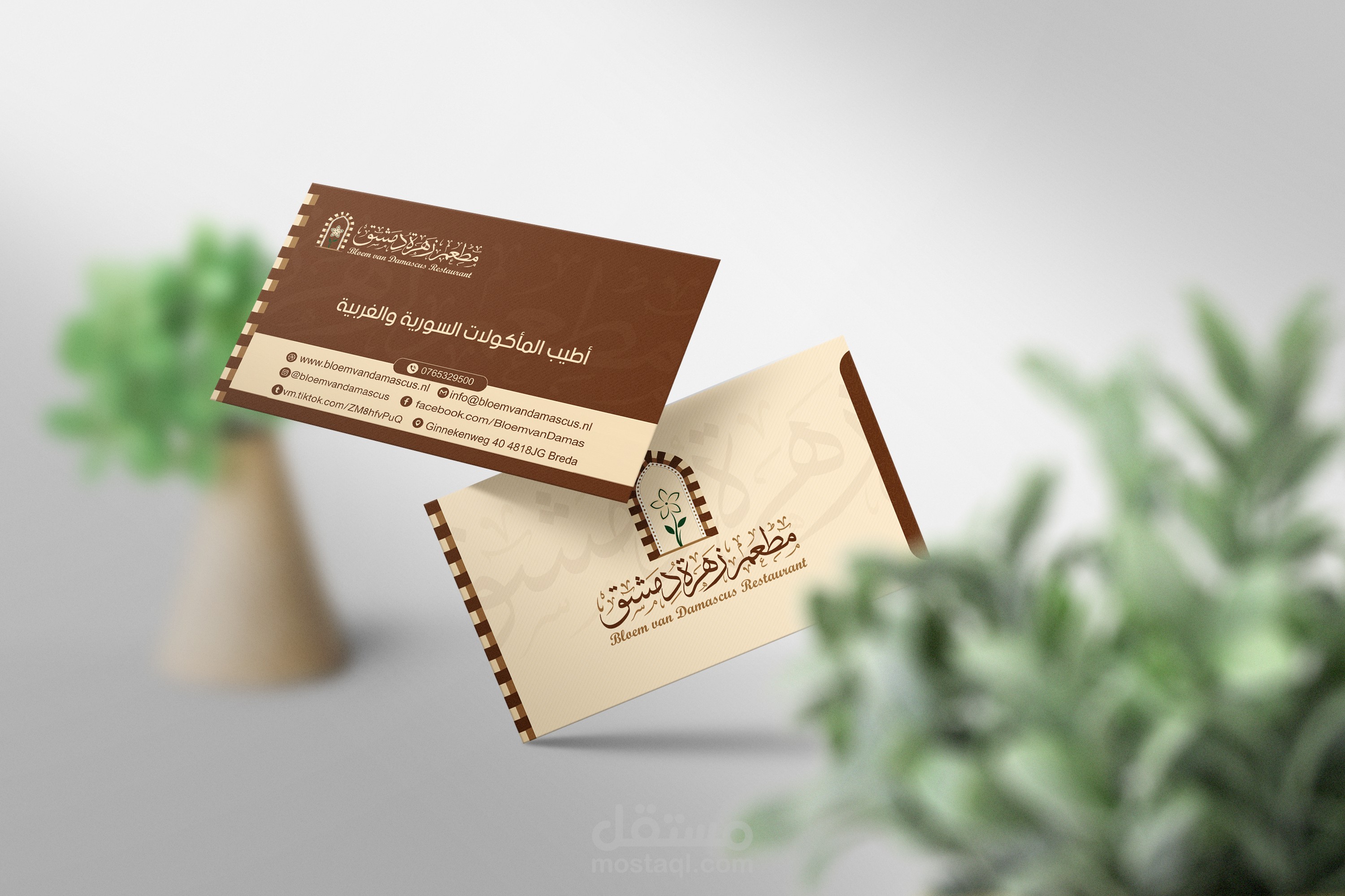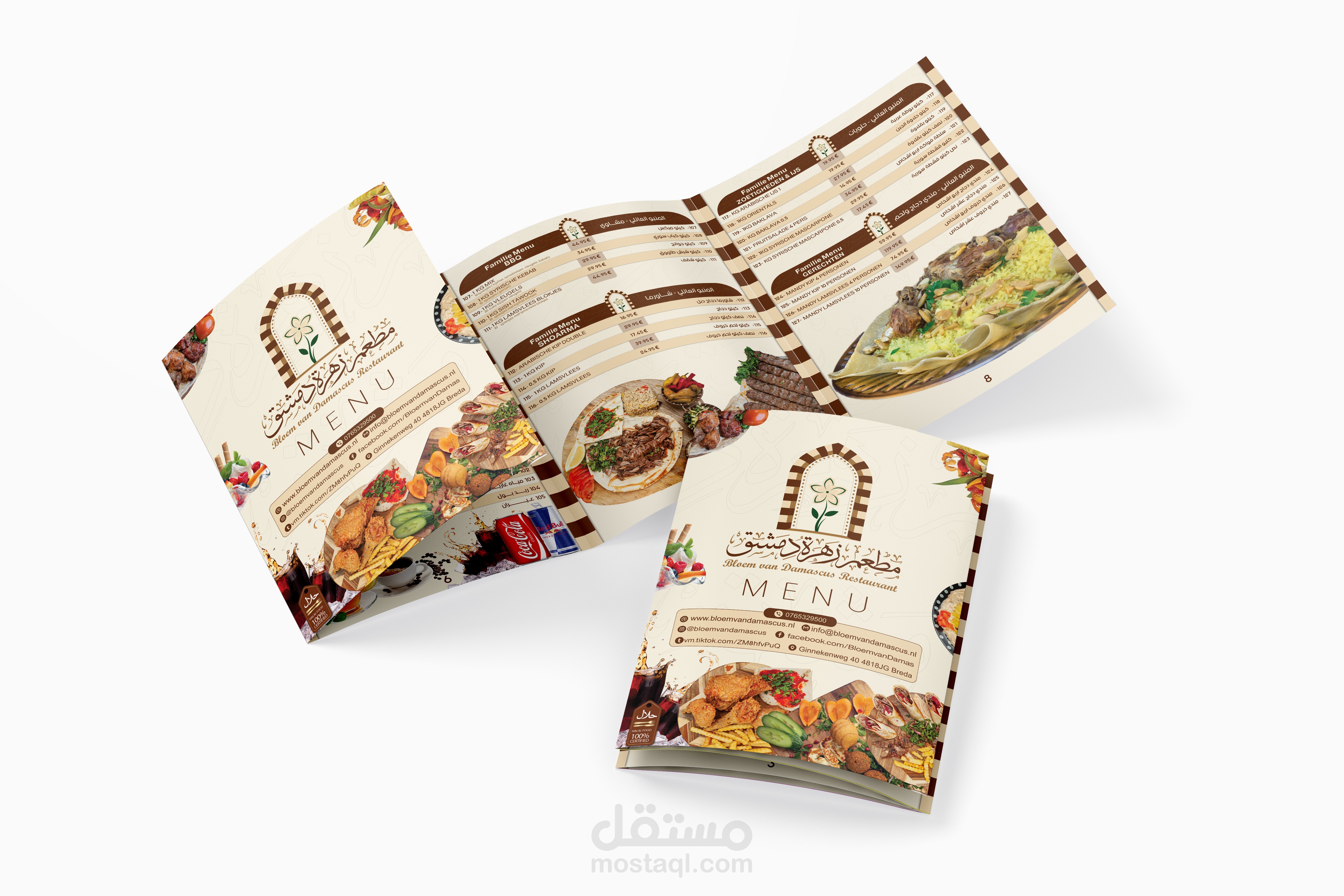 هوية بصرية متكاملة لمطعم يمثل الهوية السورية وبالاخص الهوية الدمشقية ويجسدها عبر تصاميم تحاكي التراث الدمشقي والممزوج بعطر الياسمين الدمشقي