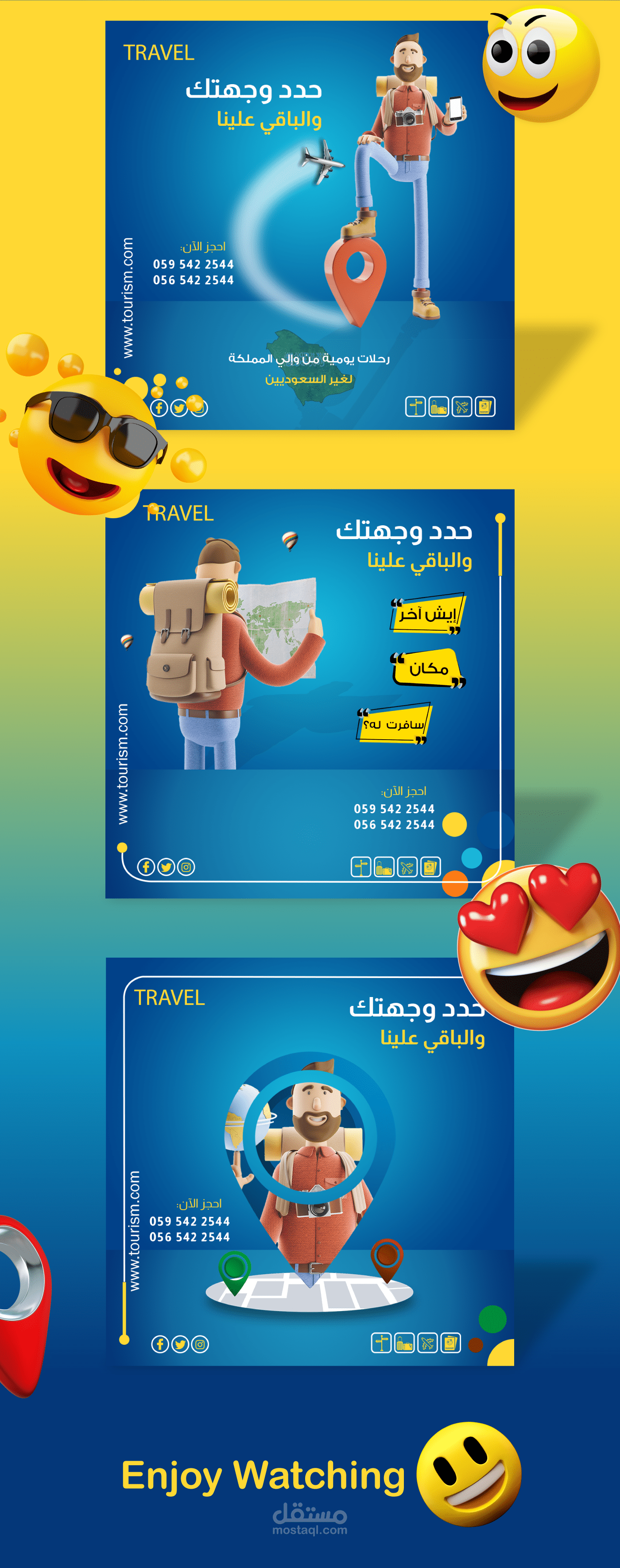 تصاميم سوشيال ميديا لشركة Travel مصممة باستخدام Adobe Photoshop و Adobe Illustrator