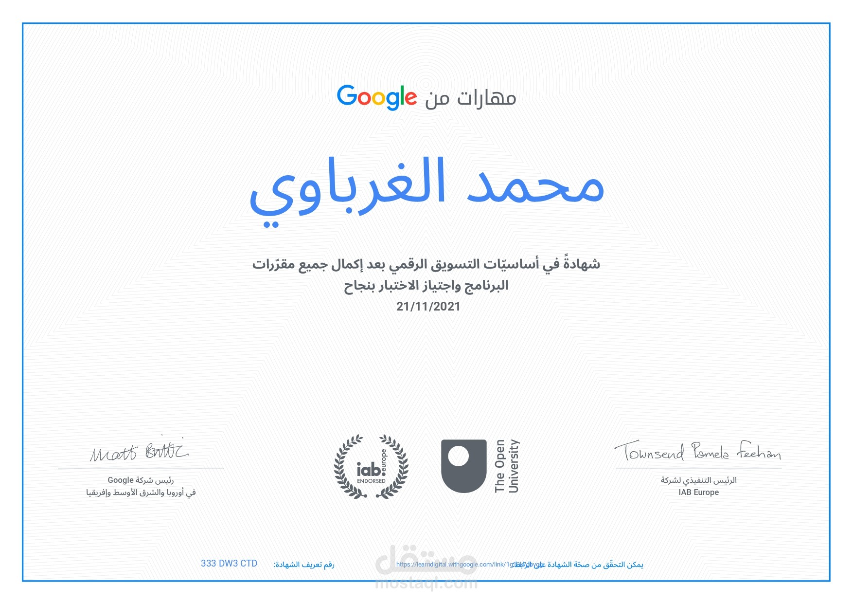 شهادة مهارات من جوجل في اساسيات التسويق الرقمي