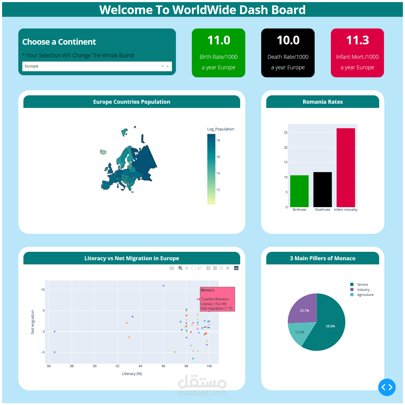 داش بورد تفاعلية تعرض كل الاحصائيات الخاصة بالقارات والدول حول العالم مثل: معدل المواليد، معدل الوفيات، نسبة الزراعة والصناعة والخدمات ومعدلات الهجرة .. إلخ، وذلك عن طريق اختيار القارة أو الوقوف على دولة معينة على خريطة العالم