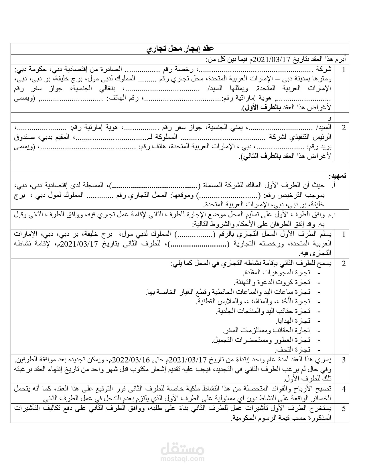 العمل المرفق هو عقد إيجار محل تجاري بين طرفين بمول دبي. يتكون من 14 فقرة شاملة لكل شروط الإجارة بما في ذلك فض النزاعات.