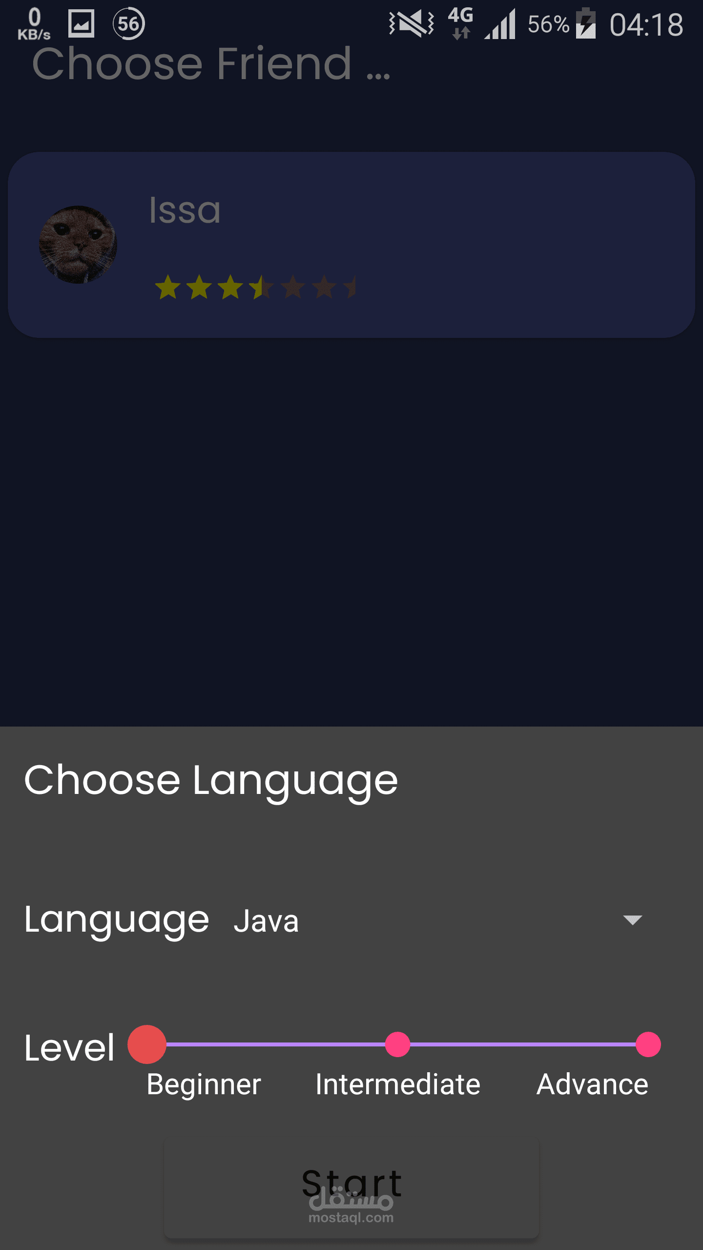 وعند طرح تحدي ضد صديق يتم اختياء اللغة و المستوى المراد انشاء التحدي فيهم بعدا ذلك يتم جلب 4 أسئلة عشوائية من خزينة الاسئلة الموجودة في قاعدة البيانات وعند الانتهاء من الاجابة على الاسئلة يتم ارسال اشعار للشخص الاخر ( الصديق) ويتم تخزين هذا الاختبار في قاعدة البيانات وتخضع هذه الاختبارات لاربع حالات ضمن القاعدة وهي