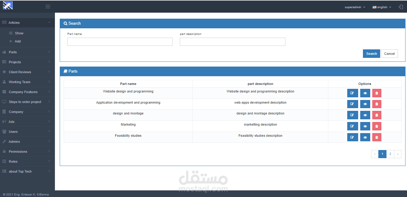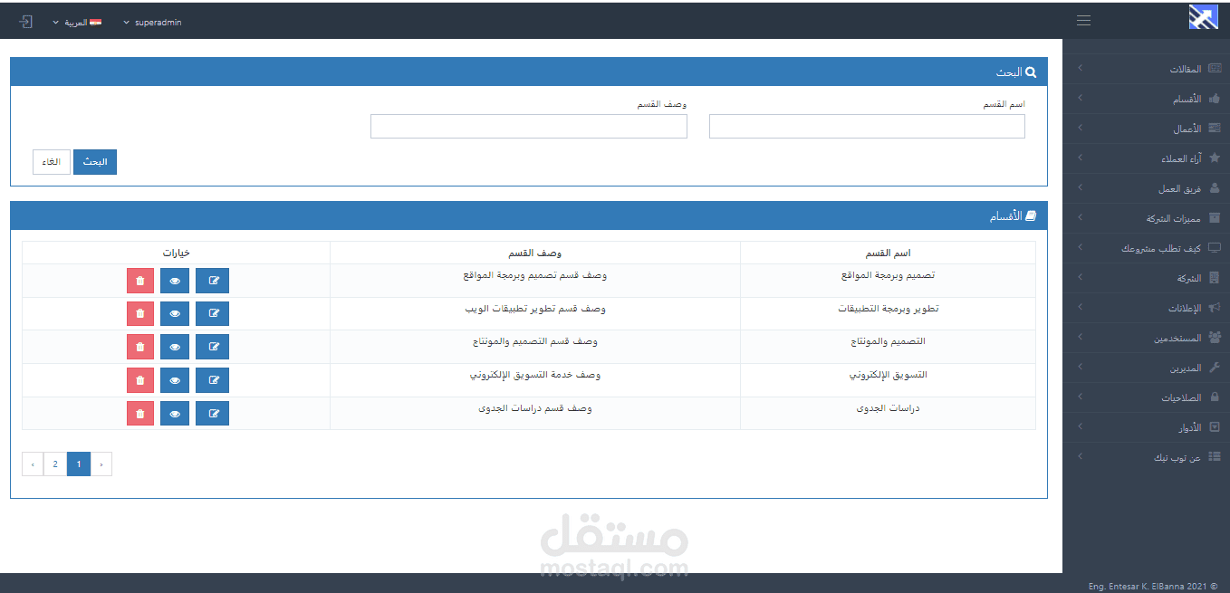 يمكن للأدمن التحكم في جميع بيانات الشركة، الظاهرة في صفحات الموقع الخارجية من خلال لوحة تحكم متكاملة، كما يمكن للأدمن التحكم في صلاحيات المدراء الآخرين.
