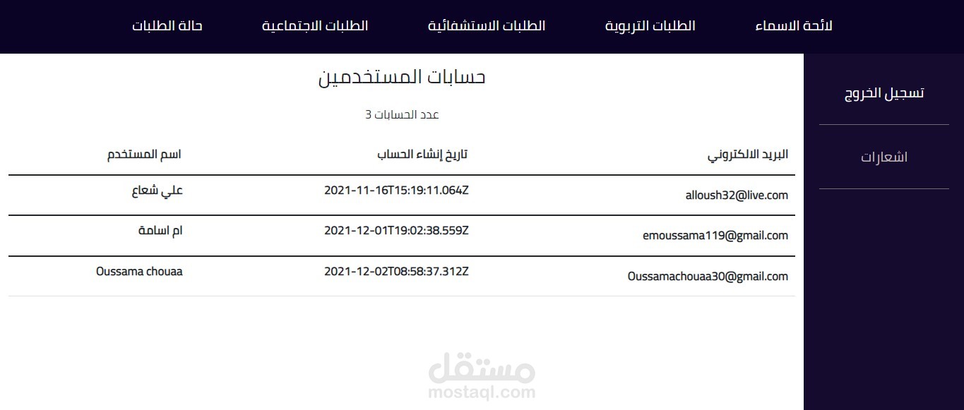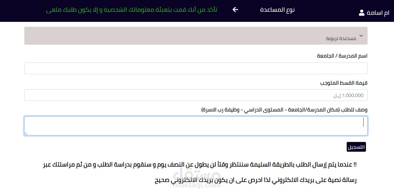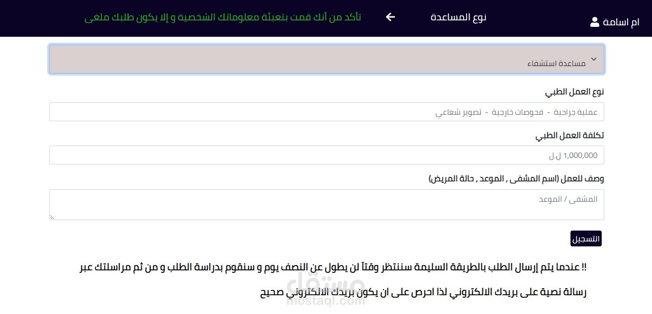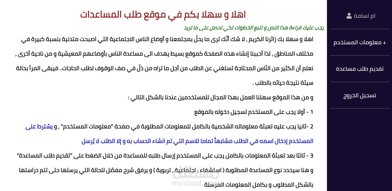 صفحة بفكرة وهمية اخترتها للتجربة , وهي بمثال جمعية خيرية تريد تقديم المساعدات للمحتاجين دون قدومهم الى مقر الجميعة و الوقوف عند عتباتها , و من خصائص الصفحة بأنه يستطيع المستخدم تقديم طلب مساعدة (استشفائية او تربوية او اجتماعية) و من ثمّ يوجد حساب للadmin يرى الطلبات جميعها و المستخدمين ببياناتهم كلها , و من ثم يوجد زر لقبول الطلب أو رفضه و من ثمّ تحوّ إلى صفحة الطلبات المرفوضة و المقبولة و هي صفحة متناسقة مع جميع الشاشات تقريبا..