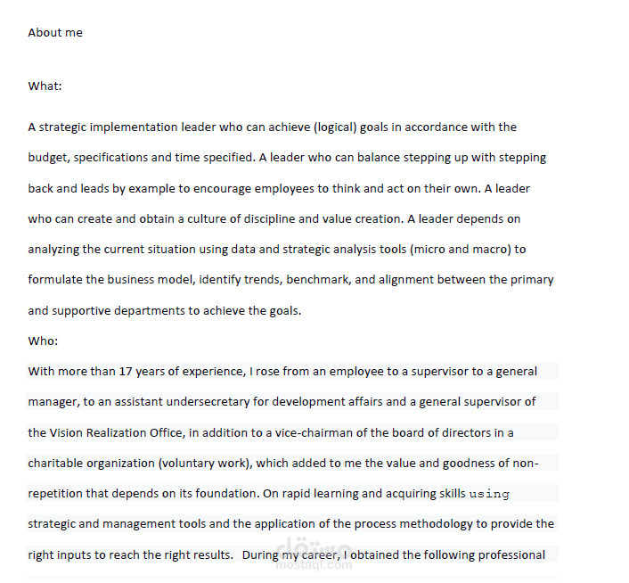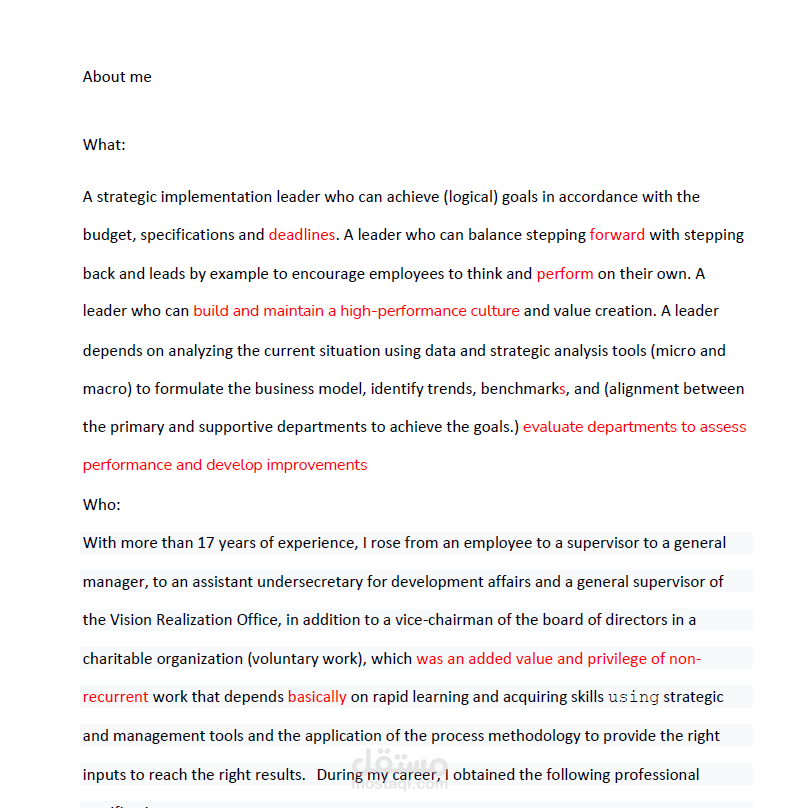 قمت بهذا العمل بإعادة صياغة بعض العبارات في سيرة ذاتية و تدقيق لوغي وقواعدي في اللغة الإنجليزية.