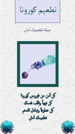 تم تصميم بوستر توعوي حول فيروس كورونا بألوان مناسبة جذابة متناسقة مشجعة على القراءة تم ارفاق صورة في اطار متناسقين مع بعضهما البعض في منتصف التصميم يعلوها العنوان في مربع يدعو للتطيعم بخط ملفت وعصري مناسب في الأسفل الجملة التوعية وعلى جانبيها أيقونتي فيروس كورونا بحجم مناسب صغير، تم مراعاة تناسق جميع عناصر البوستر ليكونوا وحدة واحدة ملفتة للمستهدفين بالقراءة تم الأخذ بعين الاعتبار الألوان وأنواع الخطوط وأحجامها وأماكن العناصر داخل البوستر وأحجامها.