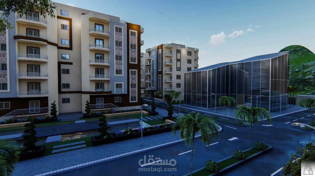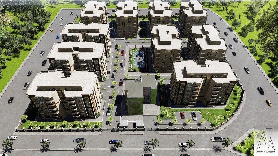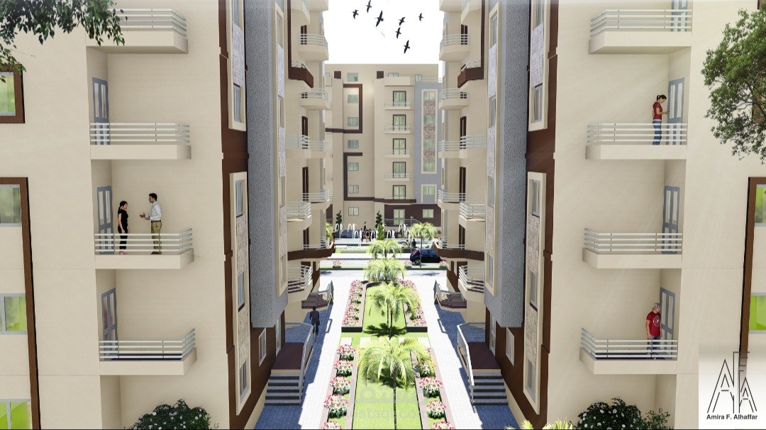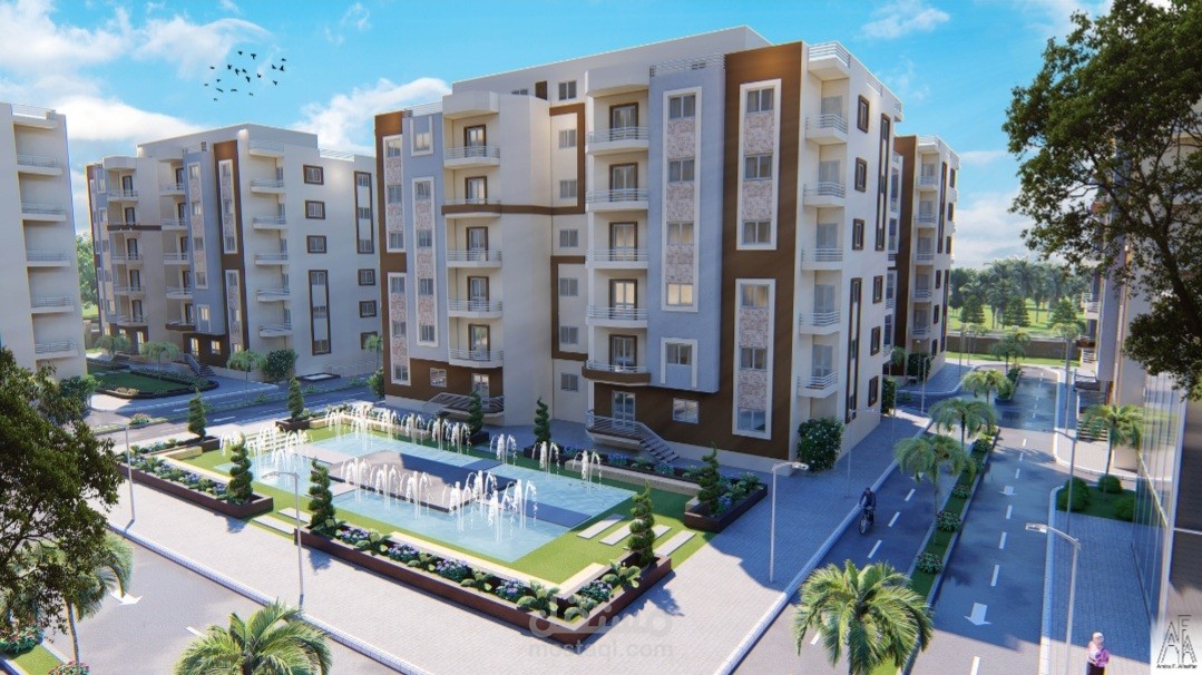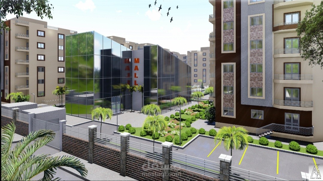 المشروع عبارة عن ٢٠ عمارة سكنية كل عمارة عبارة عن دور ارضي و٥ ادوار متكرر وروف والكمباوند يحتوي على مول تجاري وخدمات خاصة به ولاندسكيب