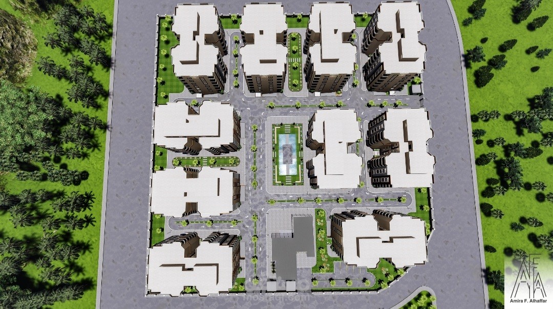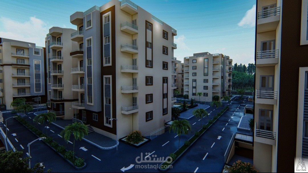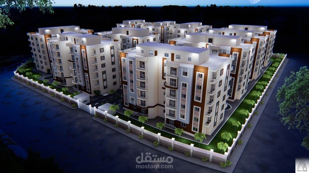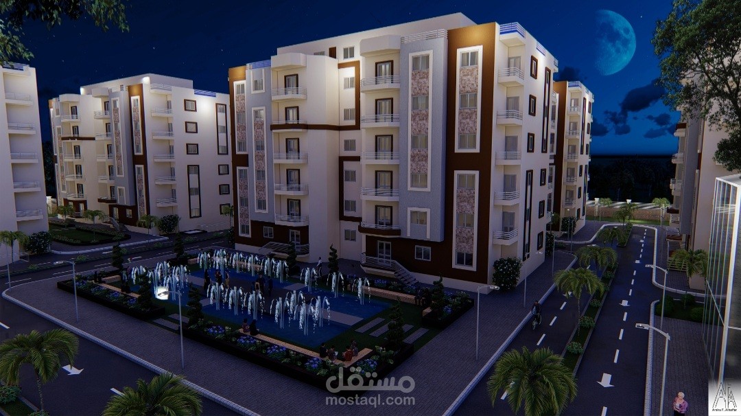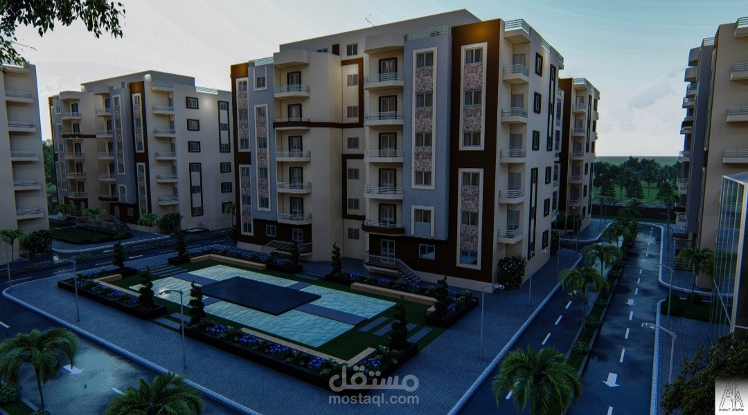 المشروع عبارة عن ٢٠ عمارة سكنية كل عمارة عبارة عن دور ارضي و٥ ادوار متكرر وروف والكمباوند يحتوي على مول تجاري وخدمات خاصة به ولاندسكيب