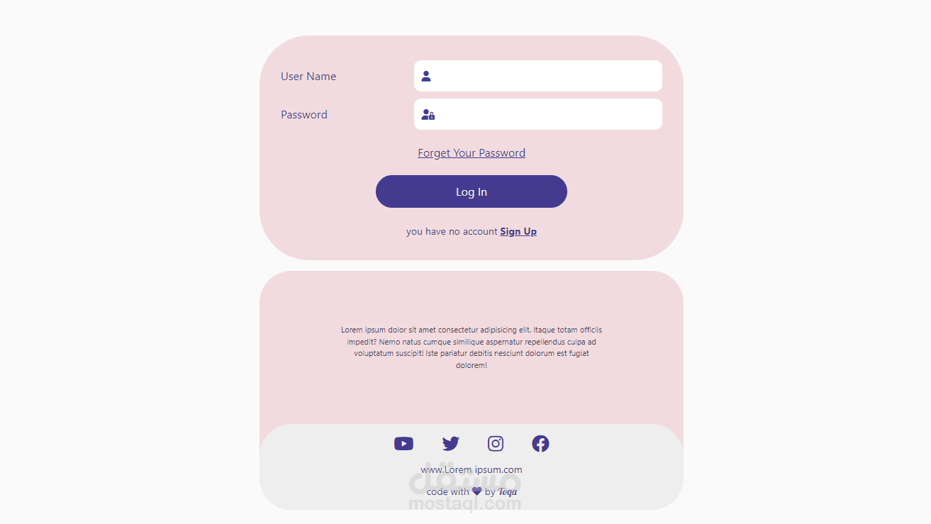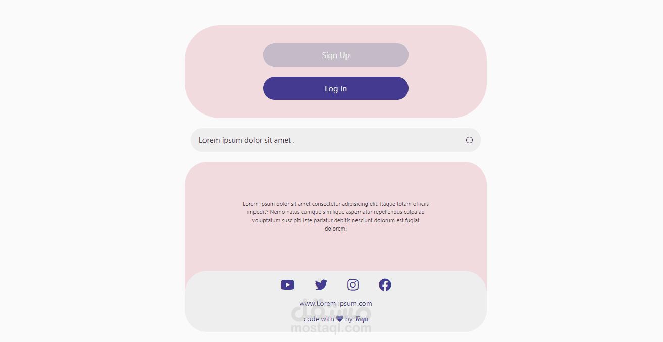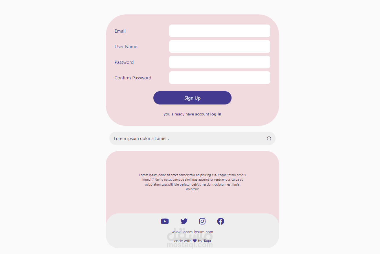 هذا العمل يتكوون من ثلاث صفحات صفحة تحديد تسجيل دخول ام التسجيل ف الموقع كعضو جديد و وصفحة تسجيل الدخول و صفحة التسجيل ف الموقع كعضو جديد (sign up - log in )ز تم تنفيذهم وكتابه الكود بشكل responsiveلكى تناسب جميع مقاسات الشاشات