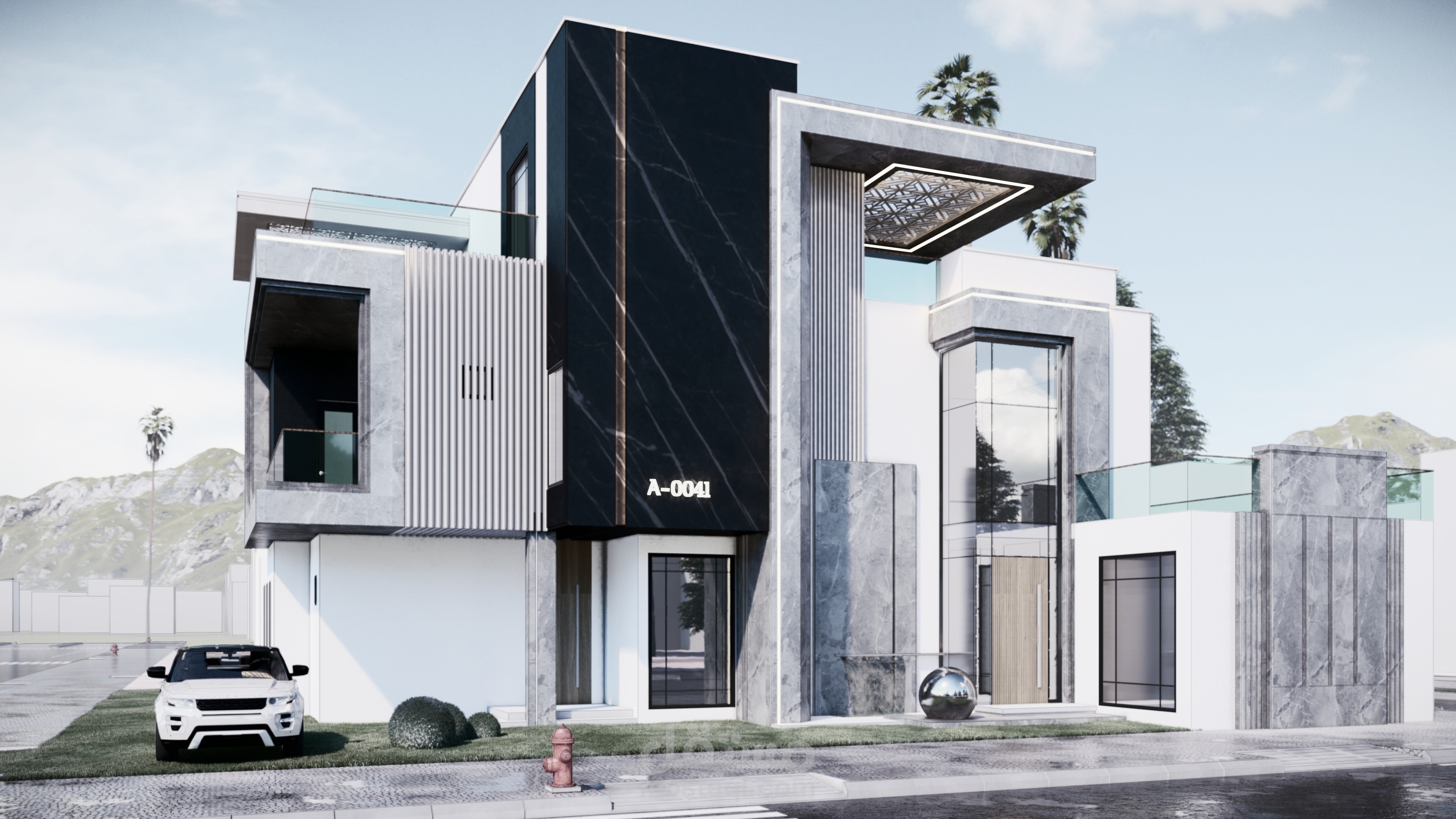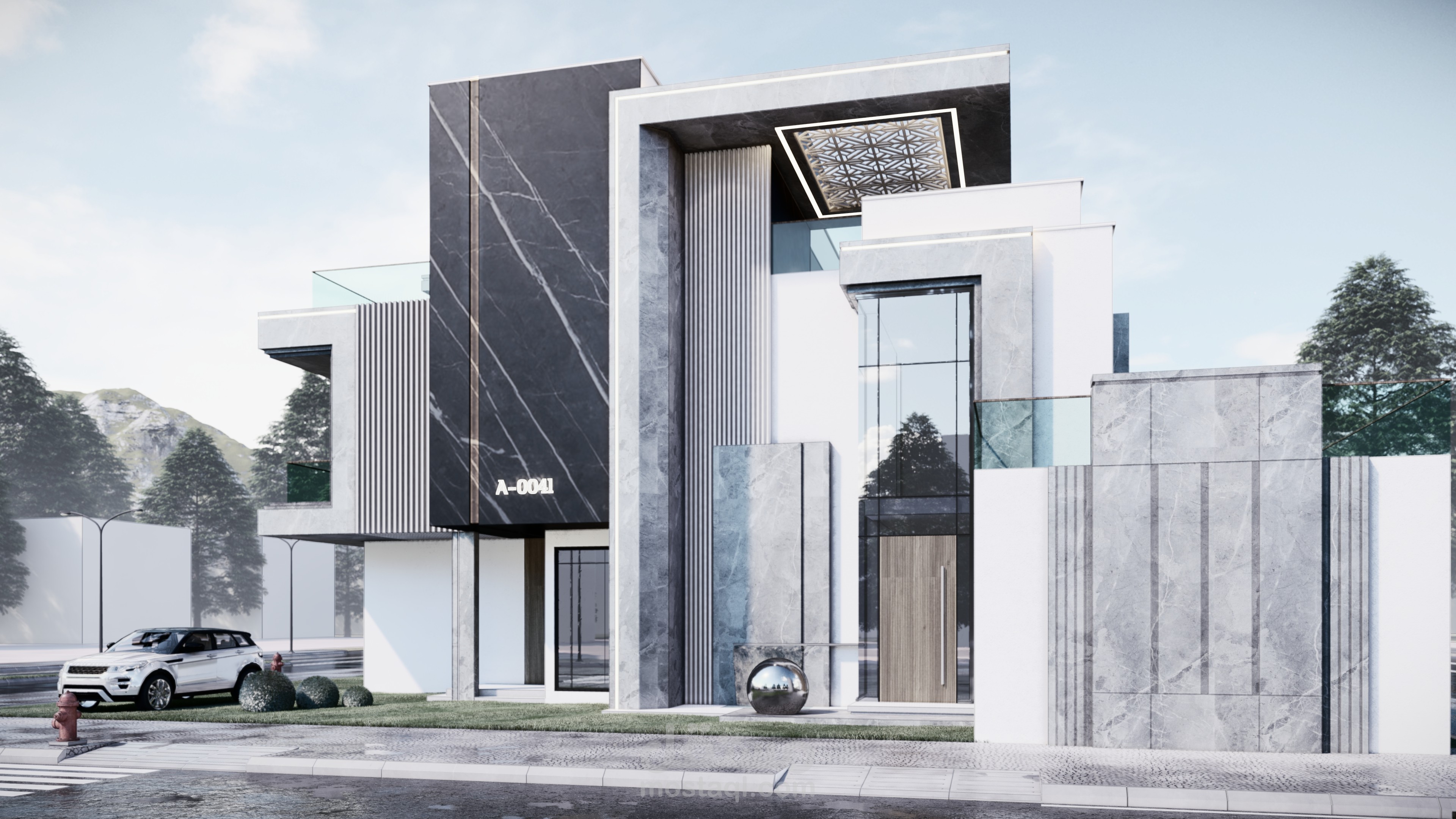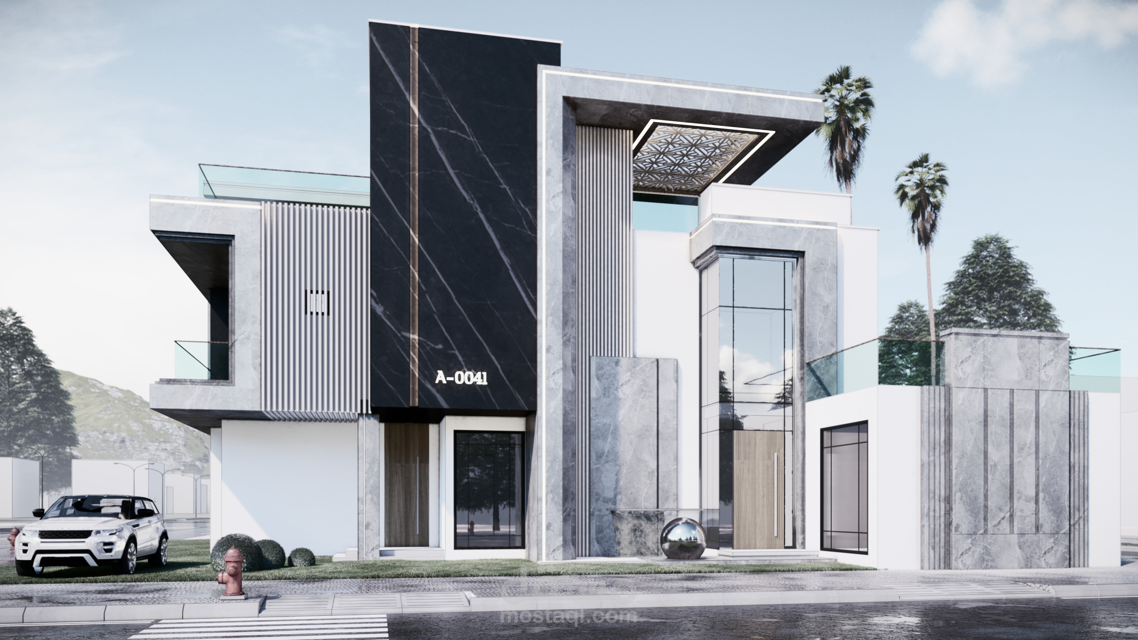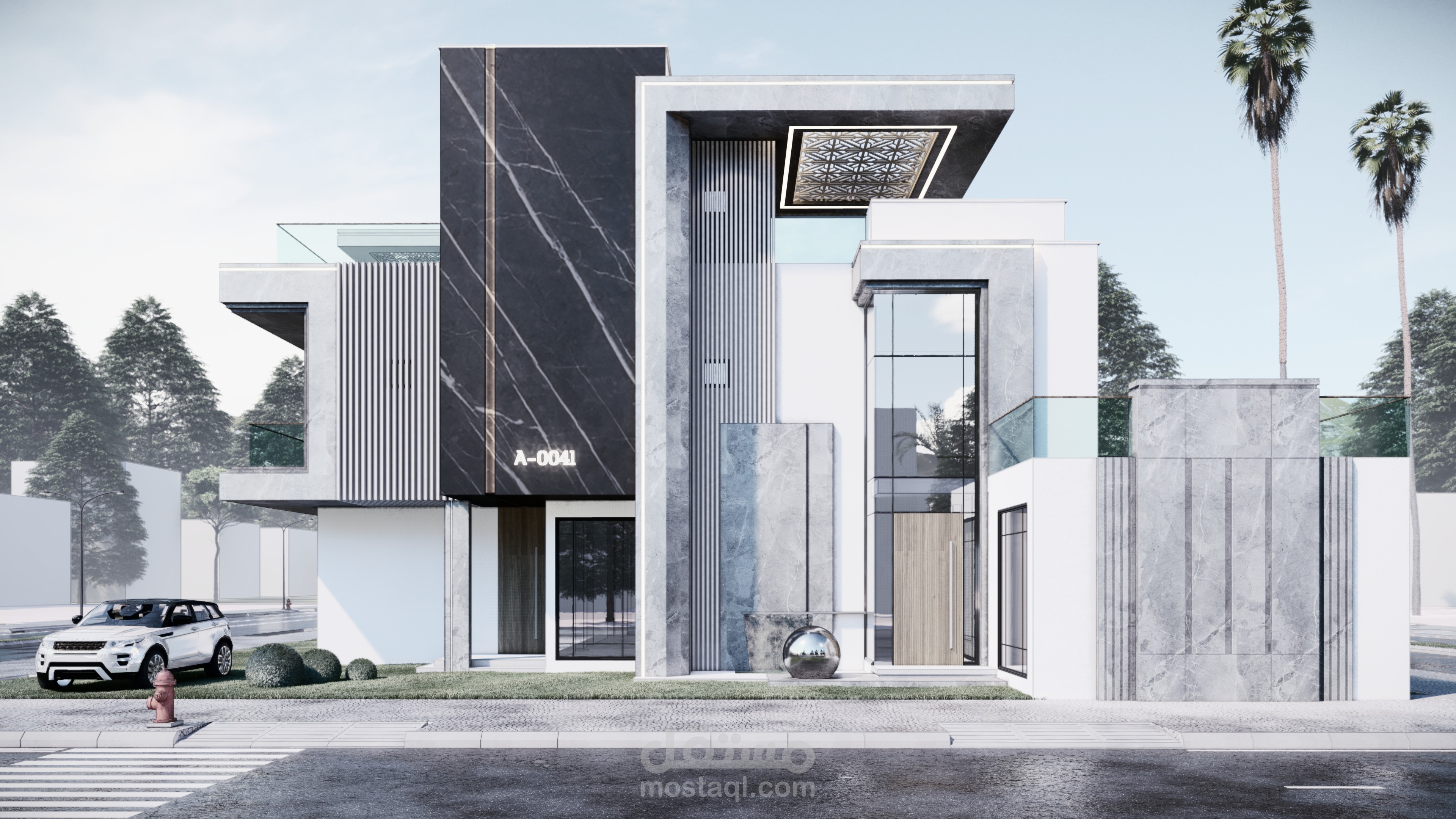 تصميم واجهة مودرن بابراز نسب الكتل والبروزات ولاعتماد عليهم في تصميم الواجهة وتحقيق مبادئ التصميم باختيار الخامات