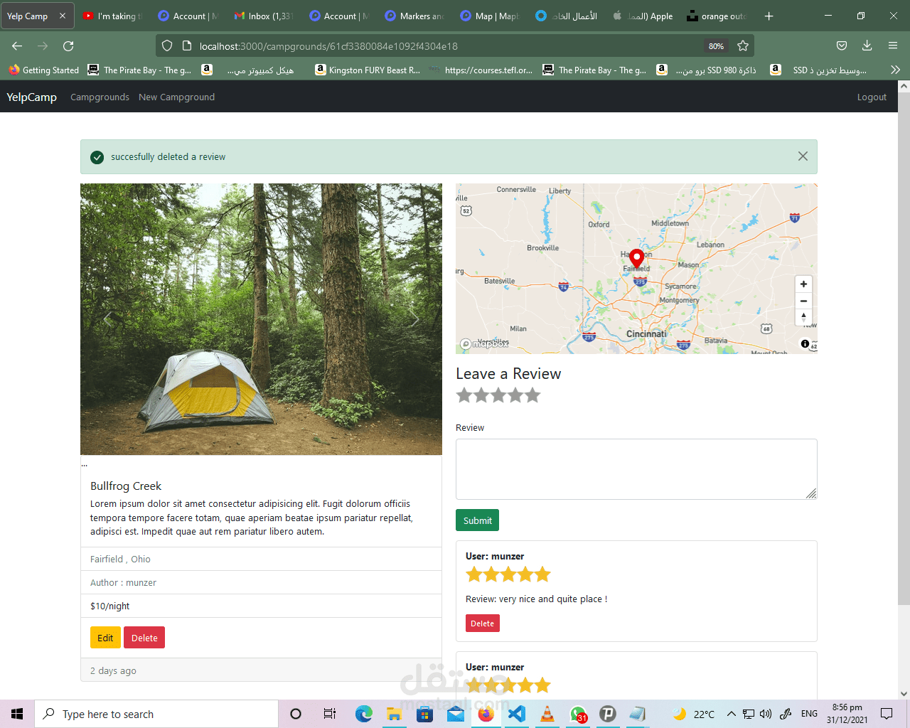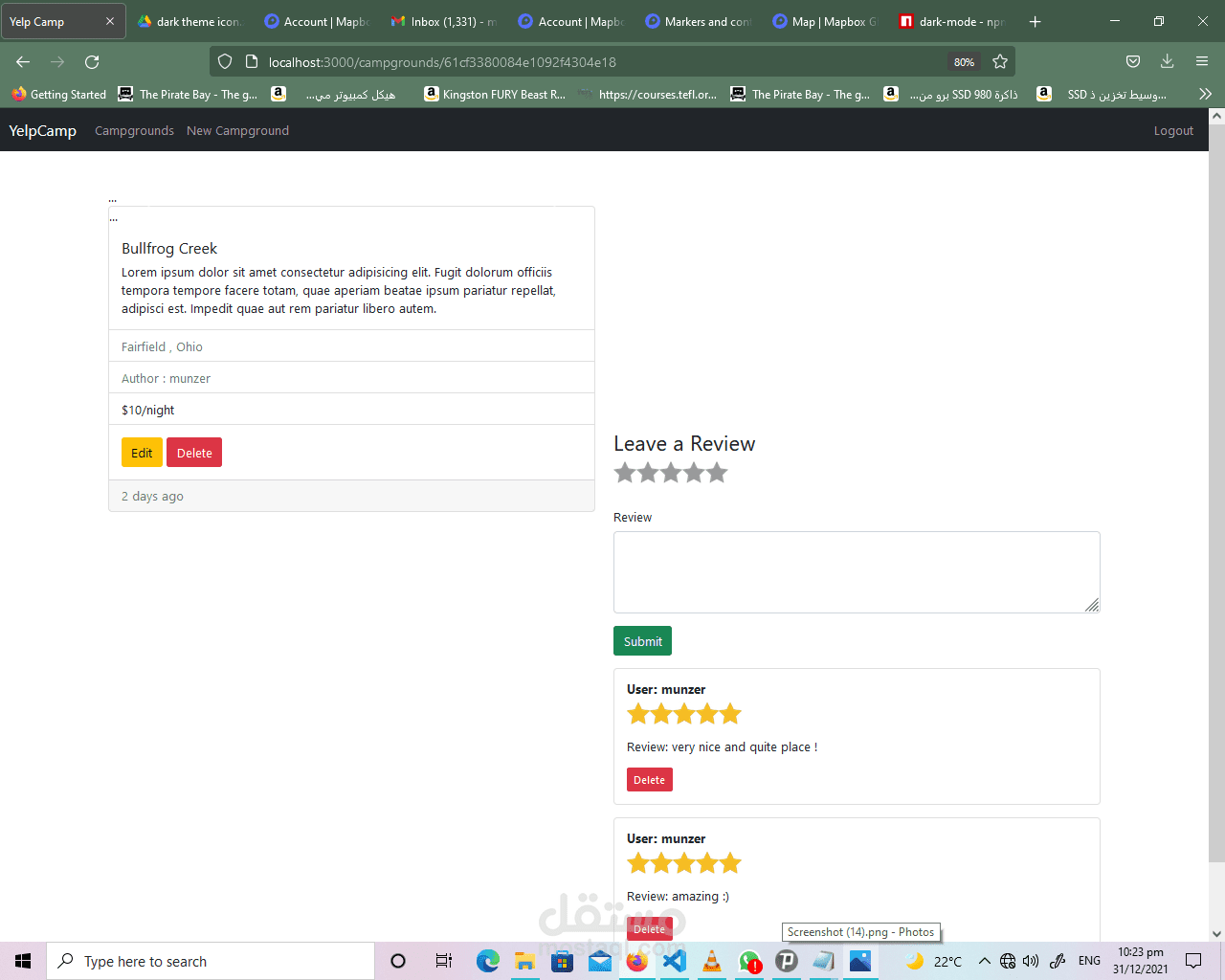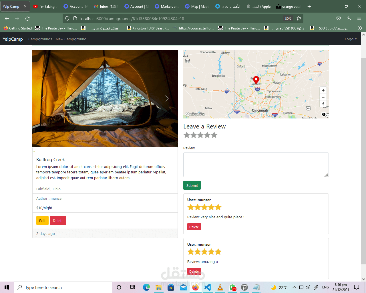 the website has a full database connected were you can register , login , and add campgrounds and reviews and they will all be saved to the database